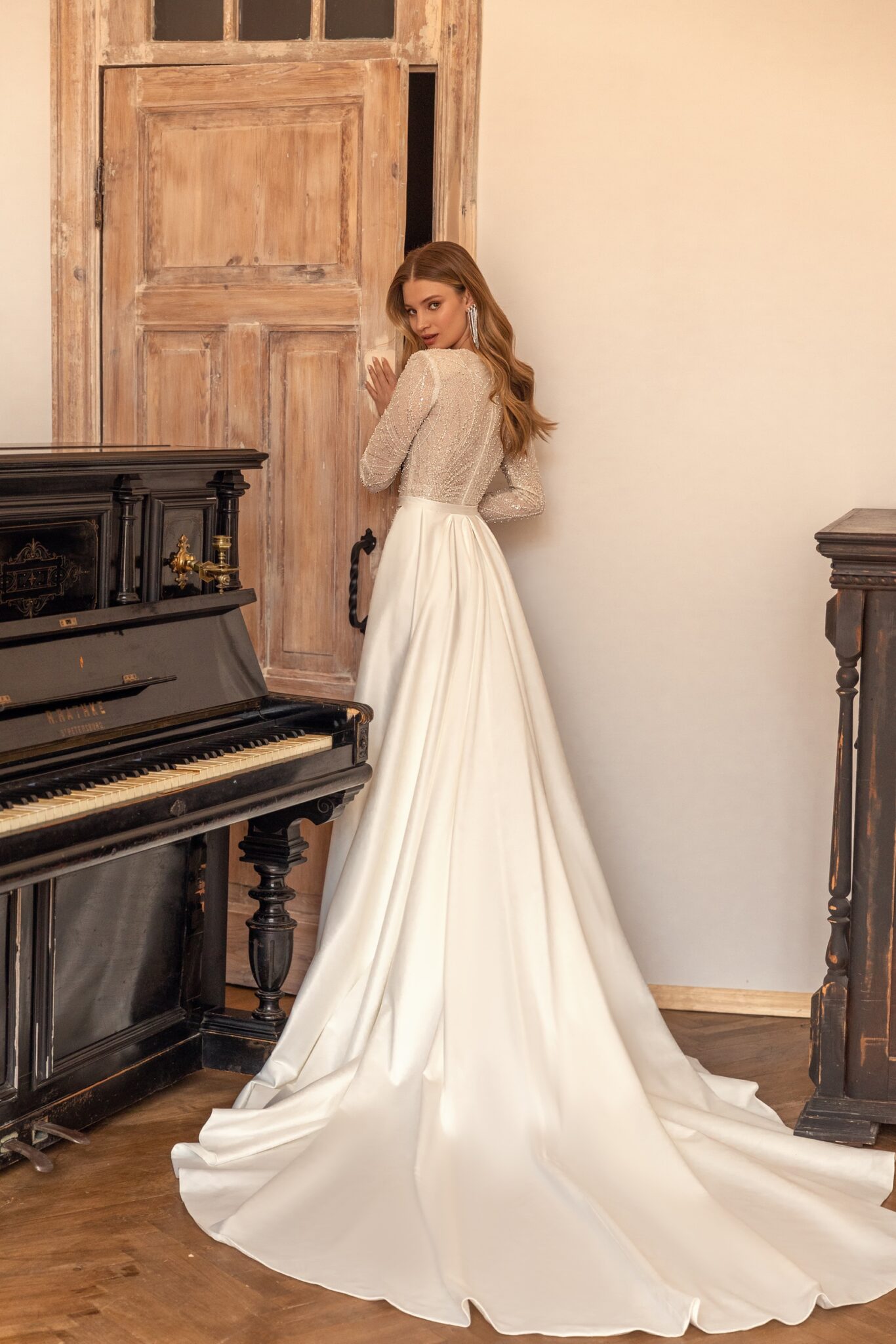 Less is more 2022Desiree is a fantastic transformer bridal gown. The sheath dress is made of embroiderd lace decorated with beads and sequins creating the cobweb pattern. The dress has a deep V-shaped neckline, long sleeves and the shoulder pads. The incredible satin overskirt is detachable and can be fastened on the waist decorated with a bow on the front. The detachable overskirt passes into a long train.