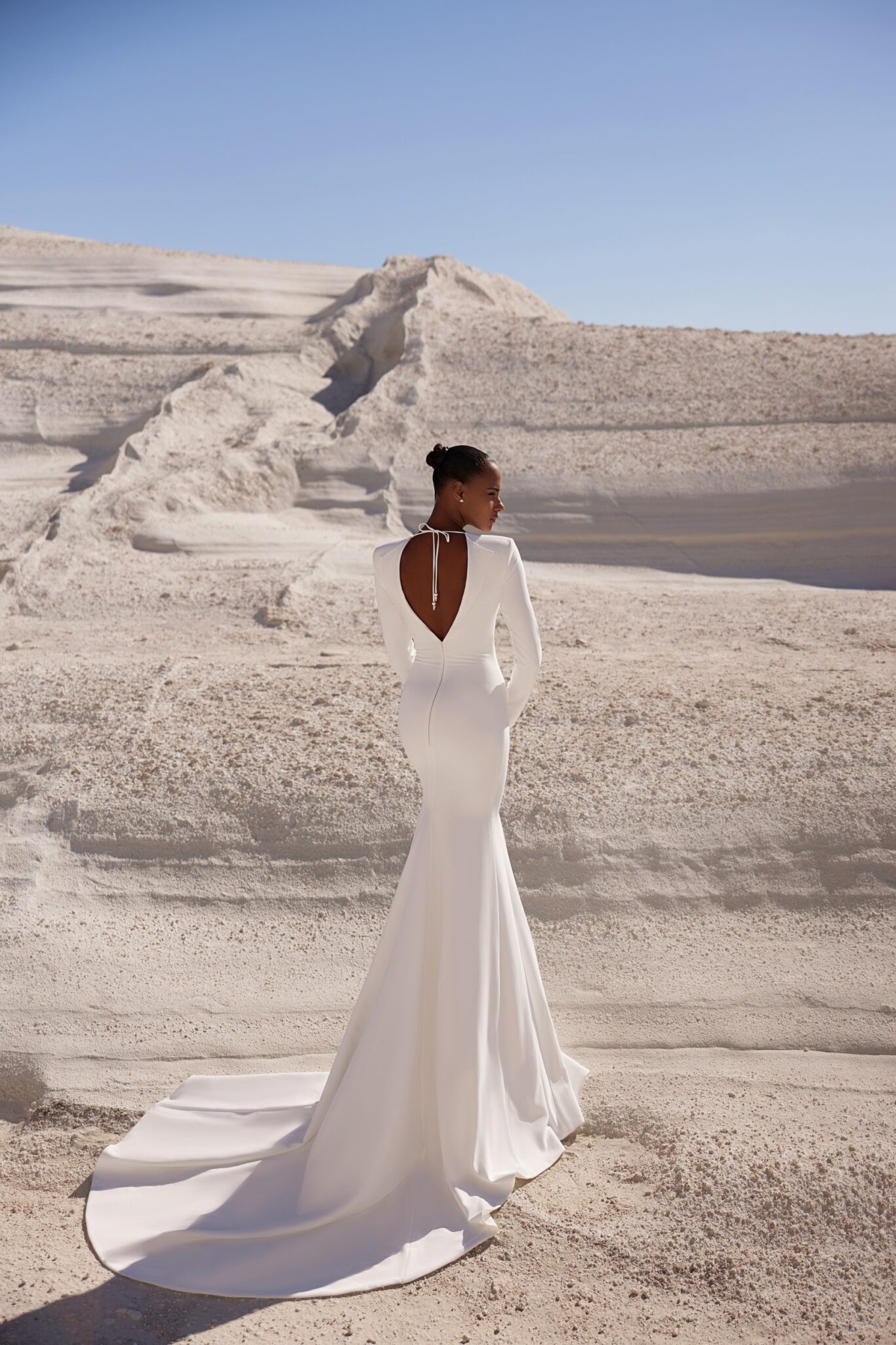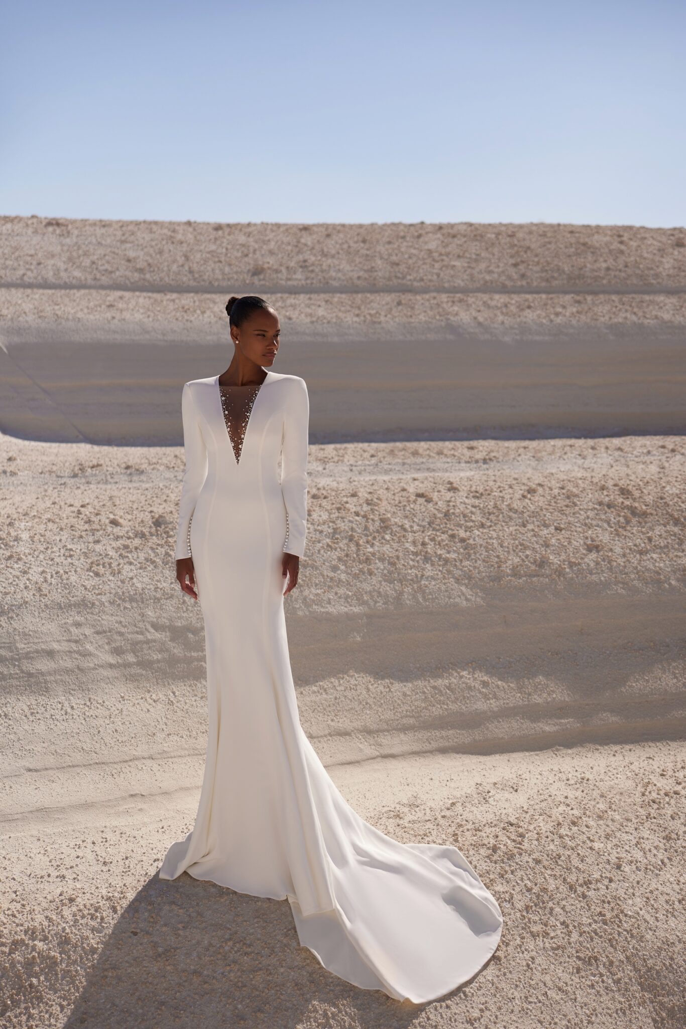 VenusSleek minimalist mermaid dress featuring a deep plunging neckline decorated with edge-embroidered mesh and delicate pearl buttons on the inner side of the cuffs. The dress remains a classic while reflecting the modern character of the bride.