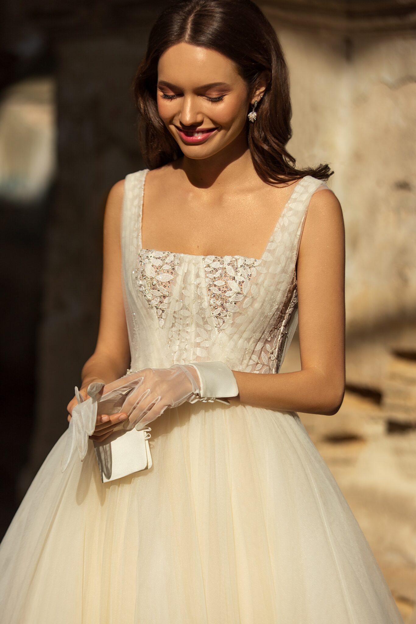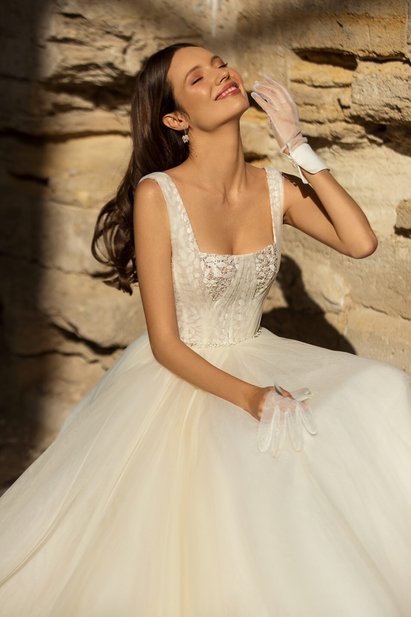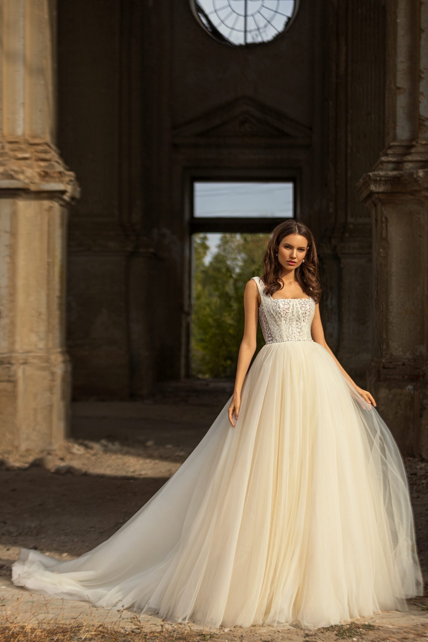 Golden HourDixie gown is combining a trendy square neckline and unique lace decorated with leaves pattern. The dress is made of tule and decorated with a dedicate shiny belt.