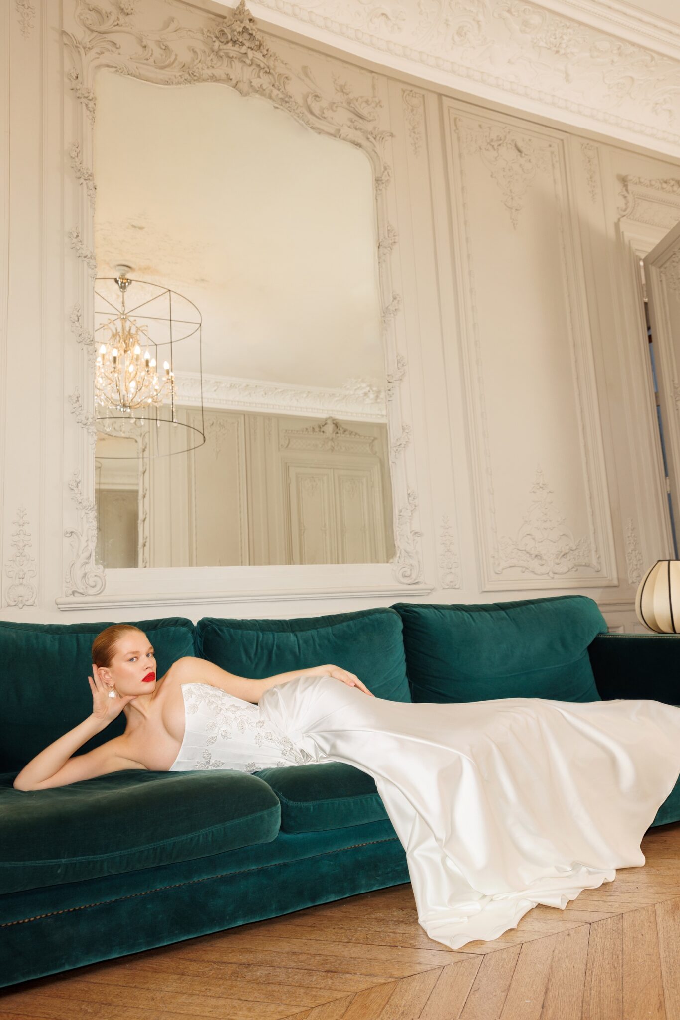 Atelier LumiéreMermaid tail featuring a fitted lace base, gracefully adorning the curves of the feminine body. Long fitted sleeves descending from the open-shoulders neckline and structured corset top make the design a metafor to the purity of the body, while distinct mikado silk overlayer, featuring a corset and an over-skirt being meticulously interlaced in the front and behind the back, are giving a touch of sprkle and playfulness to the style.