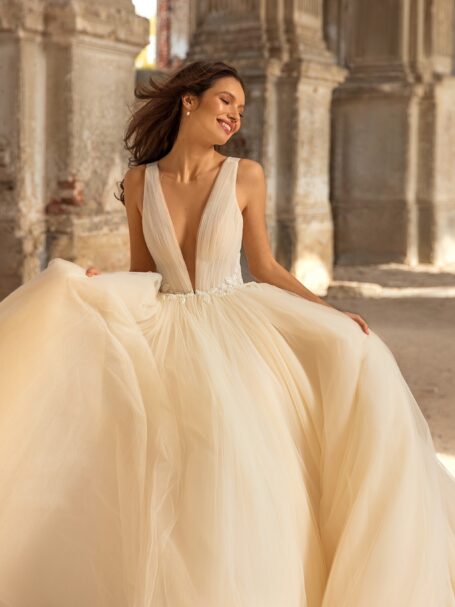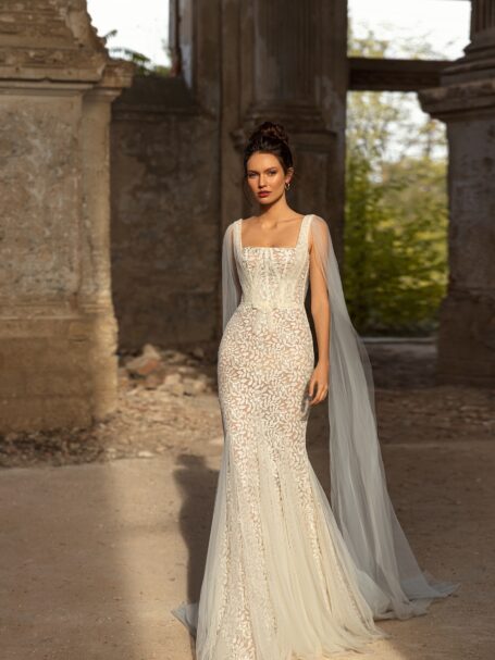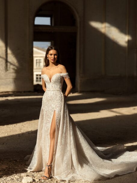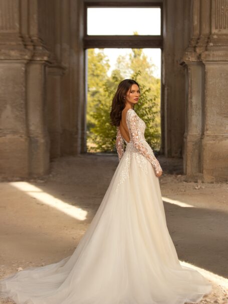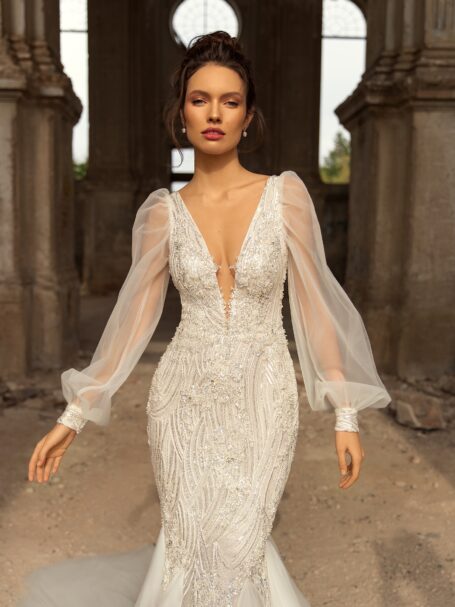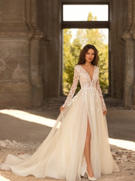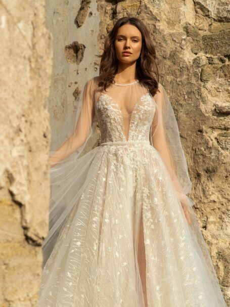 Golden HourDream is a dress with stunning V-shaped neckline and lightweight tule elements on the sleeves. The dress is decorated with a gorgeous lace with beads and flowery pattern.