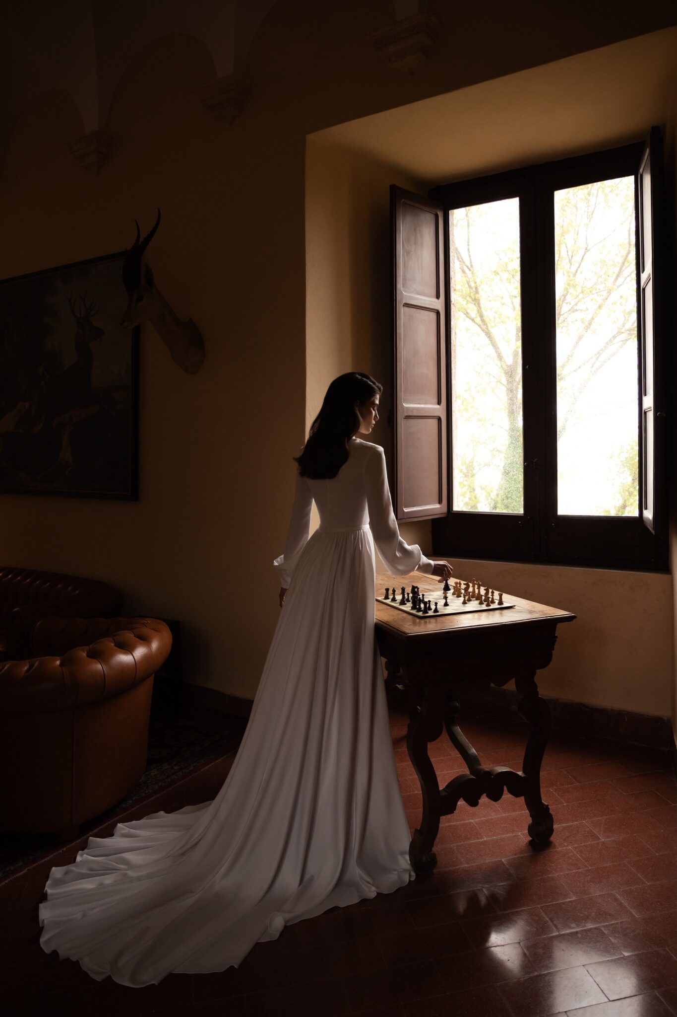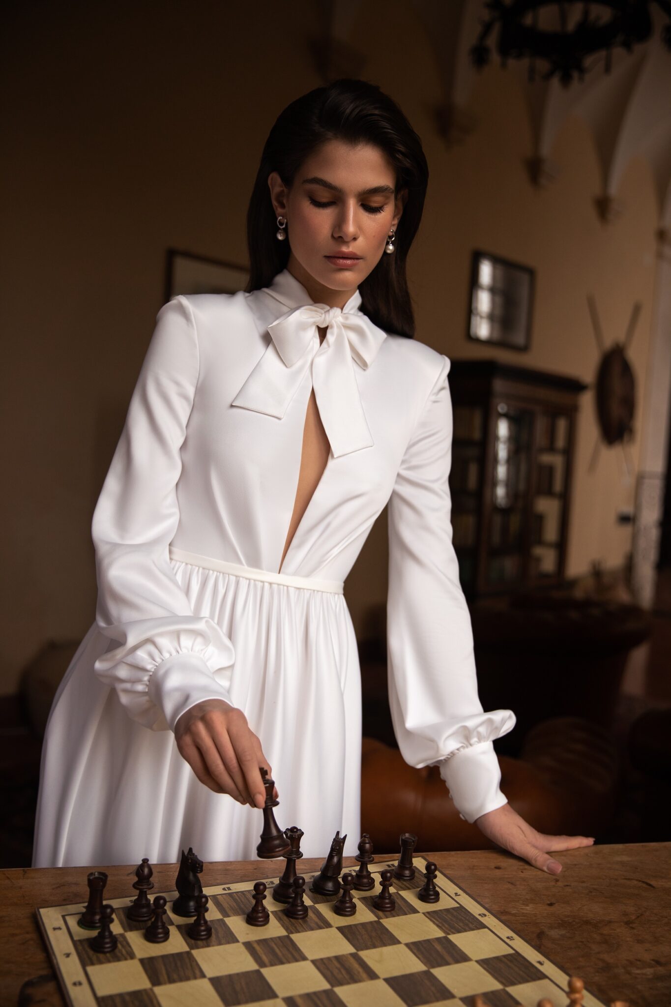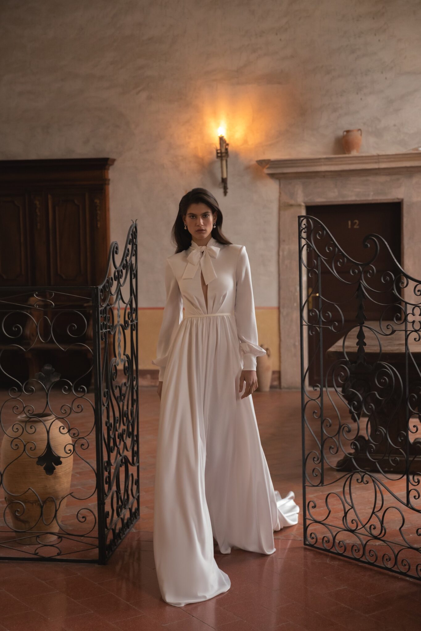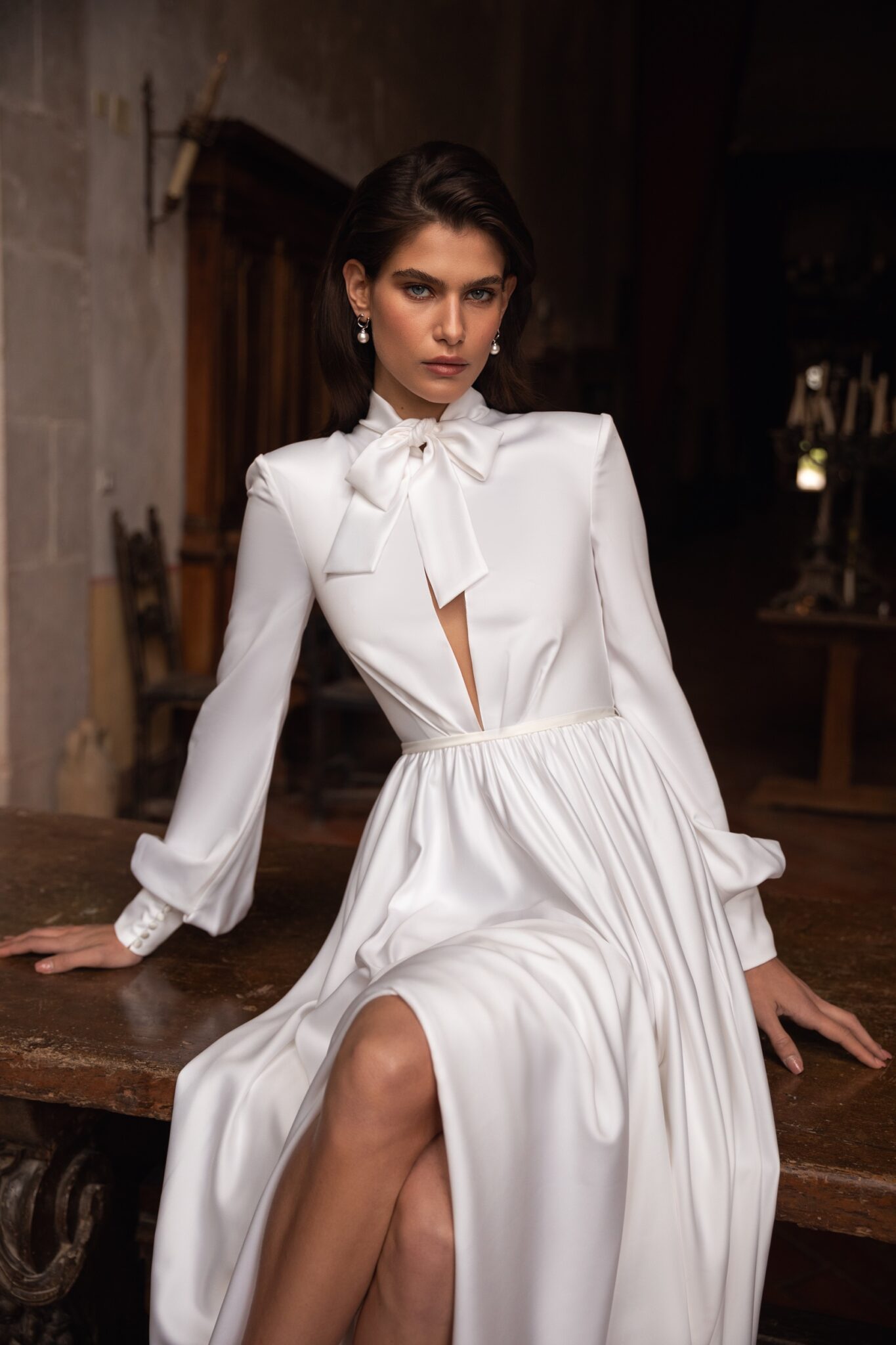 Made 4 LoveClean lines and a sleek satin fabrication combine to make this youthful A-line gown feel fresh with a Victorian styled statement bow tied on the neckline. Pretty Closed bodice with high collar, cutout detail and long loose sleeves pass into a neat flowing satin skirt with a sweeping chapel train.