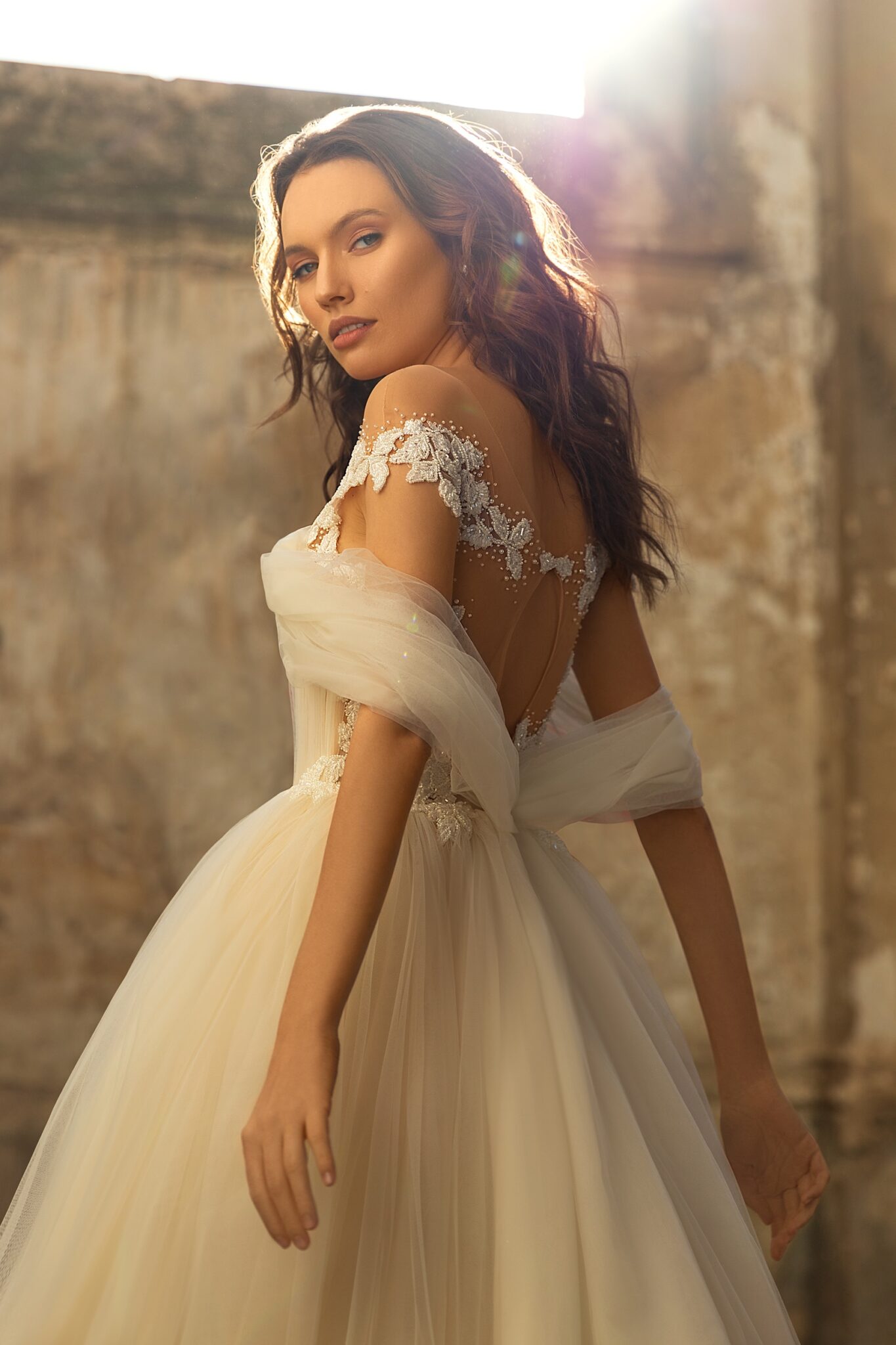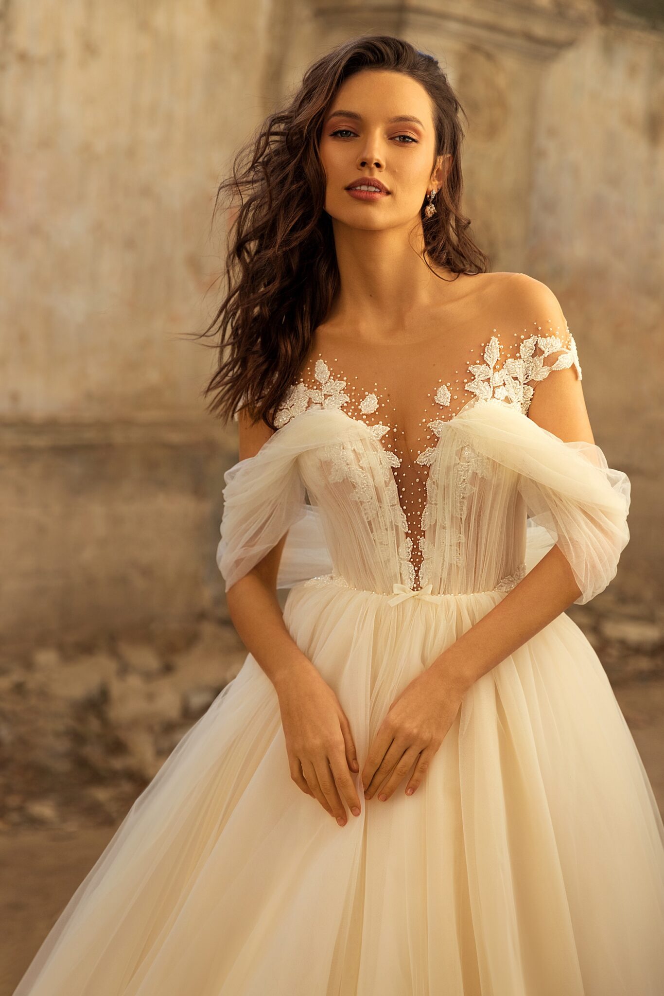 Golden HourA lightweight wedding dress with a sweetheart neckline and unique off shoulders sleeves. combined with lace top. The unique top is perfectly matching simple tule skirt.