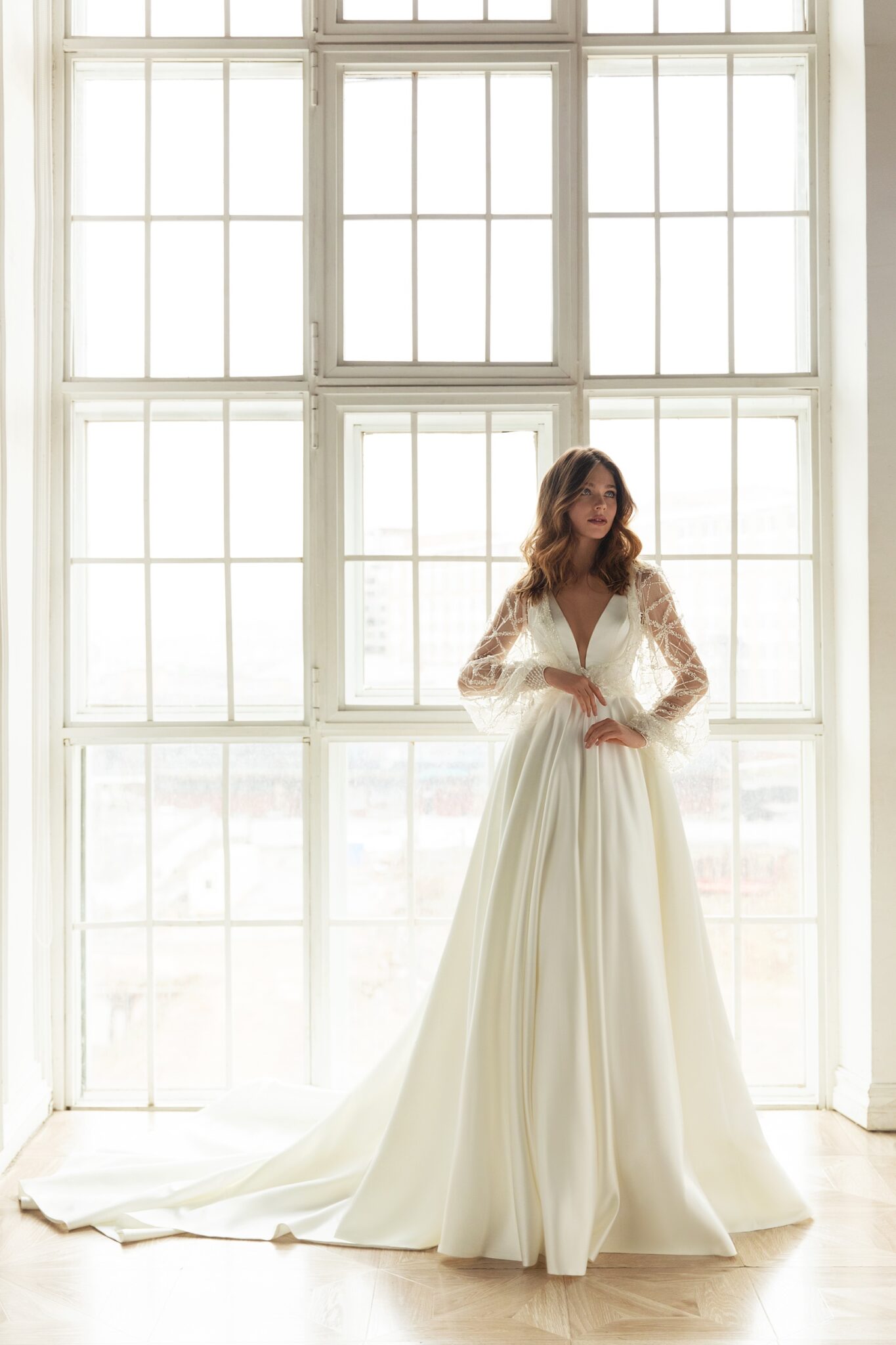 Less is more 2021This A-line wedding gown is made of shining fabric. A V-shaped neckline accentuates a beautiful decollete. The fantastic deep neckline at the back of the dress is decorated with lines of marvelous pearls. A thin belt highlights a waistline. The delicate skirt passes into a long train. There is an additional bolero that is made of transparent fabric. It is decorated with a pattern of beads and crystals. Wristbands are embellished with pearls.