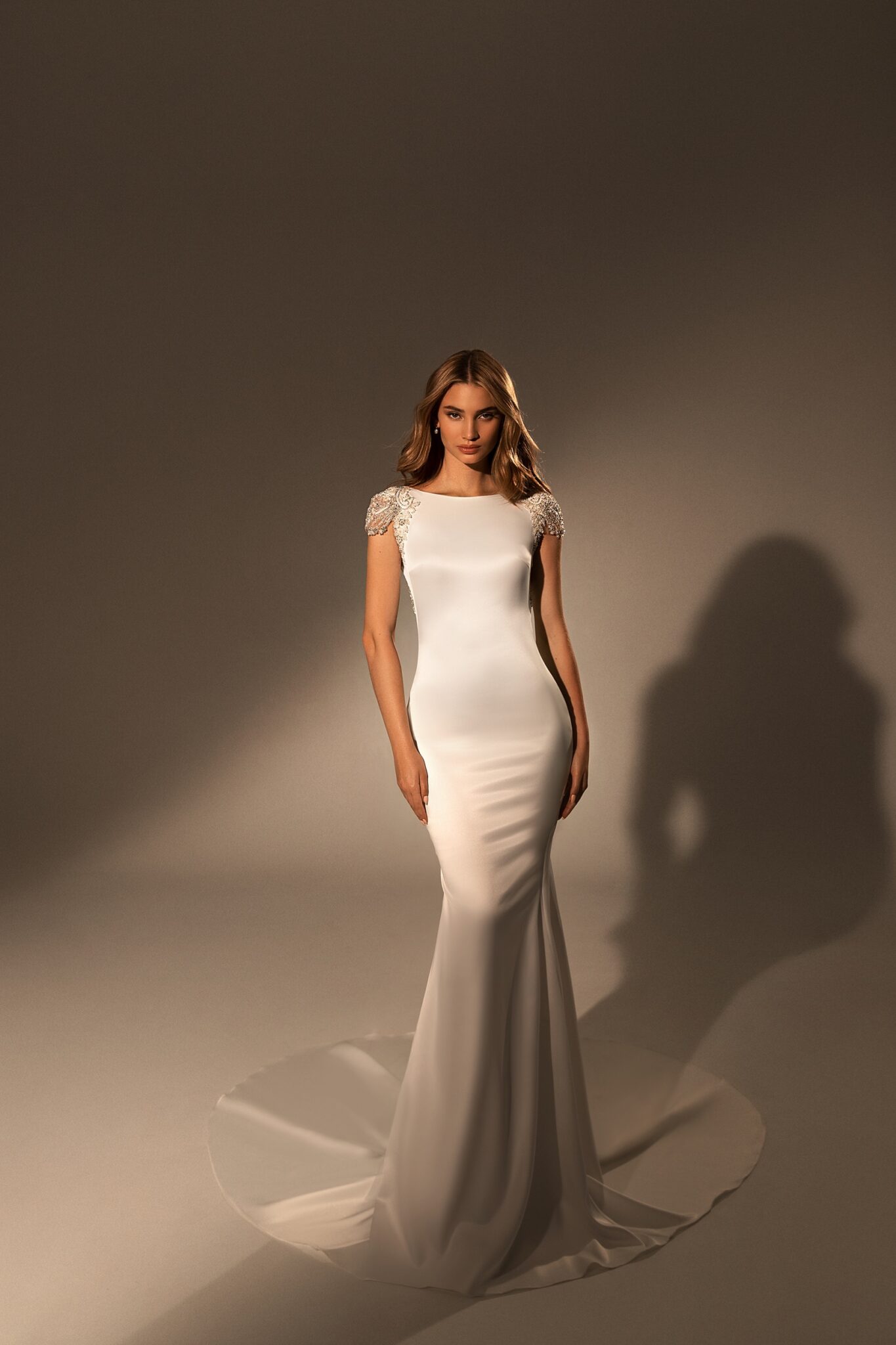 MuseA royal wedding gown with an open back. A sheath dress is made of glossy fabric. The silhouette accentuates the figure of the bride. Moreover, back is decoreted with eyecatching lace.