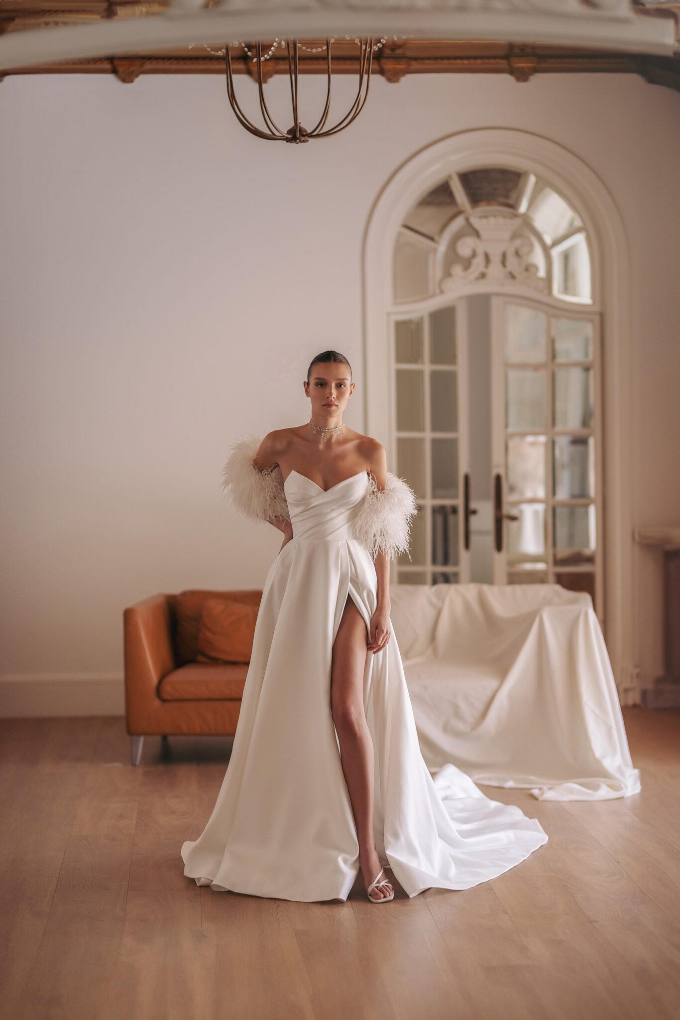 GeminiEtta — V-neck wrapped corset-based gown with split skirt and detachable feather bolero.