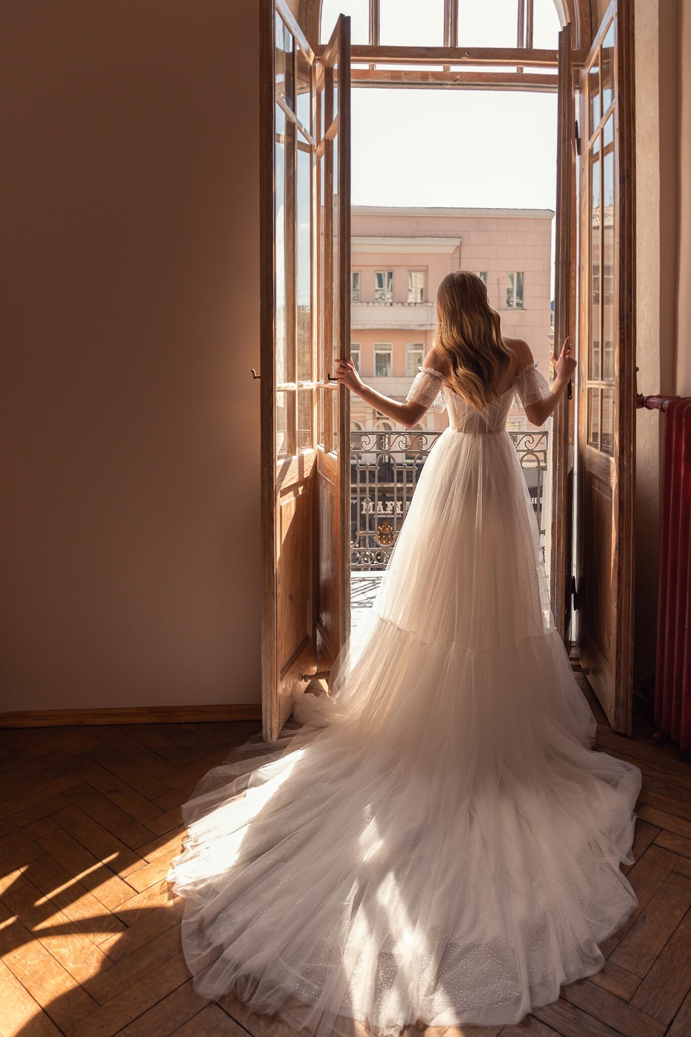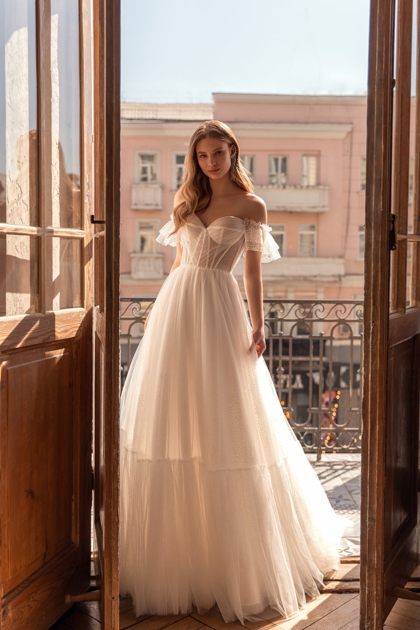 Less is more 2022, Sample SaleFabian is a tender and fragile wedding dress which will make you feel like a princess. A combination of fabrics and A-line silhouette look gorgeous. The strapless corset with lowered shoulders decotated with transparent falbalas are embellished with patterned lace. The skirt has the same pattern and the lightweight fabric made of veiling is decorated with wide falbala on the bottom. The veiling skirt passes into a long train.