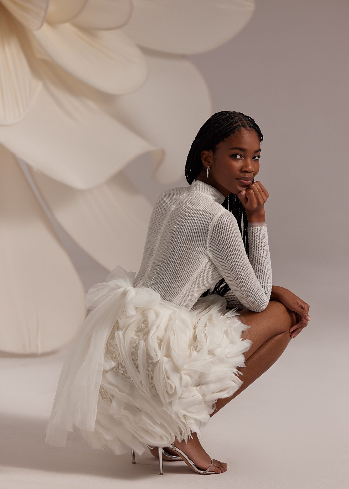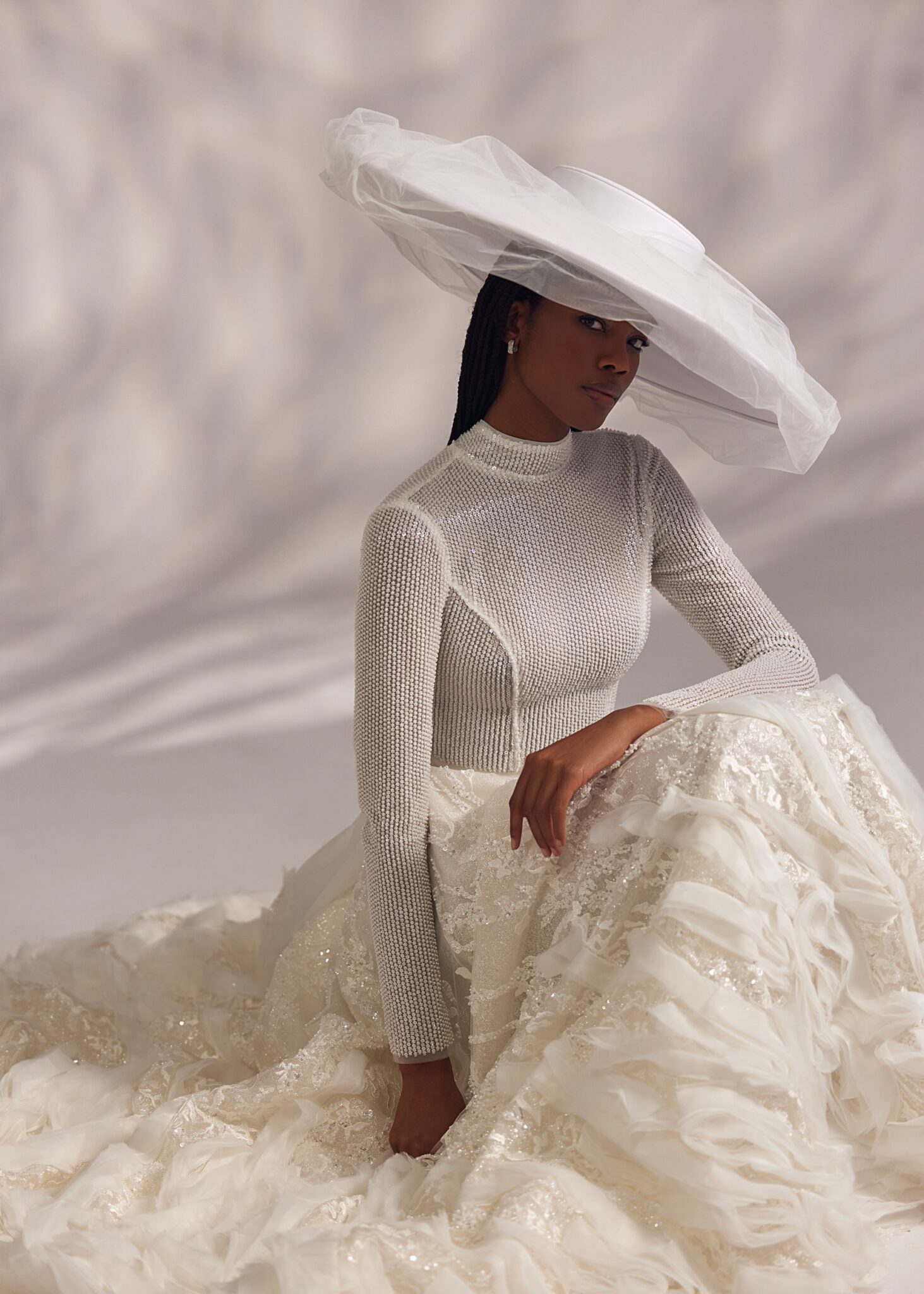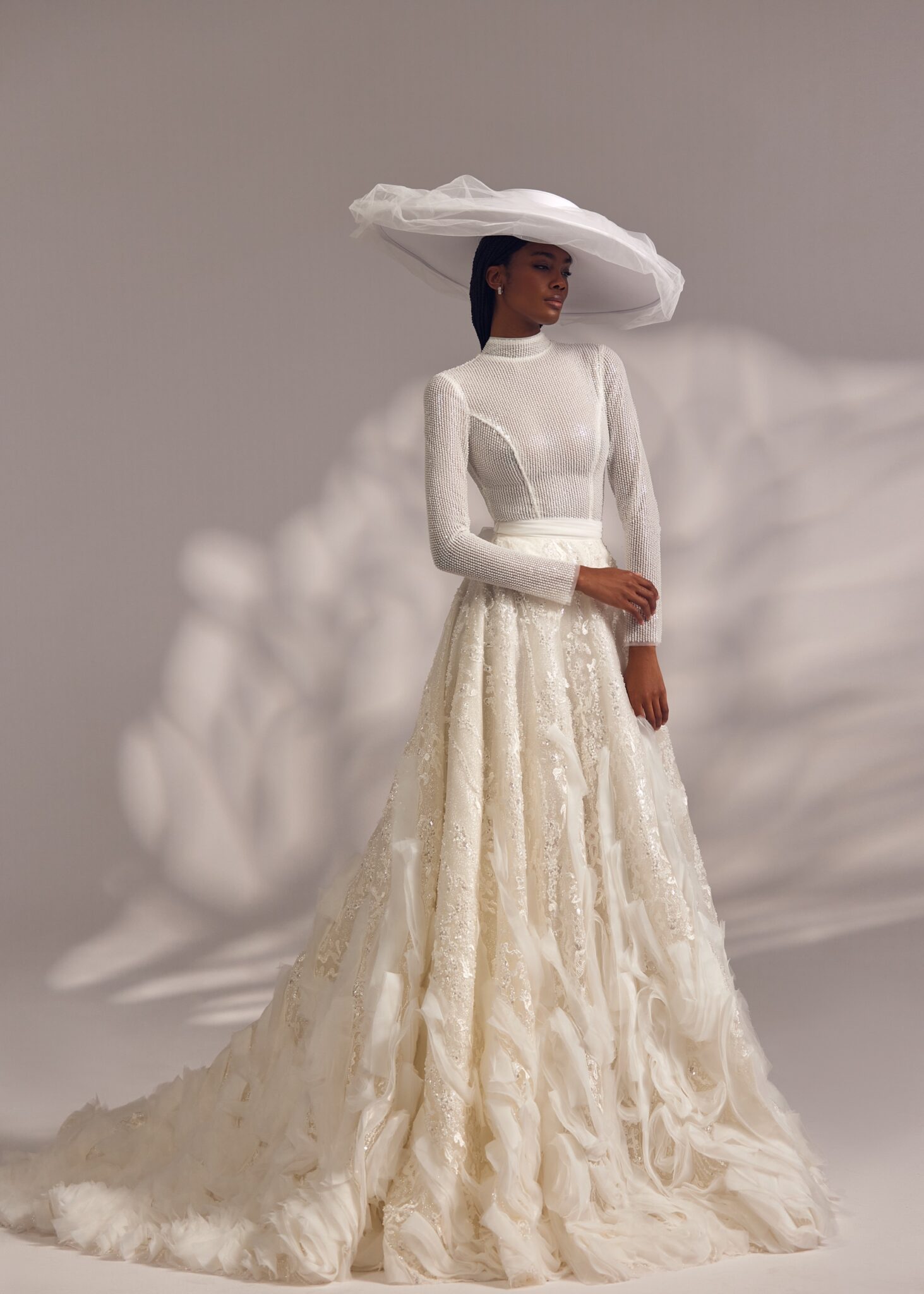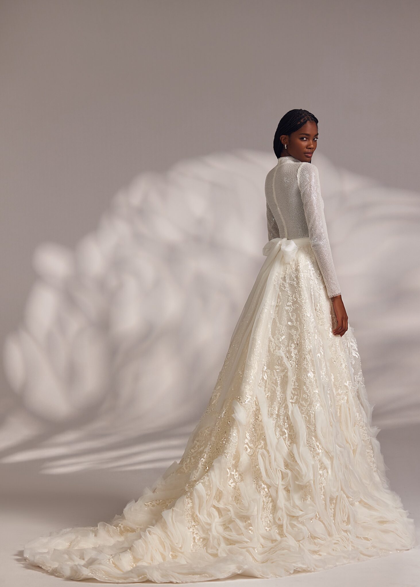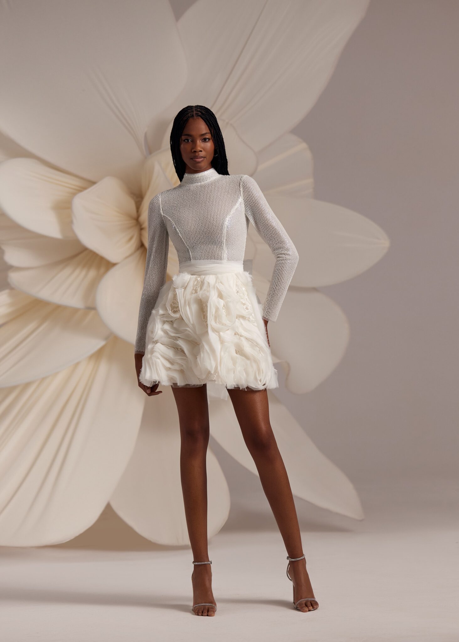 Less is More IVFallon – double-mesh turtle neck long-sleeve mini-dress featuring voluminous ruched skirt and complemented with a ruched detachable gown.