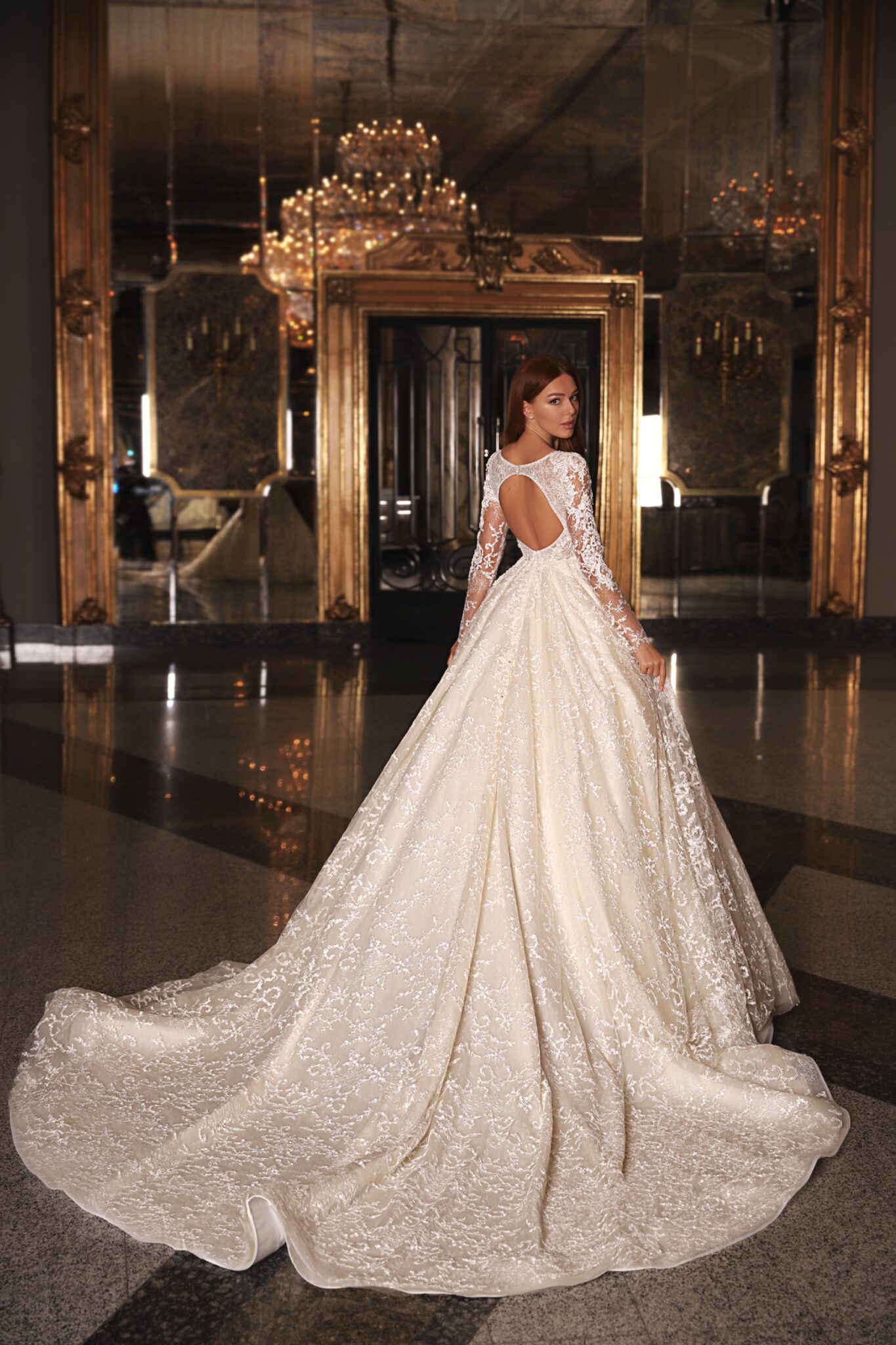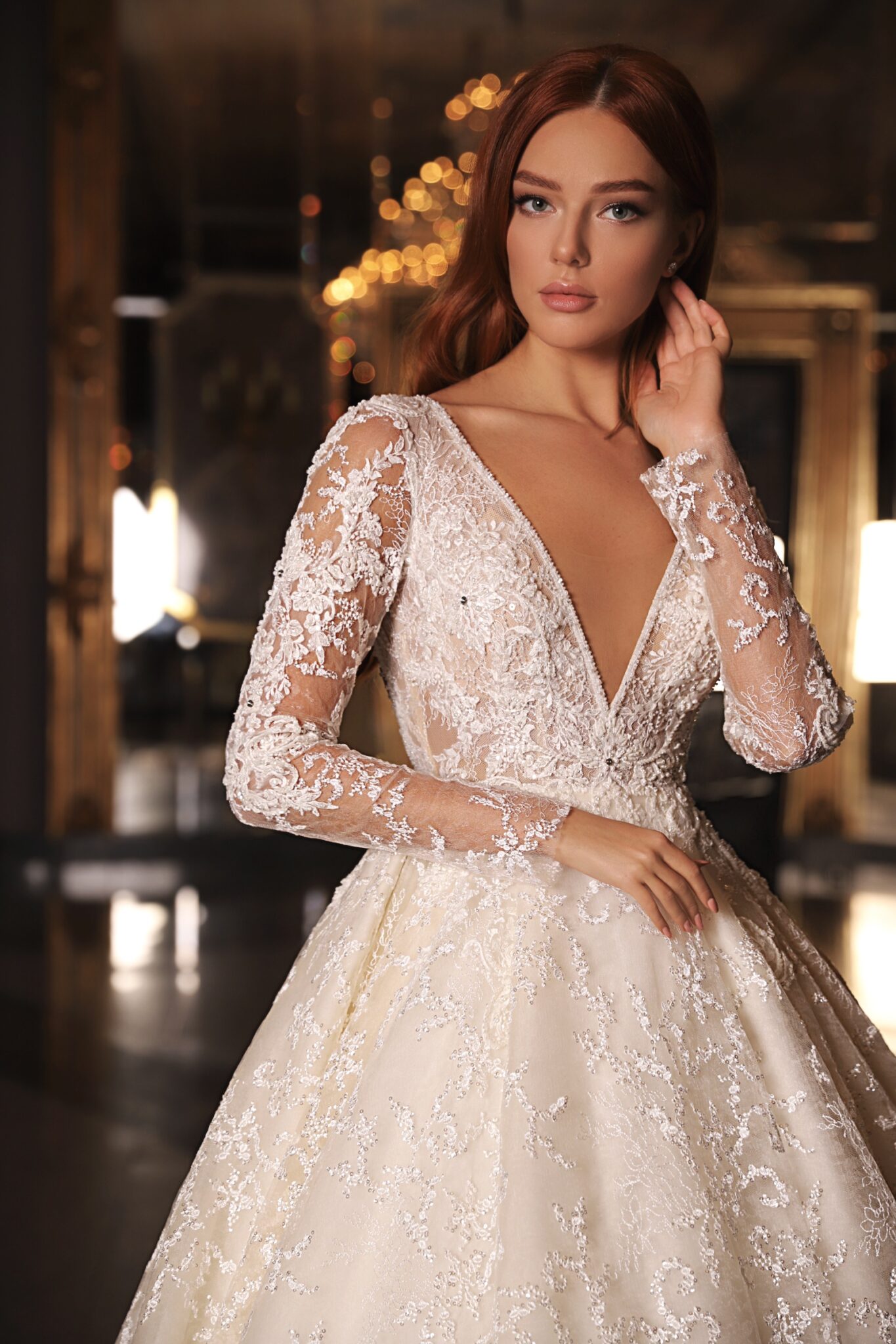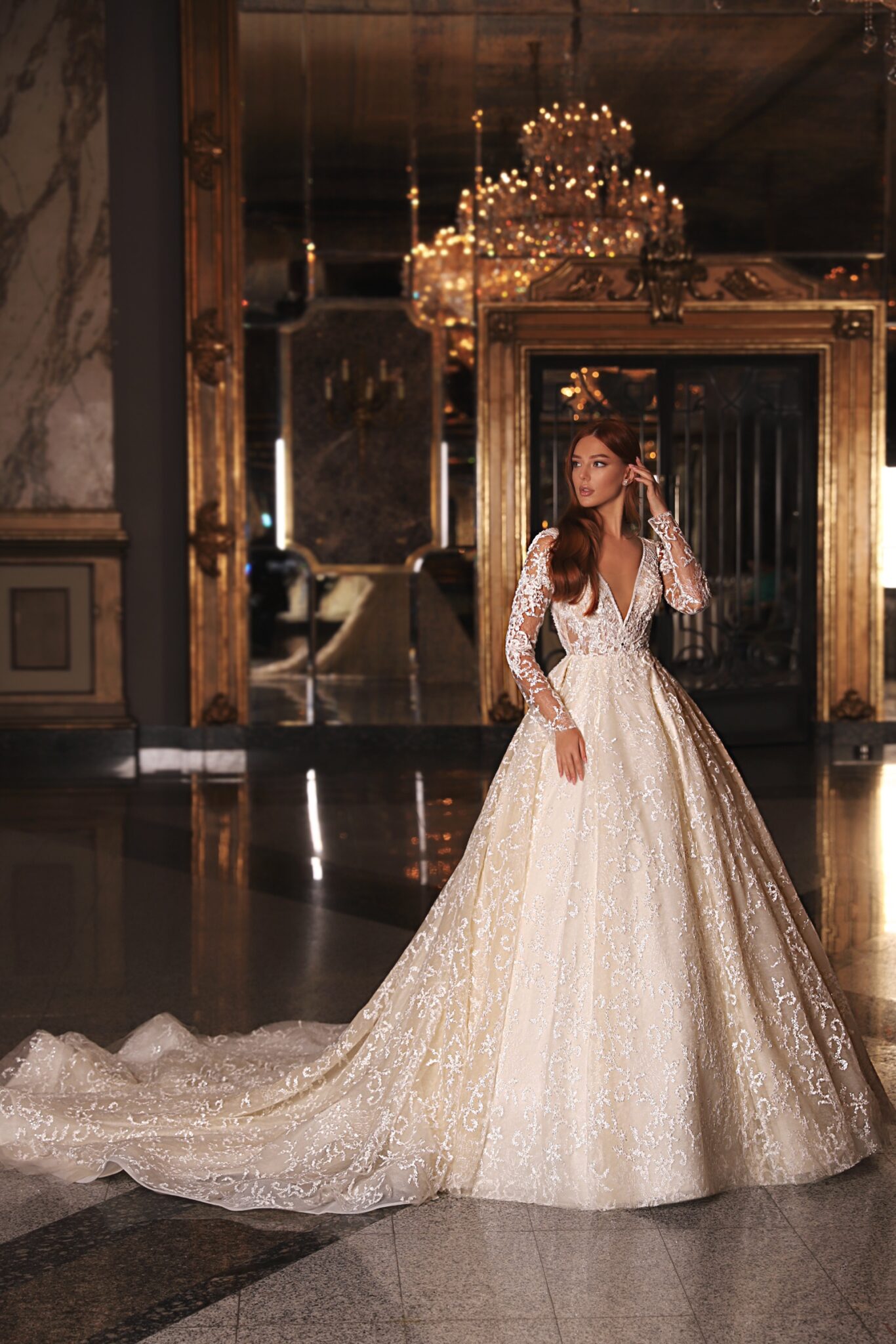 EdemRoyal Ferida ball gown looks spectacular. A dress is made of lace and veiling. A bodice with a V-shaped low neck is made lace with a floral pattern. Long transparent sleeves and rounded neckline add femininity. The whole dress is entirely decorated with beads and spangles. A loose skirt passes into a long fancy train.