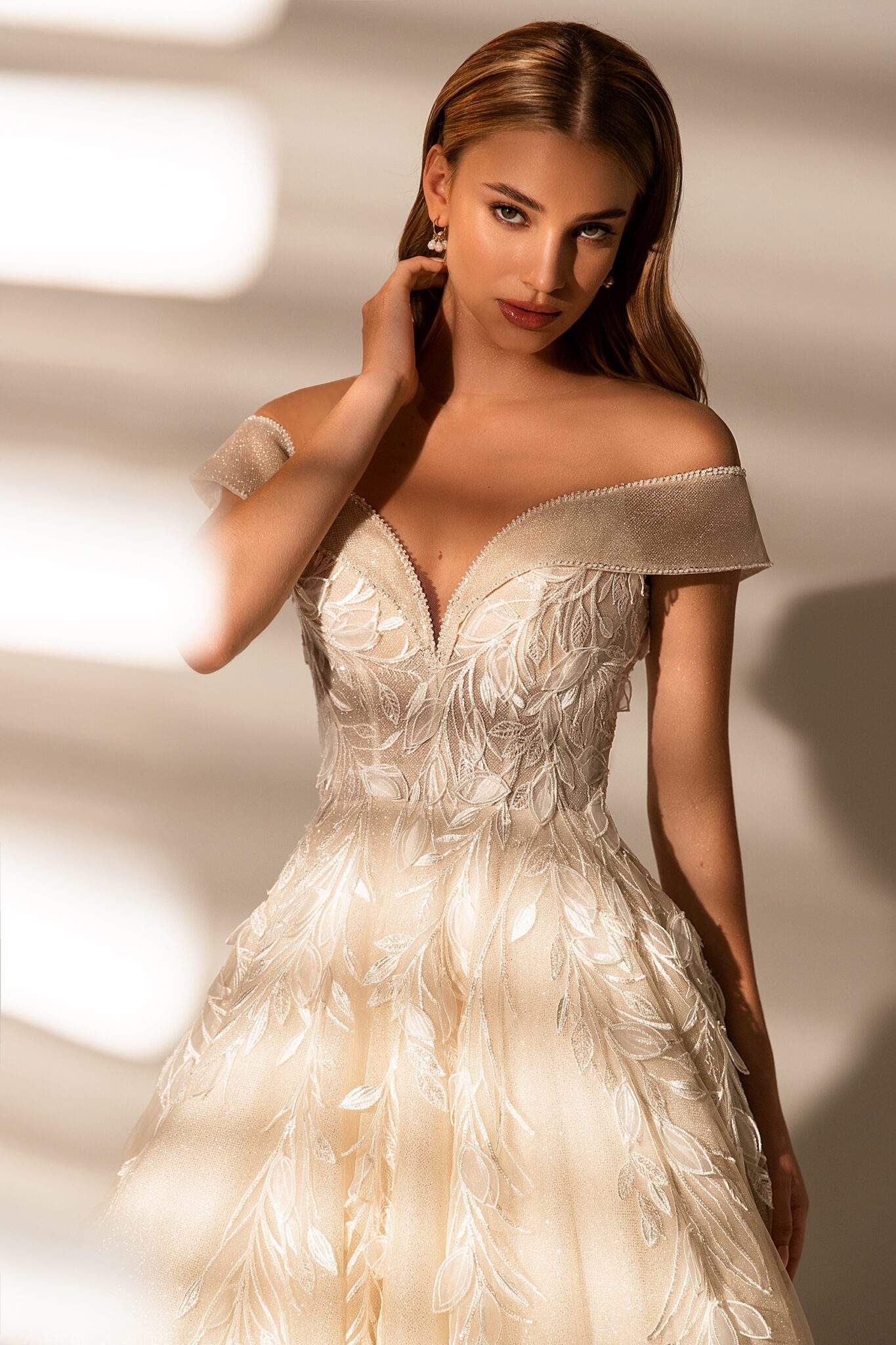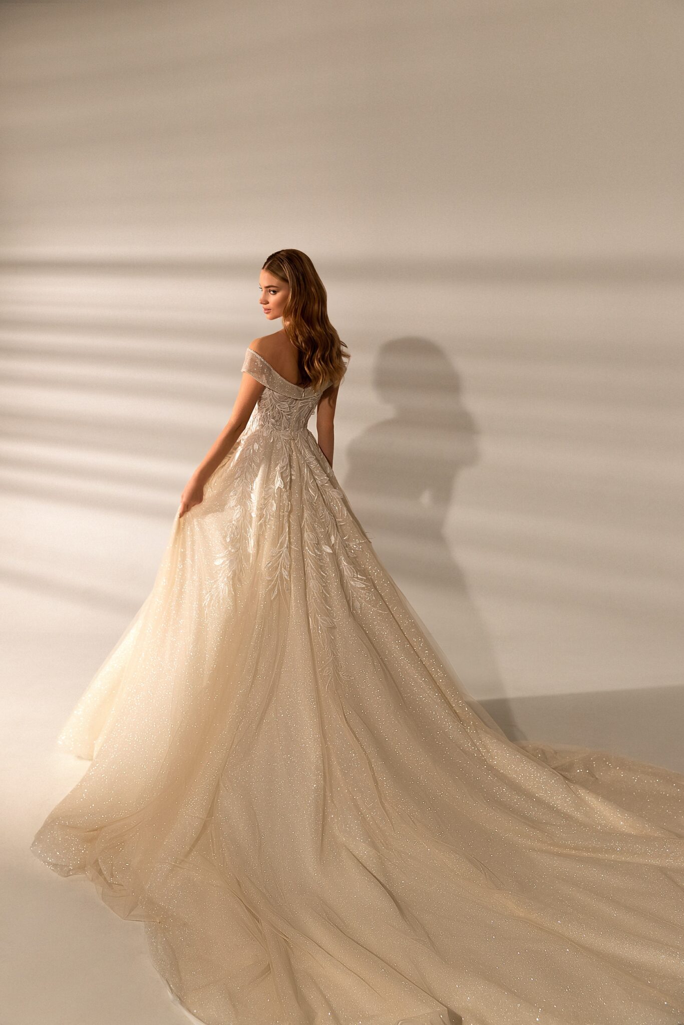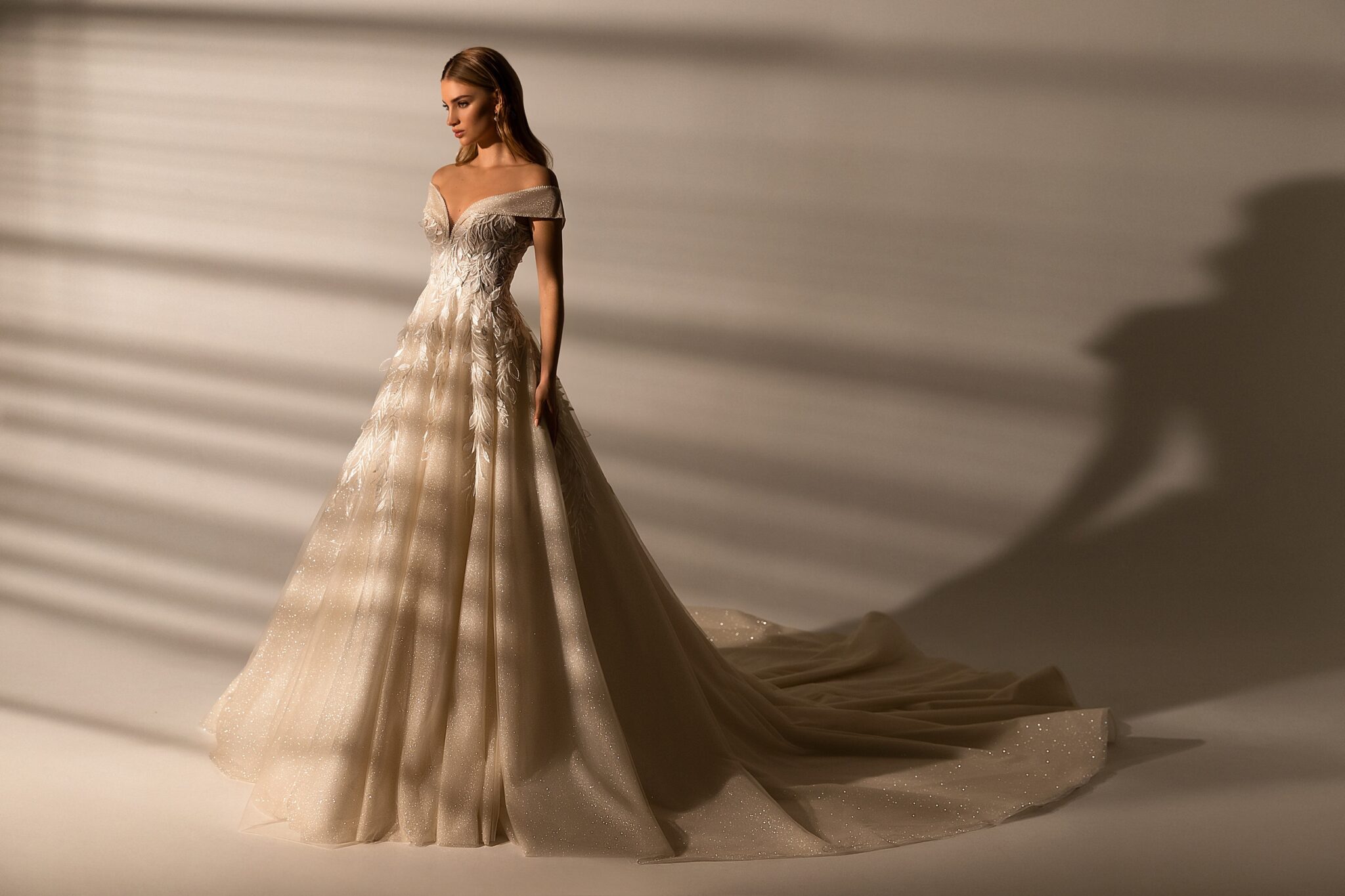 MuseLace Ferrara A-line wedding gown looks fabulous. Lowered shoulders and a low neck look tender and romantic. Corsage with lowered shoulders is made of sophisticated lace. Veiling insets on the corsage looks fantastic. A skirt that is made of the same material sparkles on the sun. Long tail makes this outfit perfect. The dress is entirely decorated with small flowers and leaves. The long magnificent tail is worth noticing.
