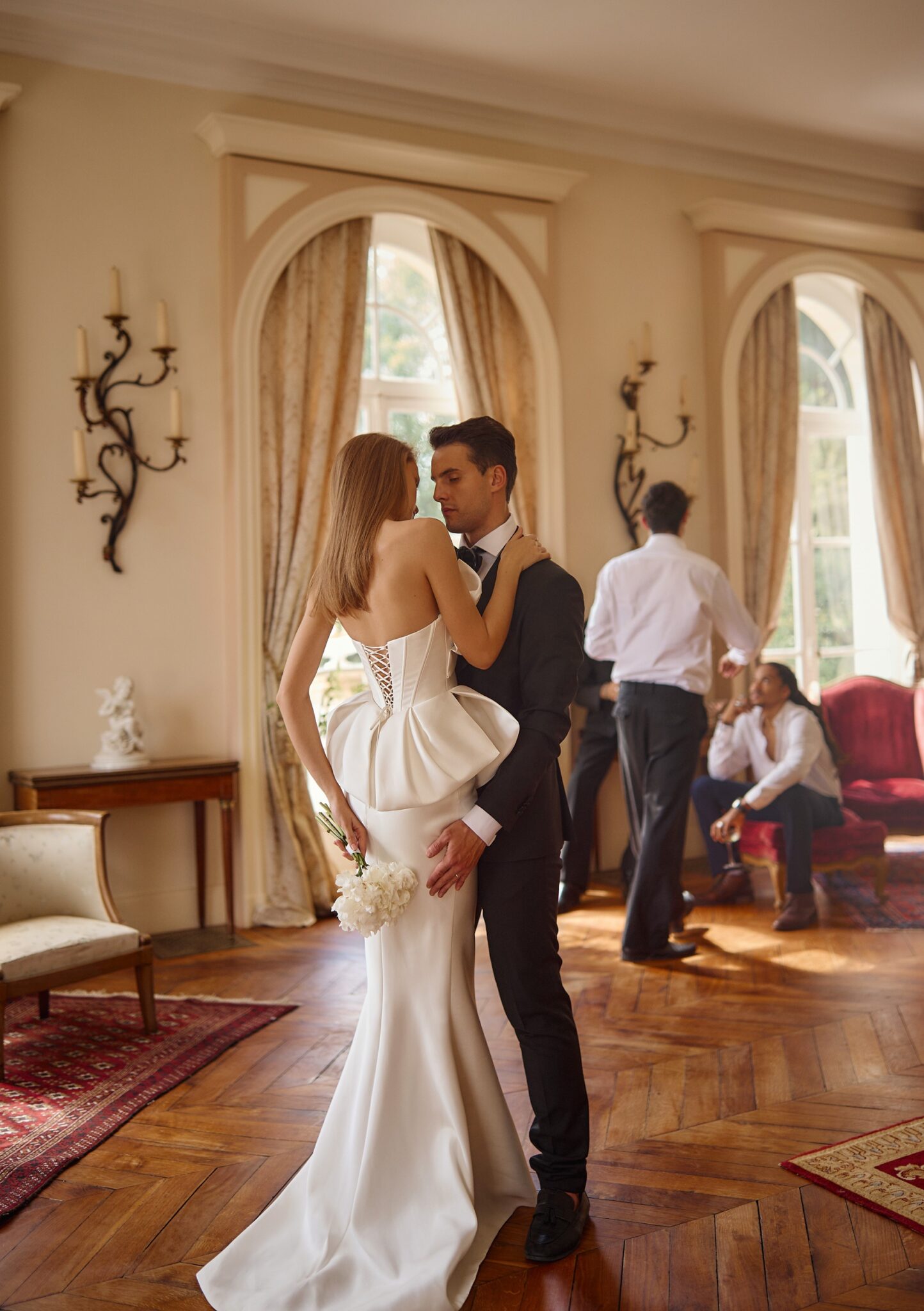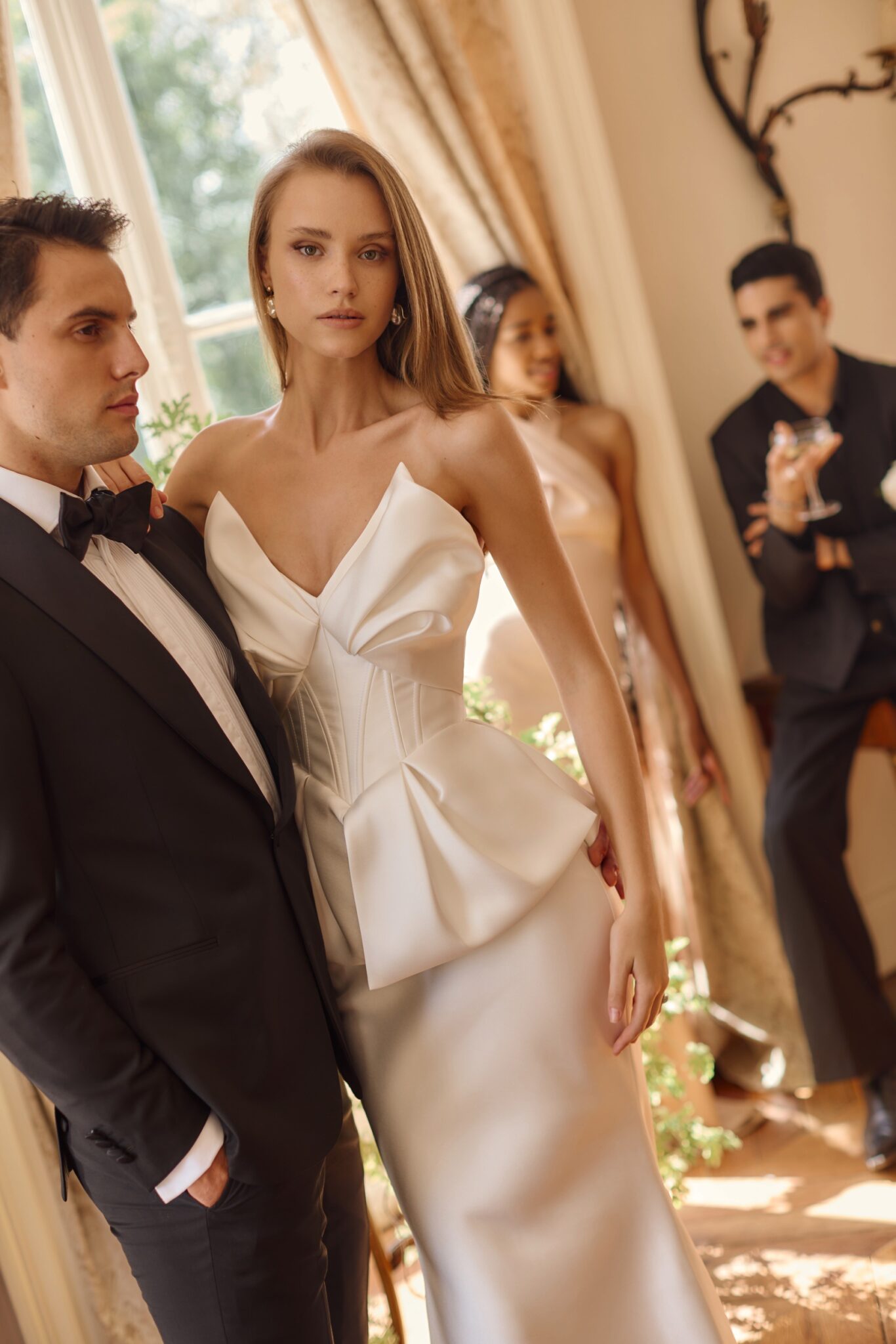 Love StoryMermaid silhouette dress made of smooth fabric with bow-shaped voluminous corset neckline and matching peplum.