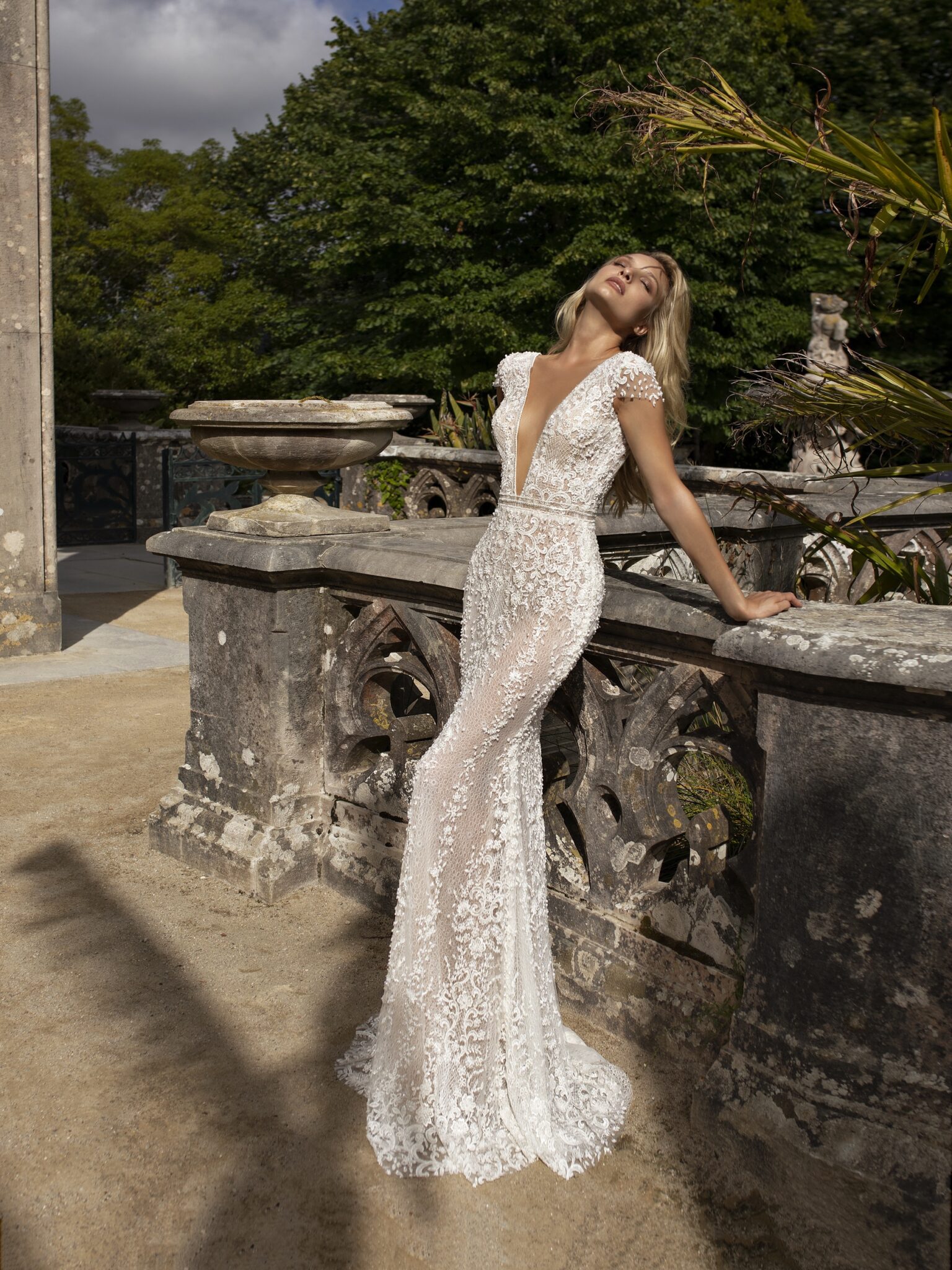 Lisbon VibesFlame mermaid wedding dress creates a perfect feminine silhouette. This bridal gown is entirely decorated with a lace pattern. Gorgeous V-shaped low neck is embellished with small beads. The fantastic neckline at the back of the dress makes it more feminine. Short sleeves and a thin belt look great. A removable veiling skirt adds solemnity.