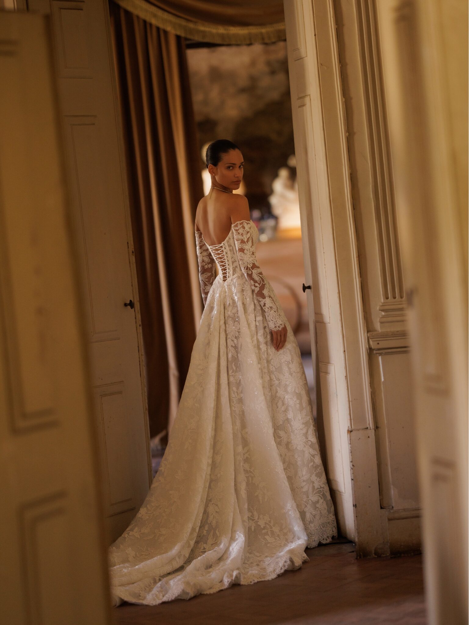Bridal AlchemyFortuna is an A-line silhouette gown, crafted from delicate lace and shimmering Chantilly lace with sequins.