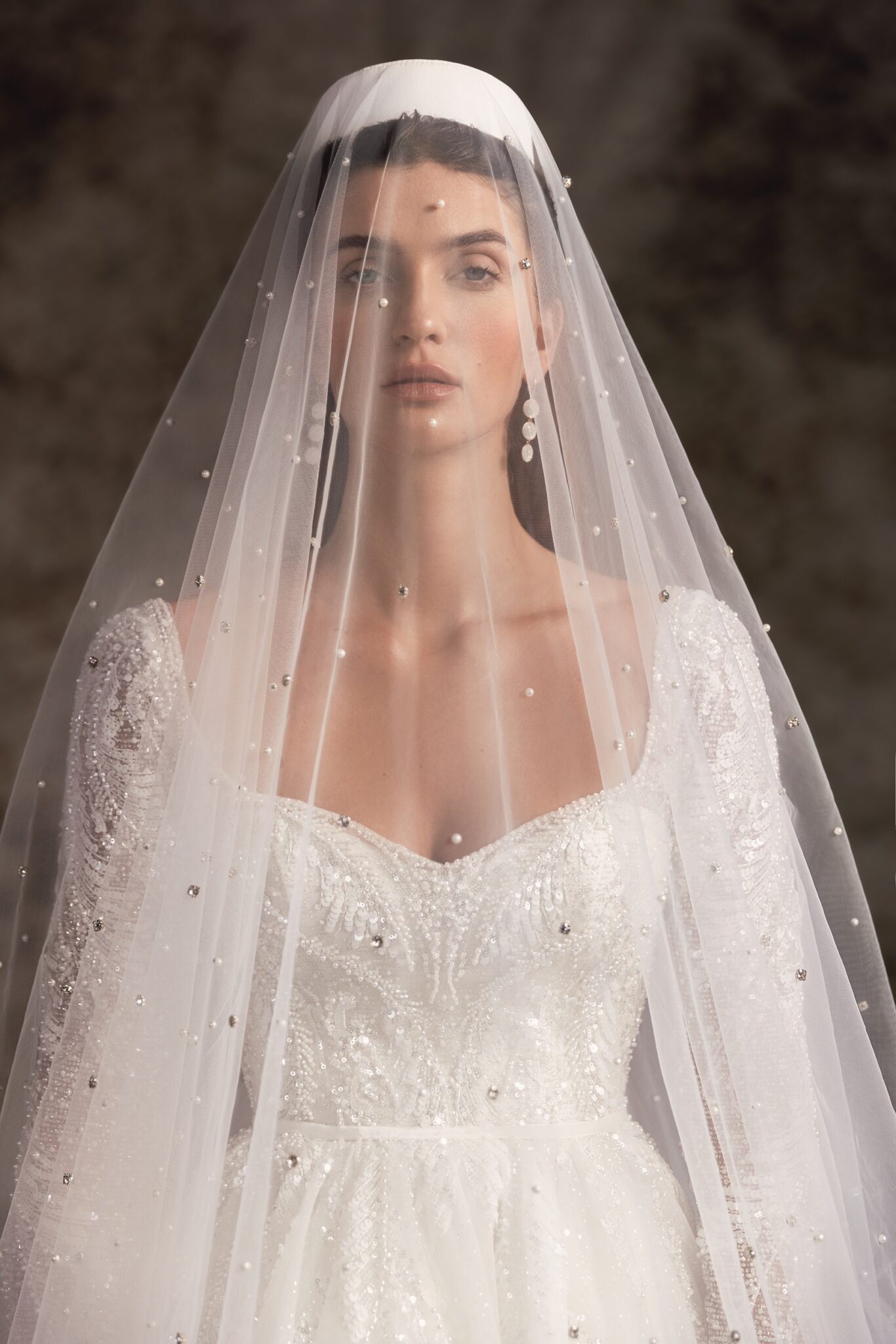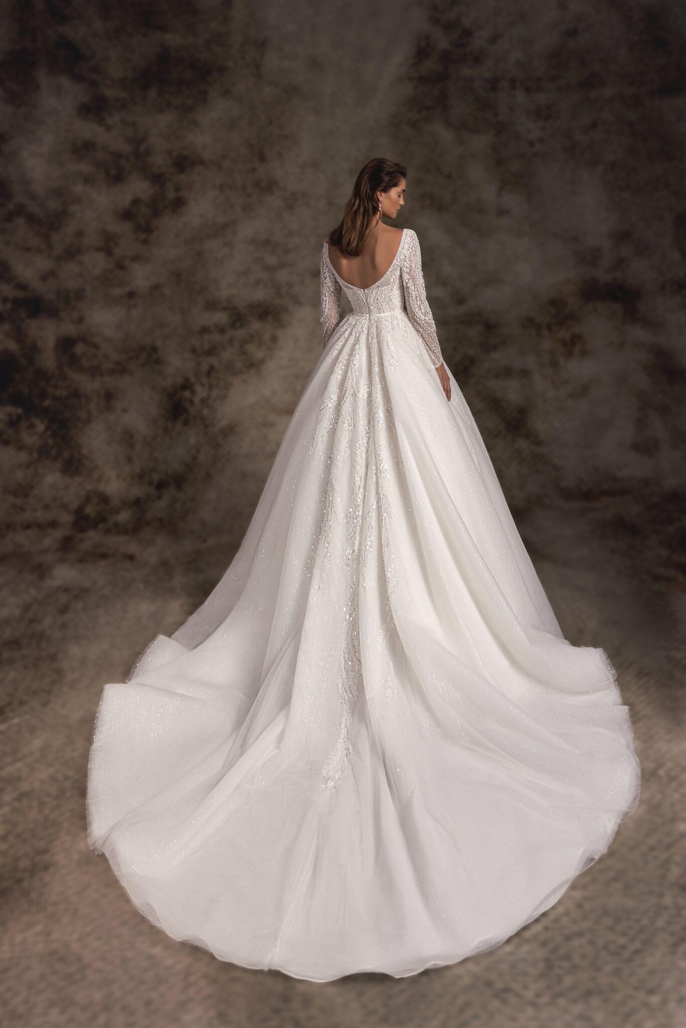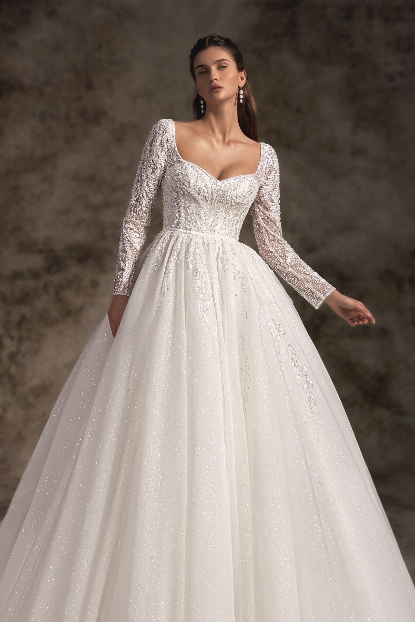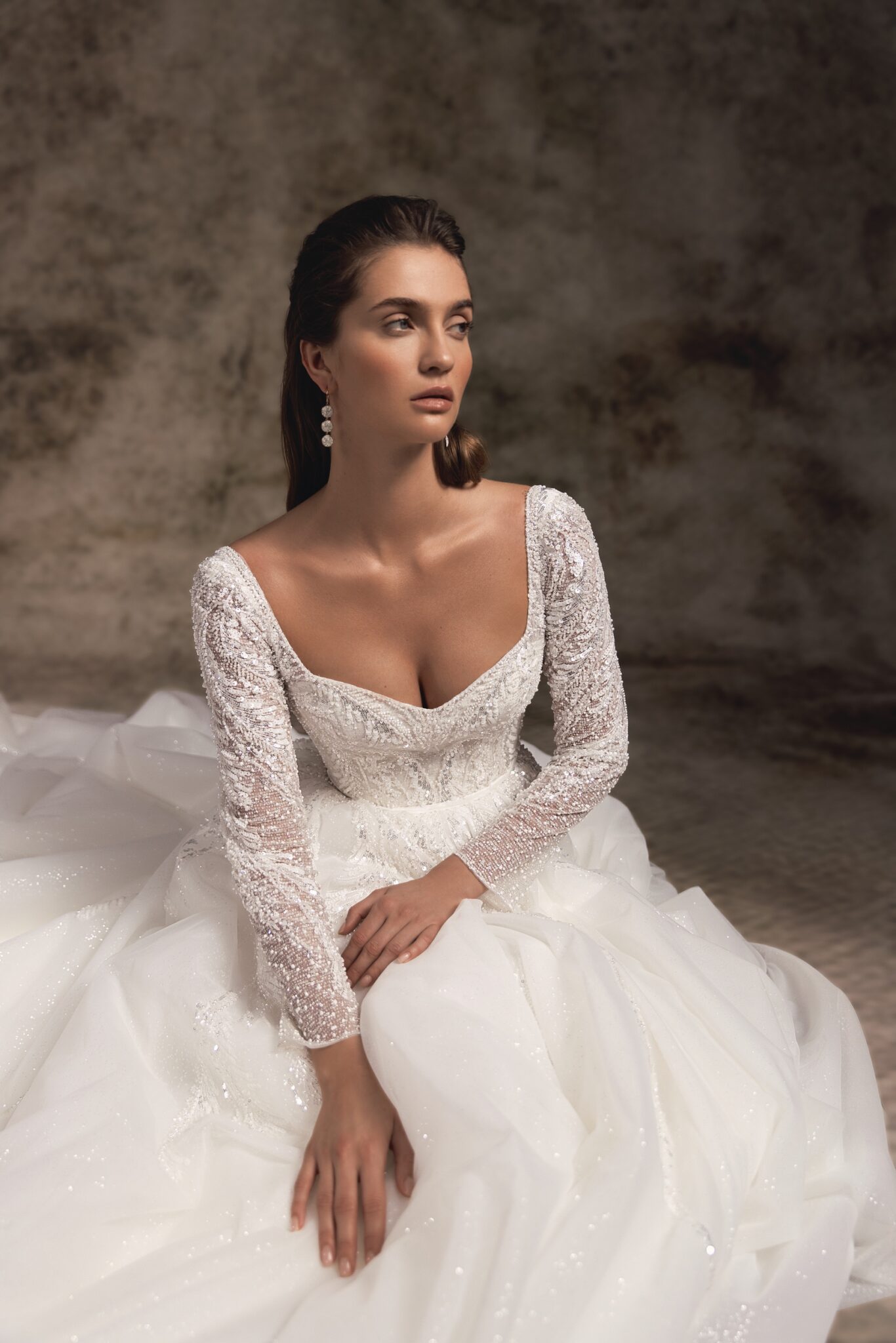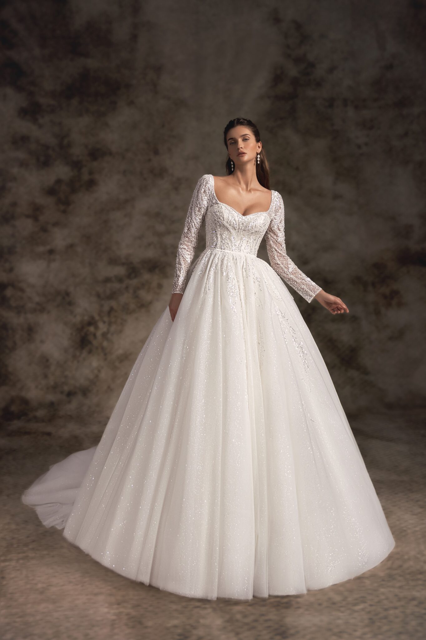 Notte d'OperaThis sharply tailored, voluminous ball gown, with deep sweetheart neckline and fantastic lace long sleeves embodies a true princess silhouette. Scattered hand-embroidered floral lace trickles down the voluminous full skirt that passes into a regal extra-long train.