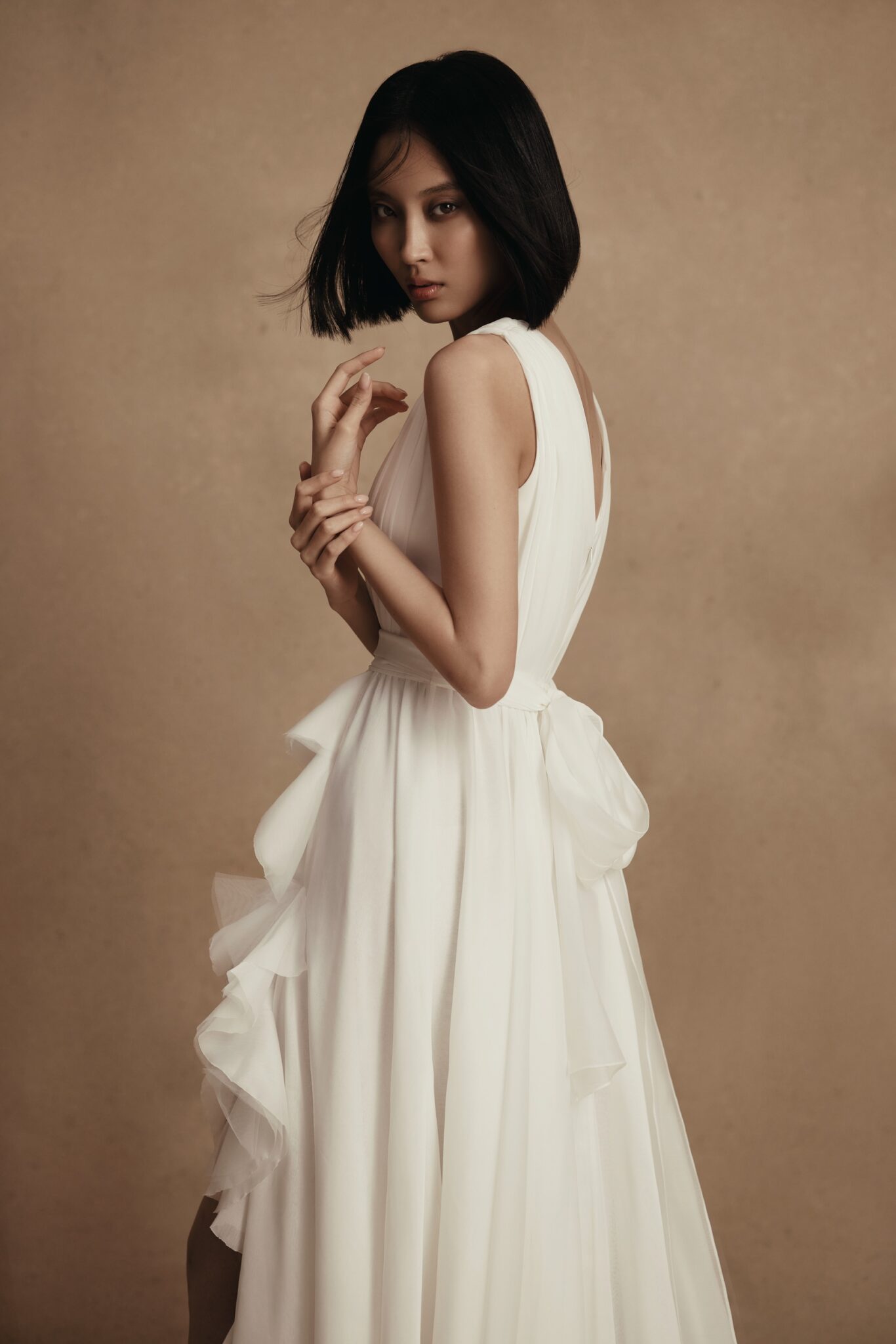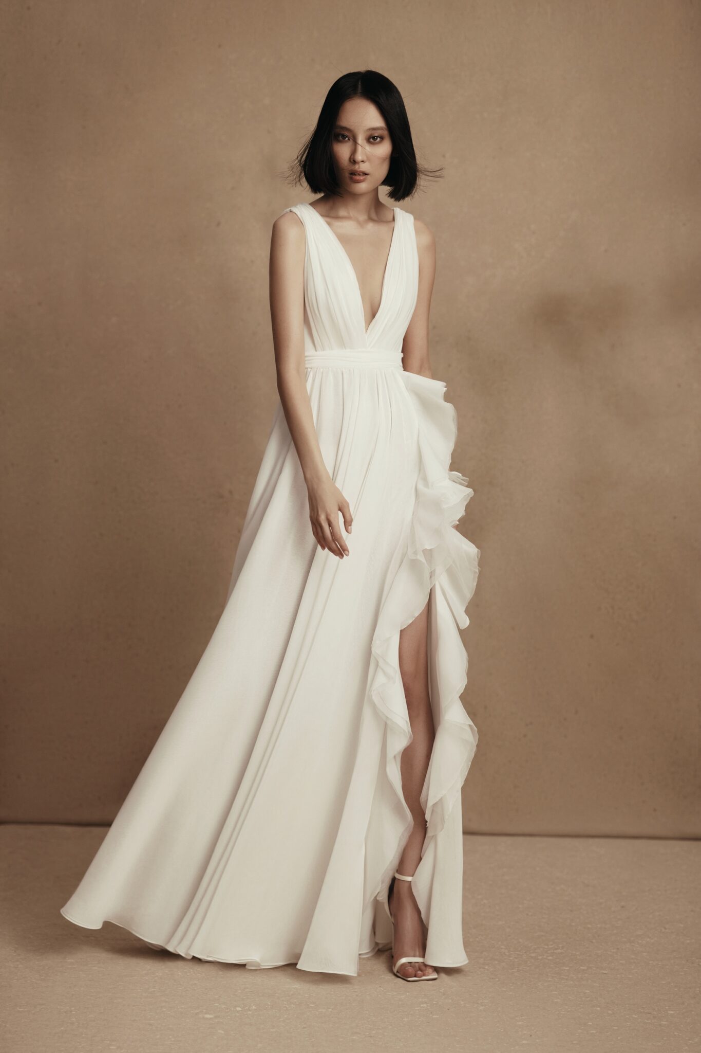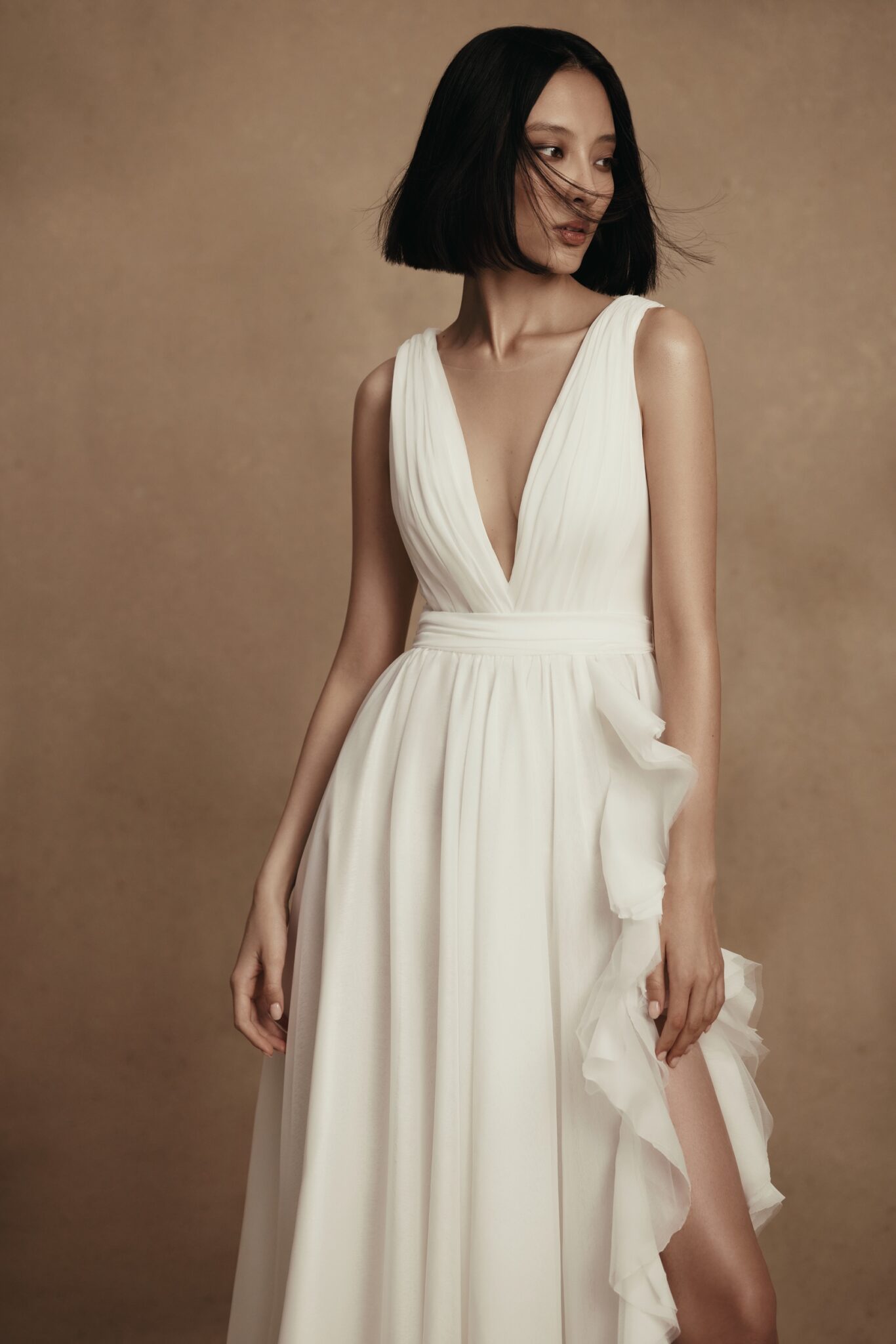 PersonalityFresia its a chiffone weightless wedding gown with deep V-neckline. The drapery on the corset smoothly transits into an A-line skirt with decorative elements around the high slit.