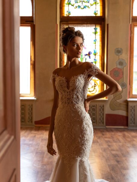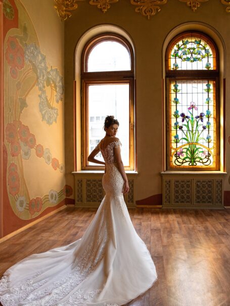 RomanceGalaxy is a sheath wedding gown with a long train. A dress is made of beige veiling with white floral ornament. It is entirely embroidered with beads and spangles. A V-shaped low neck and a deep neckline at the back of the dress add tenderness. A skirt is made of the same shining fabric and veiling. It goes into a long train.