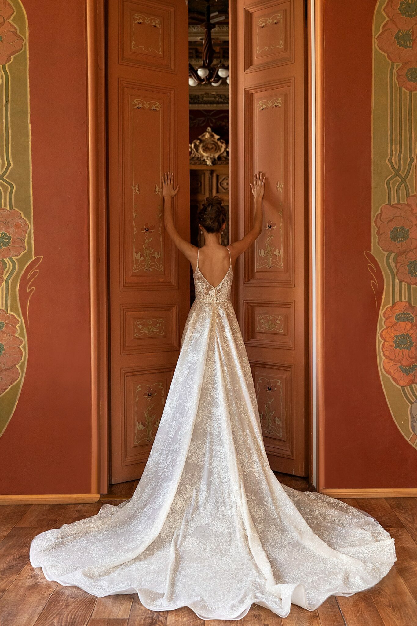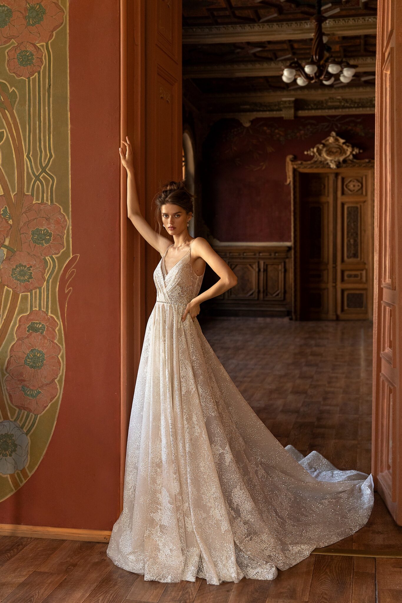 RomanceGalaxy is a sheath wedding gown with a long train. A dress is made of beige veiling with white floral ornament. It is entirely embroidered with beads and spangles. A V-shaped low neck and a deep neckline at the back of the dress add tenderness. A skirt is made of the same shining fabric and veiling. It goes into a long train.