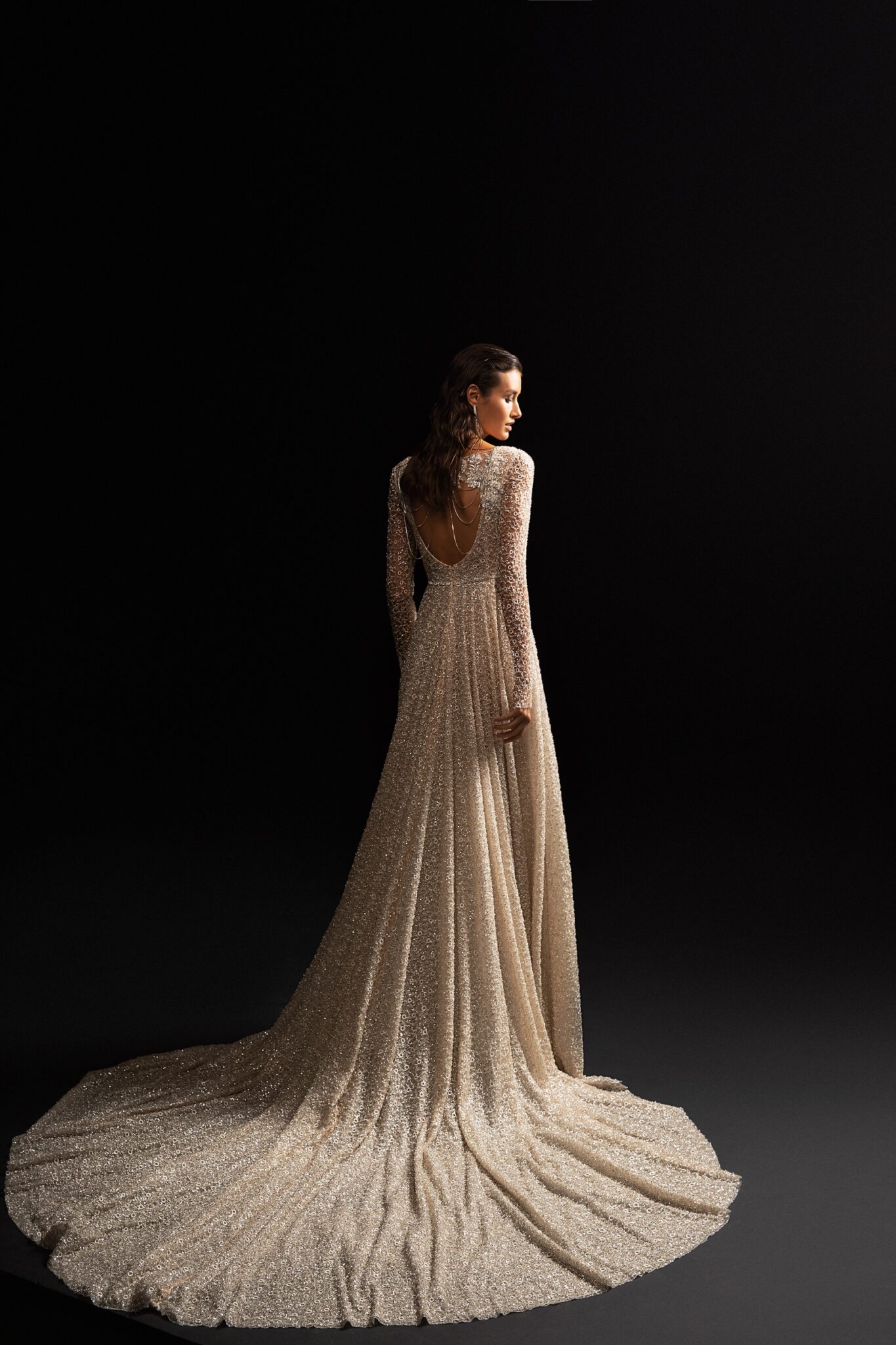 StardustA sparkly wedding gown with an attractive design. The fantastic skirt passes into a long train. The wedding gown is made of luxurious lace