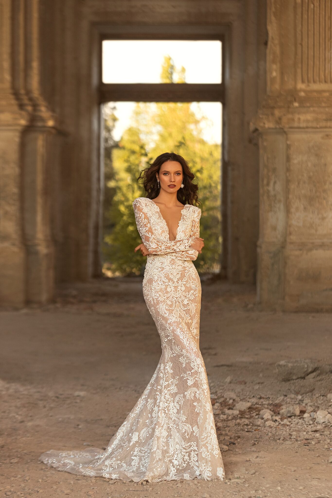 Golden HourGeorgina mermaid silhouette dress is made of spectacular lace decorated with beads. The lace and silhouette is perfectly matching with a transparent long sleeves and V-shaped neckline.
