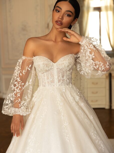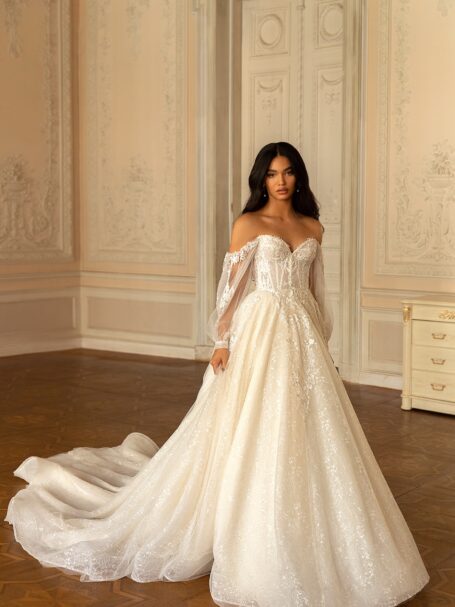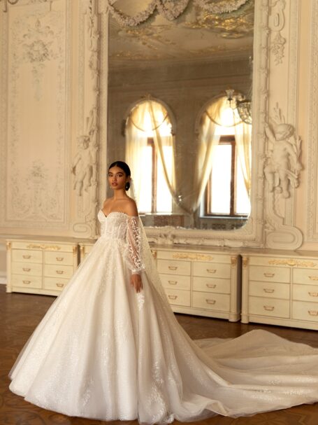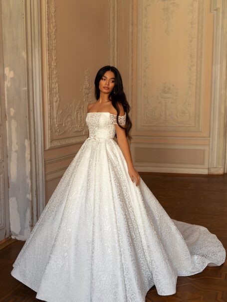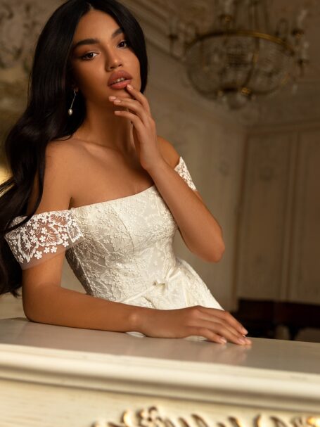 RomanceThere’s an undeniable allure to Gigi. Its sheath silhouette, adorned with the finest mikado silk, sparkle, promises a bridal look that’s nothing short of spectacular. It’s a gown that celebrates love, passion, and commitment in the most elegant way possible.