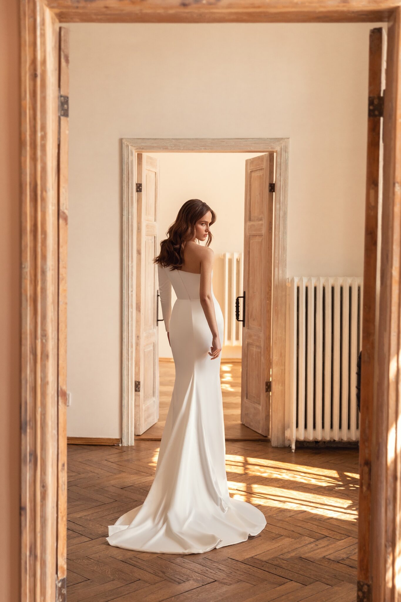 Less is more 2022Gillian is an absolutely eye-catching wedding dress. This dress of stylish mermaid silhouette is made of glossy satin. The fitted corset passes into a long sleeve on one hand and a fantastic volumetric flower made of Tulle and decorated with pearls is placed on the shoulder. The skirt is fitted on the hips and becomes a little flair down its length and has a small train.