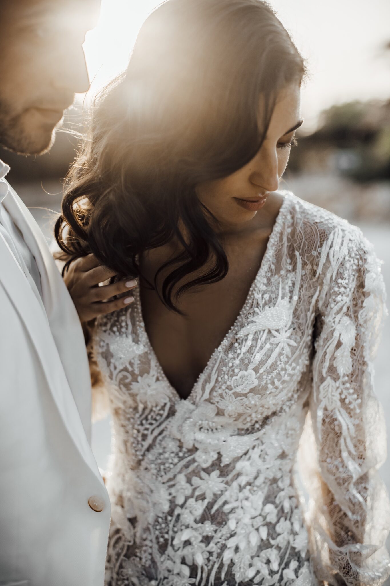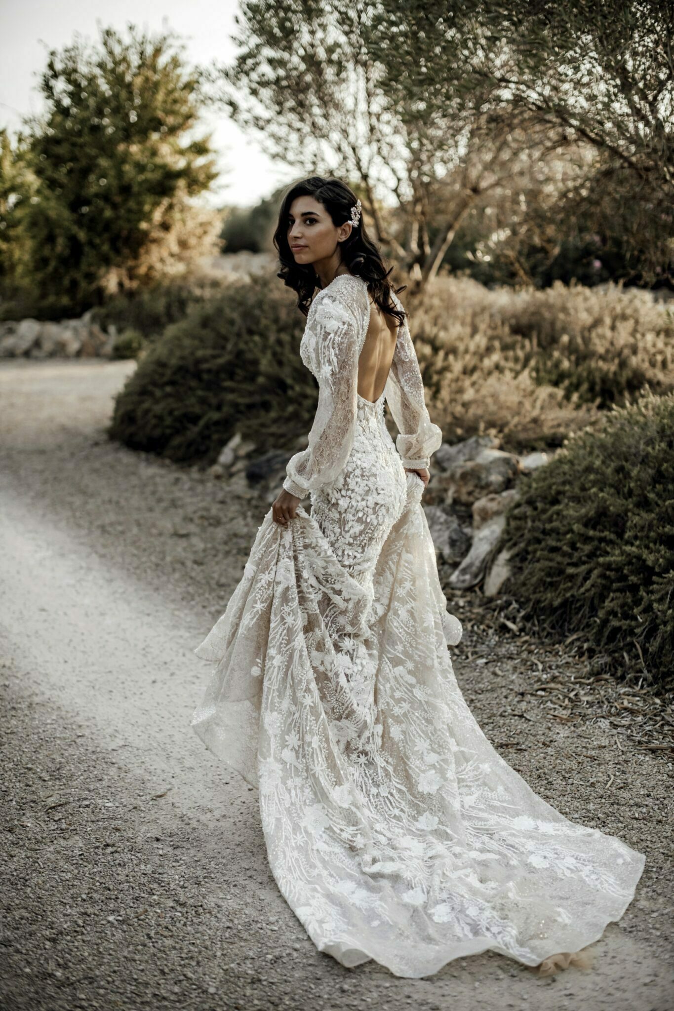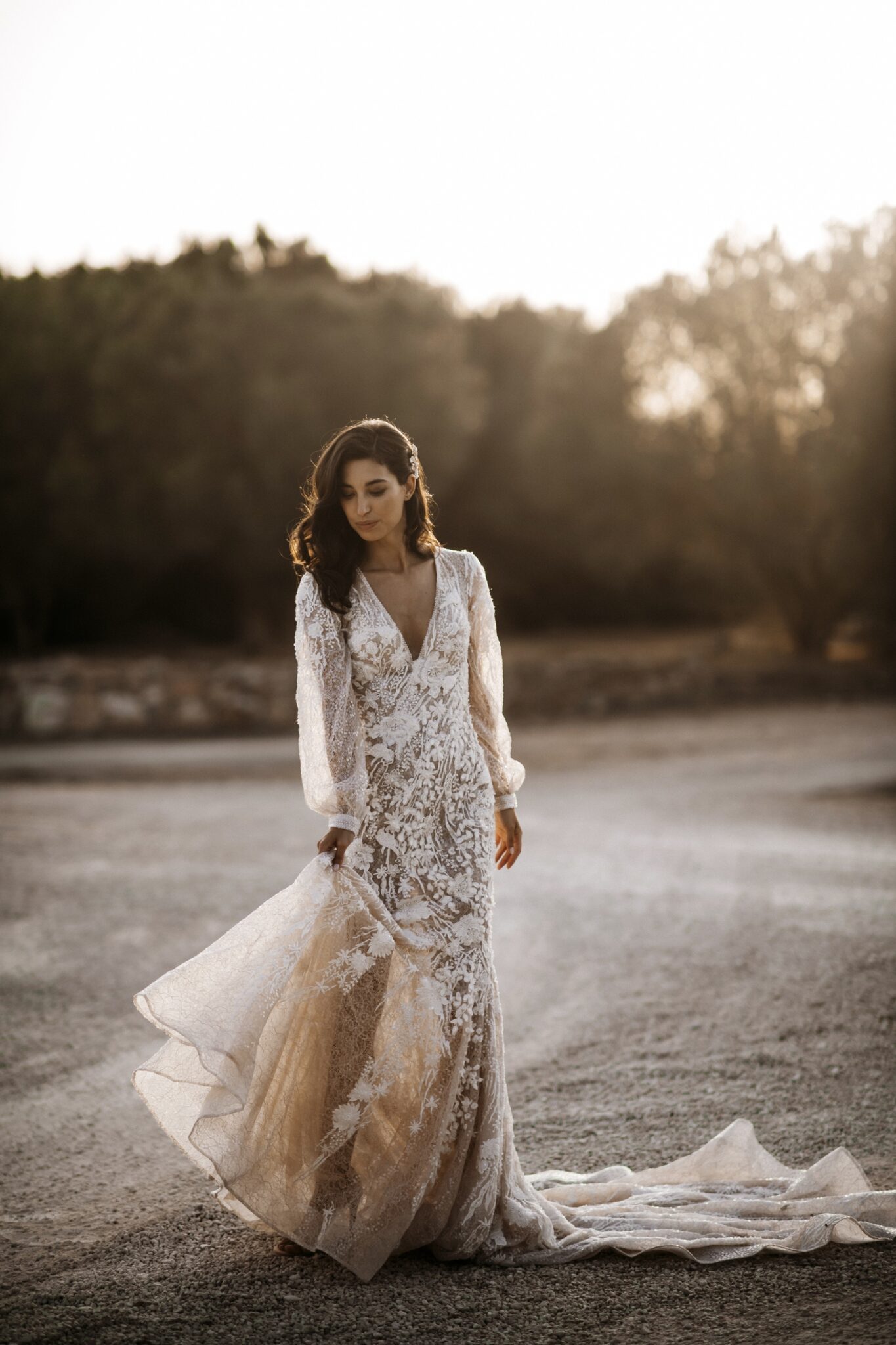Love storiesLaconic and tender Gloria wedding dress is decorated with lace, spangles, and crystals. The deep low neck is emphasized with small beads. The same beads are on cuffs of wide sleeves. The back of the dress is decorated with a round neckline. Skirt smoothly turns into a beautiful tail.