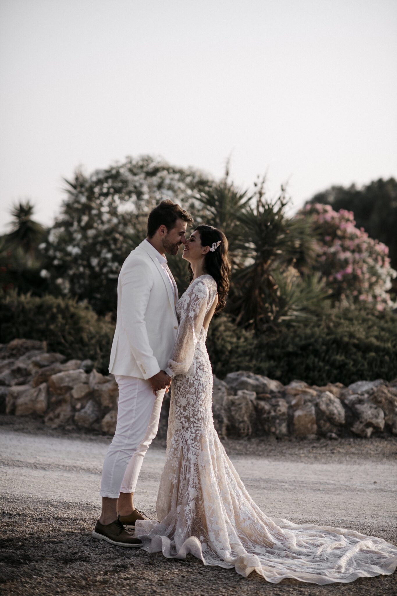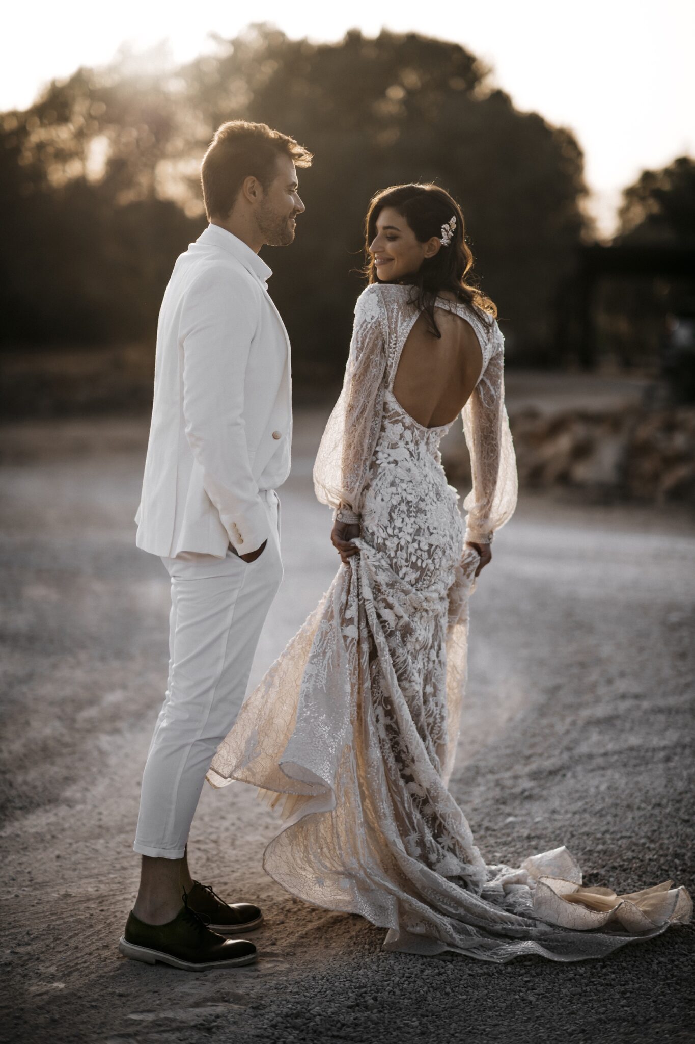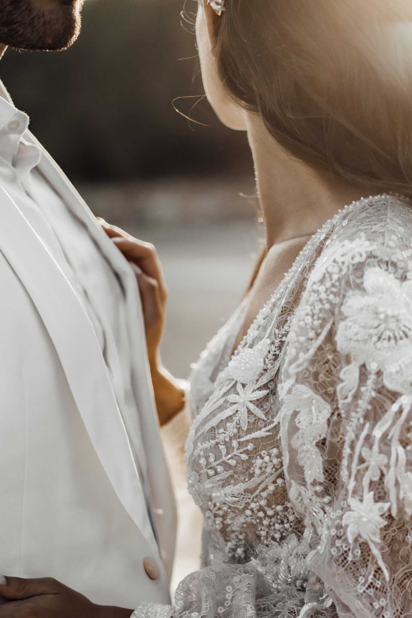 Love storiesLaconic and tender Gloria wedding dress is decorated with lace, spangles, and crystals. The deep low neck is emphasized with small beads. The same beads are on cuffs of wide sleeves. The back of the dress is decorated with a round neckline. Skirt smoothly turns into a beautiful tail.