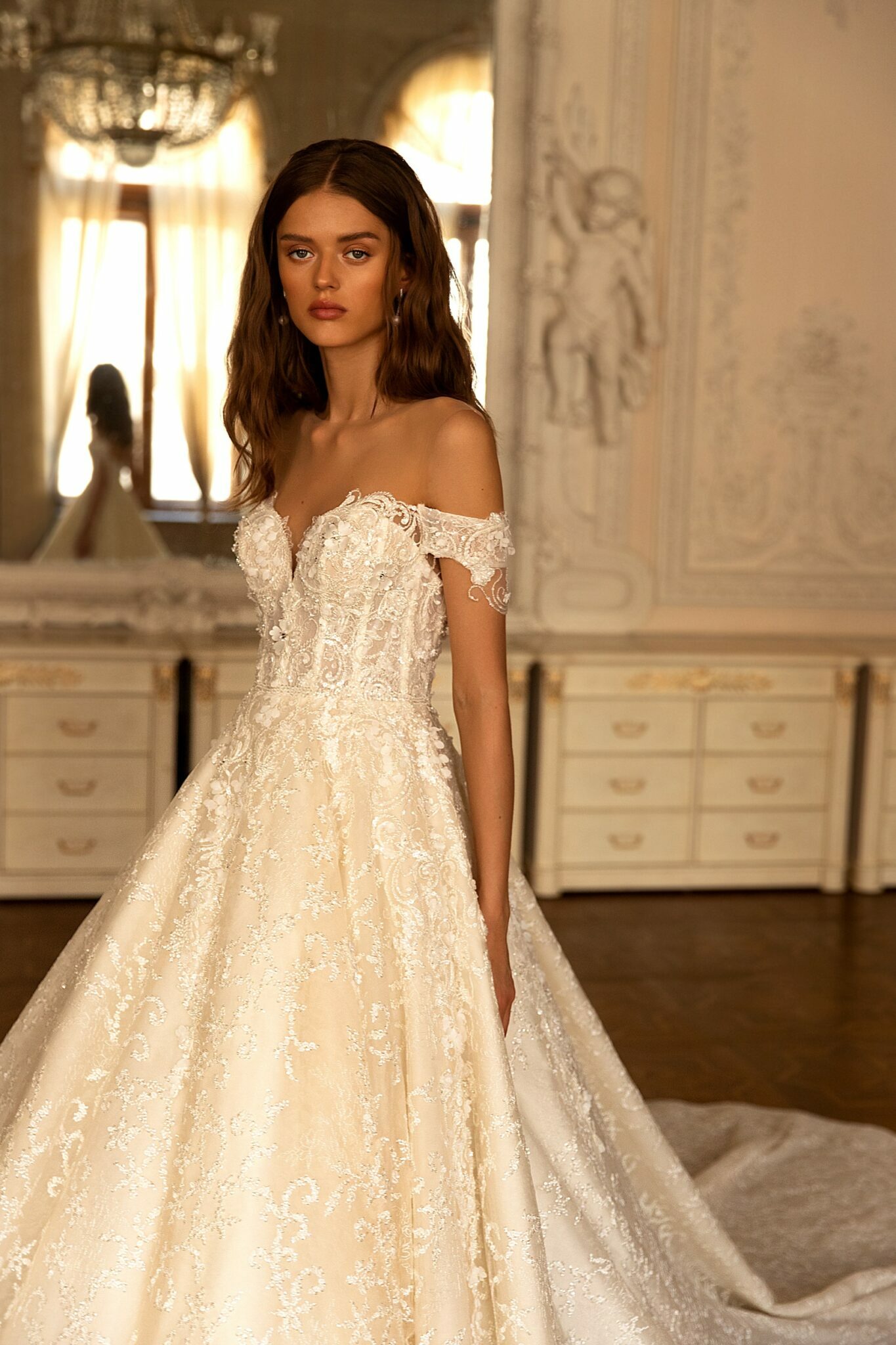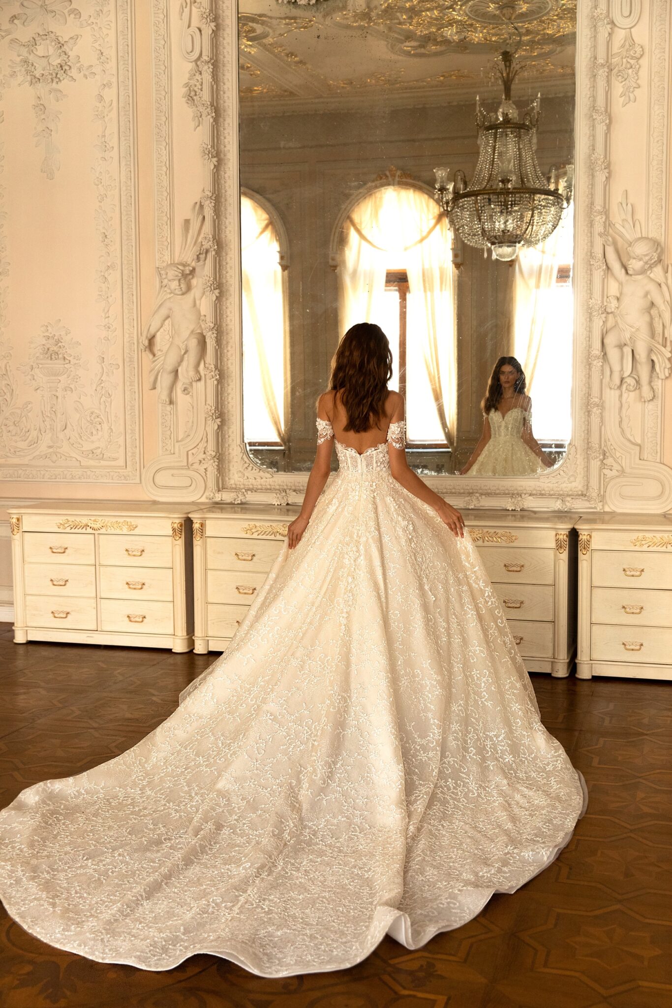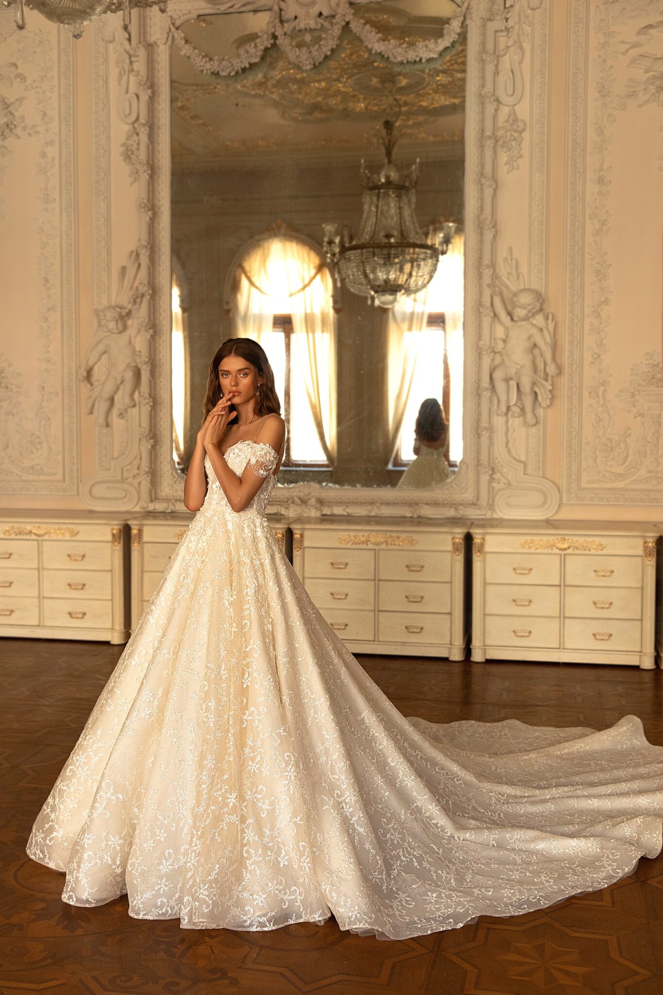RomanceLace Gracelynn A-line wedding gown looks fabulous. Lowered shoulders and a low neck look tender and romantic. Corsage with lowered shoulders is made of sophisticated lace. Veiling insets on the corsage looks fantastic. A skirt that is made of the same material sparkles on the sun. Long tail makes this outfit perfect. The dress is entirely decorated with small flowers and leaves. The long magnificent tail is worth noticing.