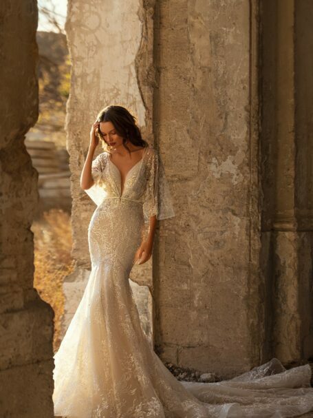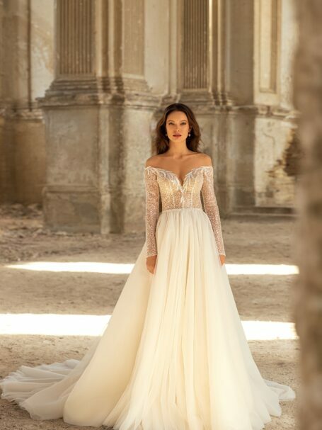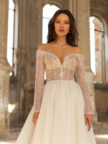 Golden HourDelicate Gwen gown it is a tender combination of sweetheart neckline, mermaid silhouette and off shoulders long sleeves. The corset is made of shiny fabrics and decorated with beads and pearls.