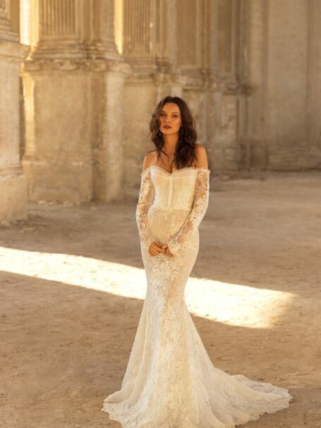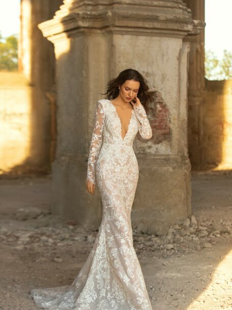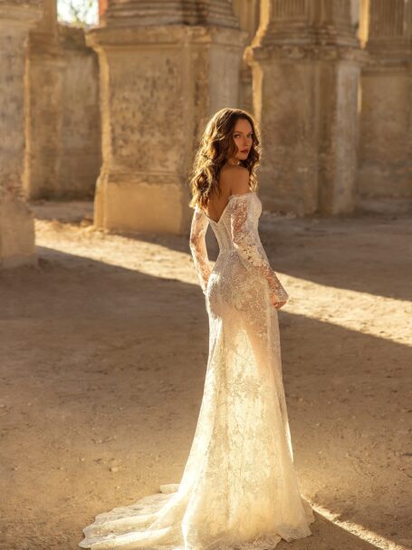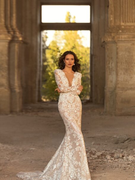 Golden HourHedley is dress with a V-shaped neckline and mermaid silhouette. The dress is decorated with shiny lace decorated with beads. The finish touch is made by uniquely shaped cape decorated with shiny beads.