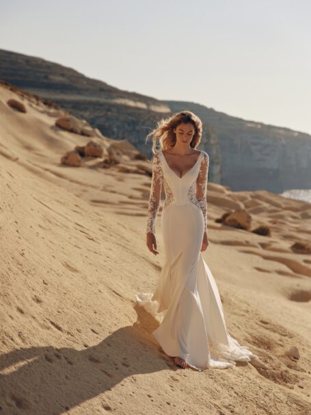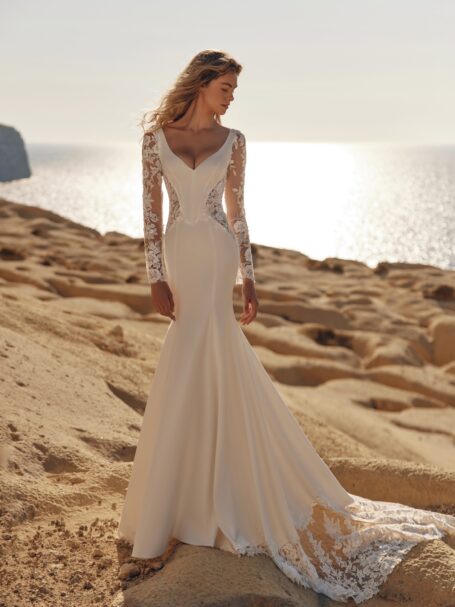 Perfect for brides seeking a bold and modern look with romantic lace details.