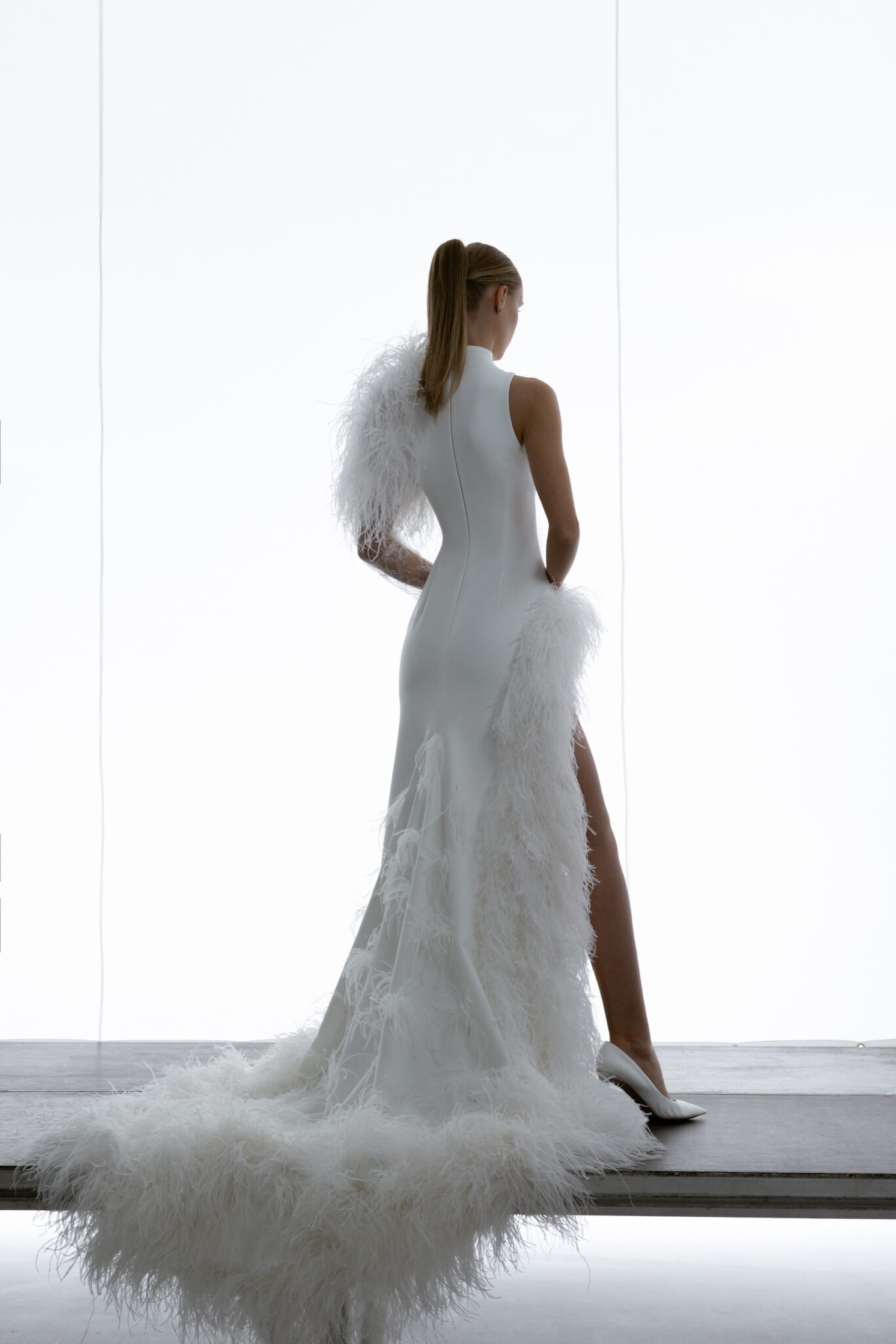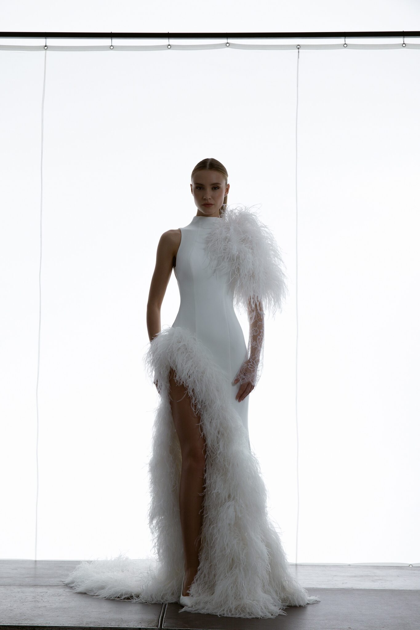 Special EditionA cutting-edge mermaid gown featuring a one-shoulder turtleneck embellished with rich feather detailing. Feathers also frame the hemline and side slit, bringing a fresh and bold finish to the look.