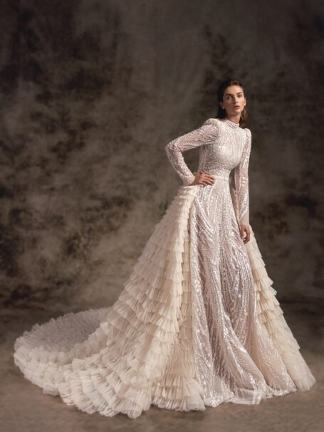 Notte d'OperaGlamorous and sexy with a sophisticated twist this statement glitter ballgown features a deeply plunged corset adorned in delicate beaded lace with long fitted sleeves and oversized shoulder pads. A super voluminous glitter skirt falls with numerous layers of ruffles and ends with a dramatic, pointed cathedral-length train.