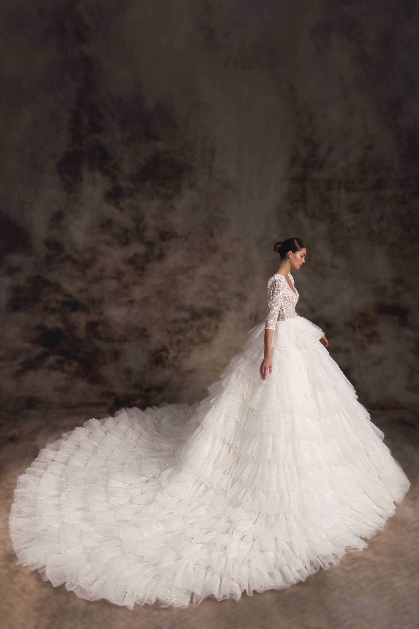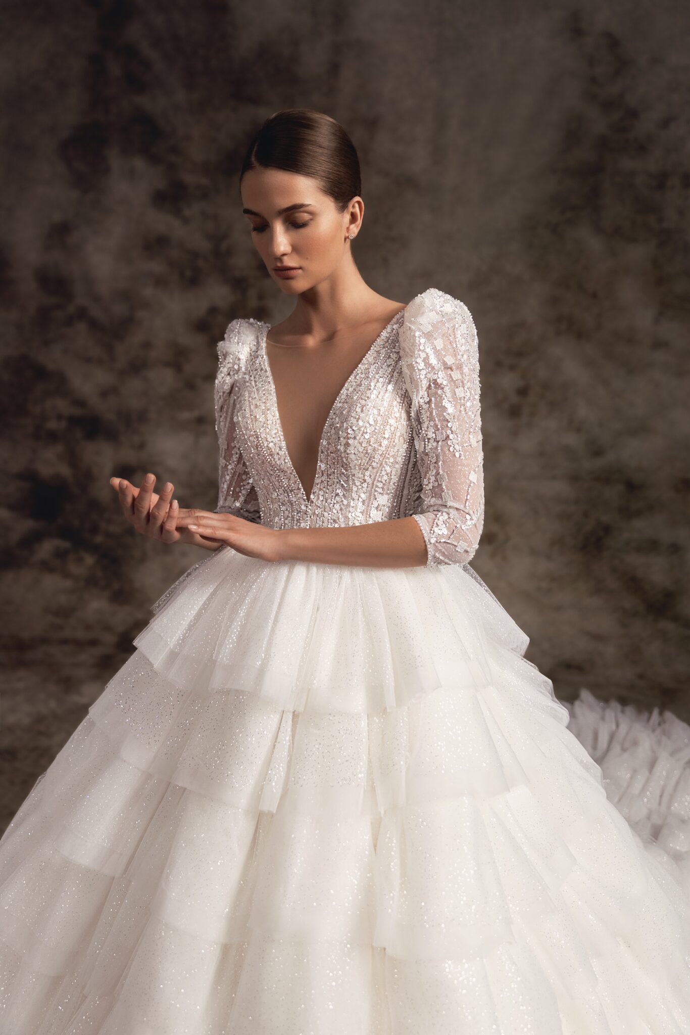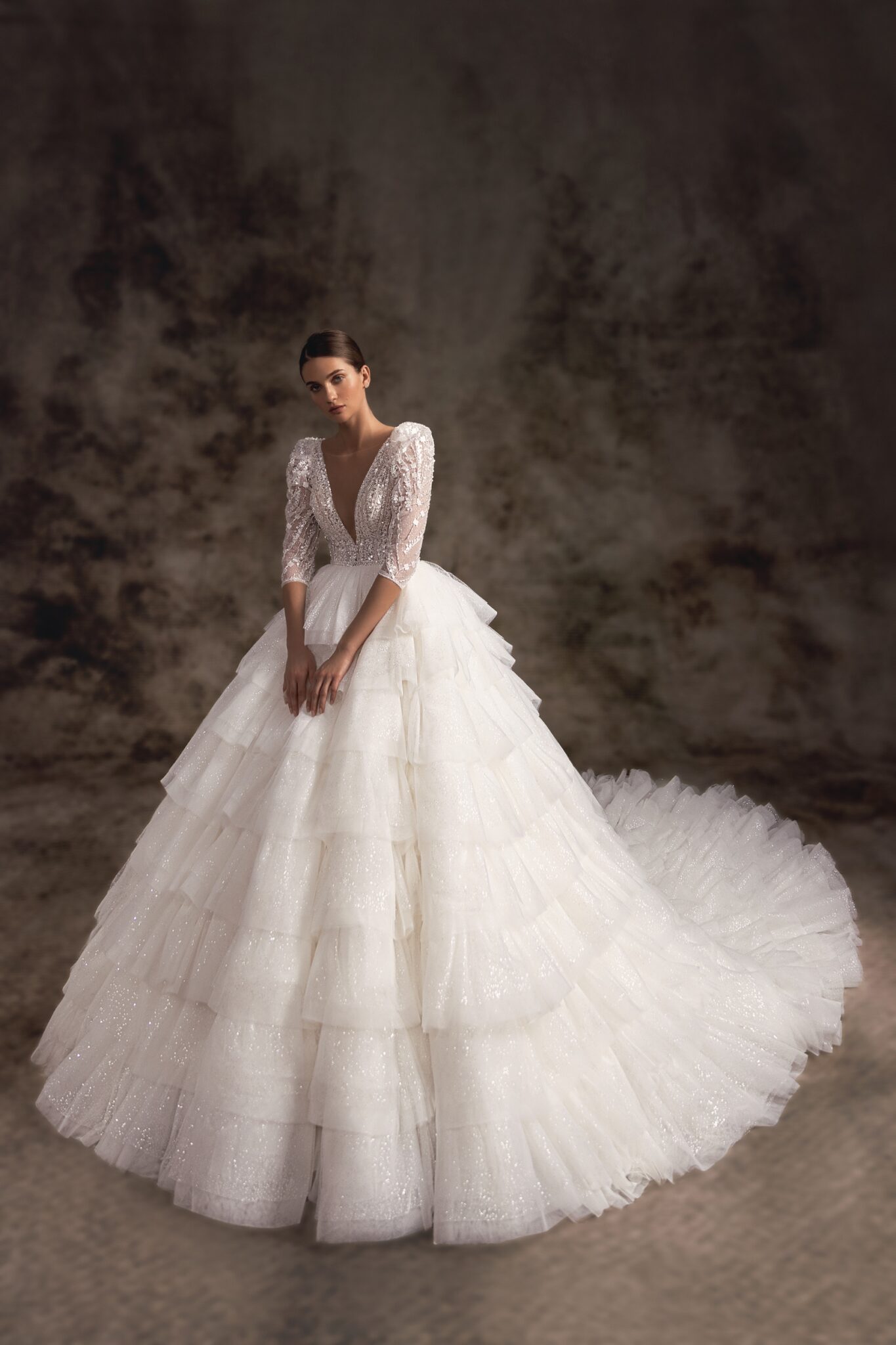 Notte d'OperaGlamorous and sexy with a sophisticated twist this statement glitter ballgown features a deeply plunged corset adorned in delicate beaded lace with long fitted sleeves and oversized shoulder pads. A super voluminous glitter skirt falls with numerous layers of ruffles and ends with a dramatic, pointed cathedral-length train.