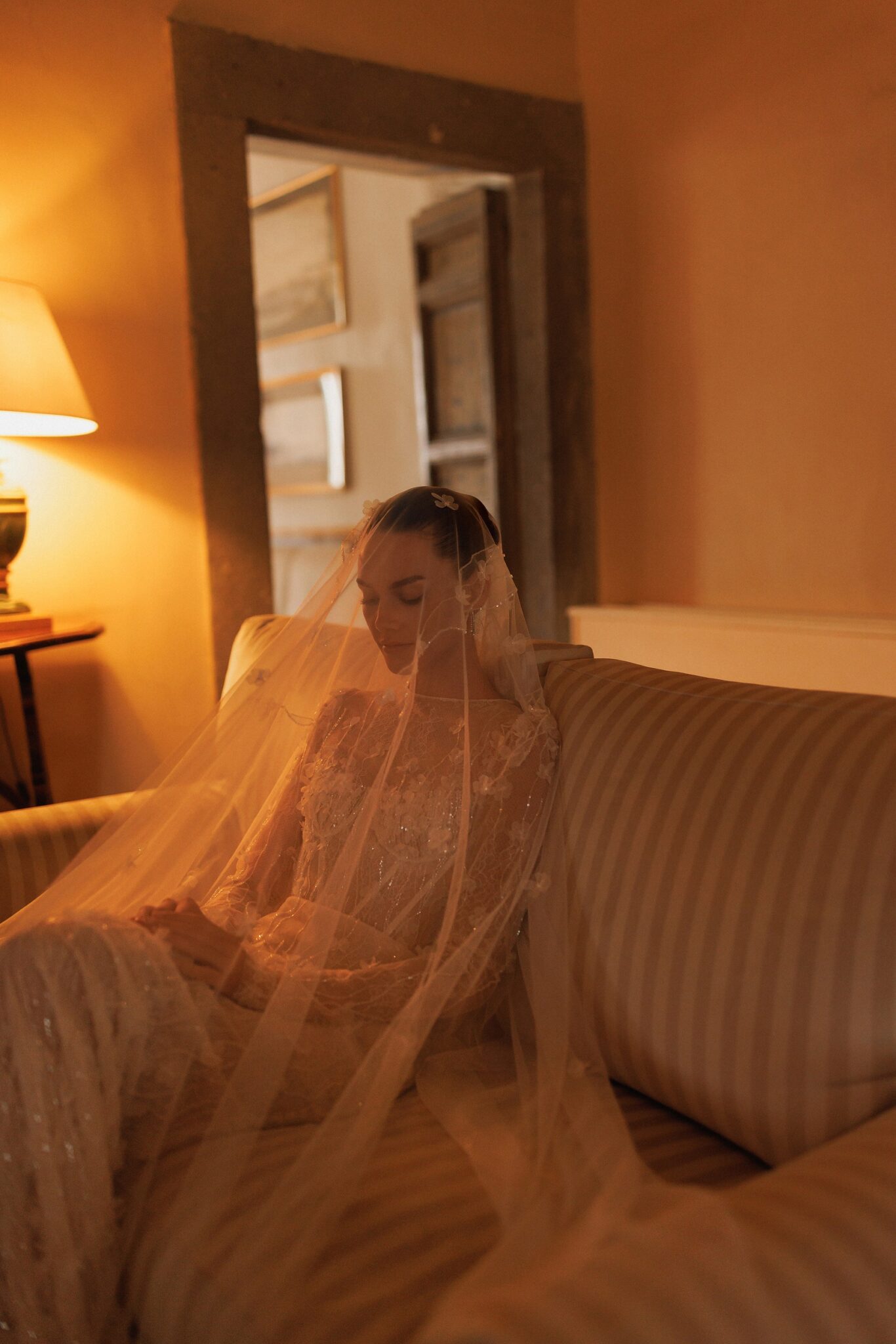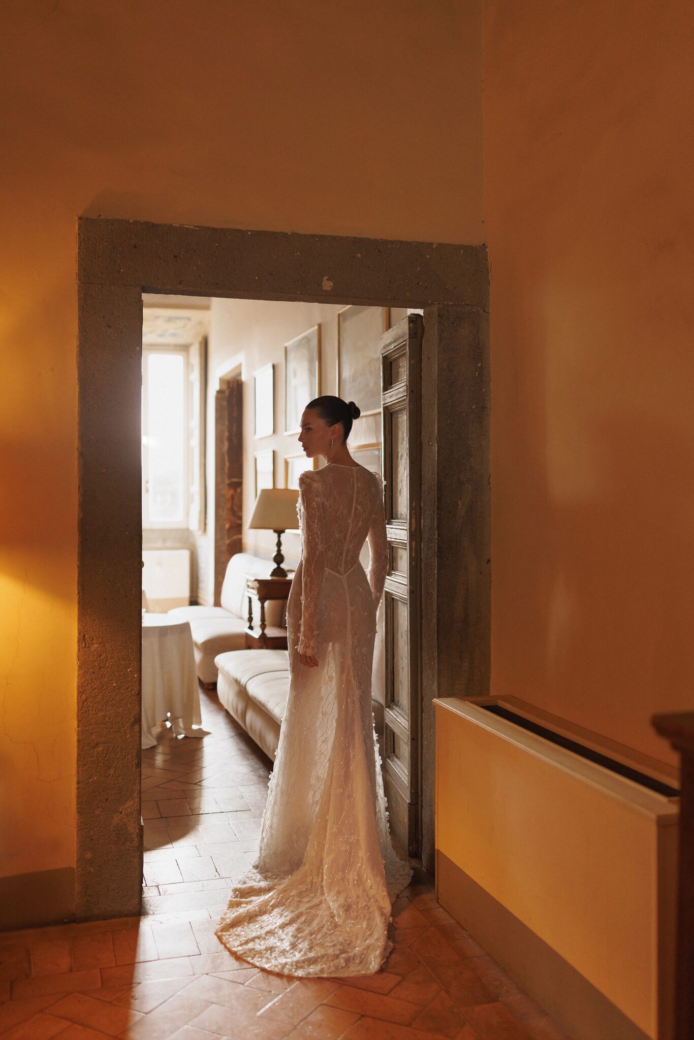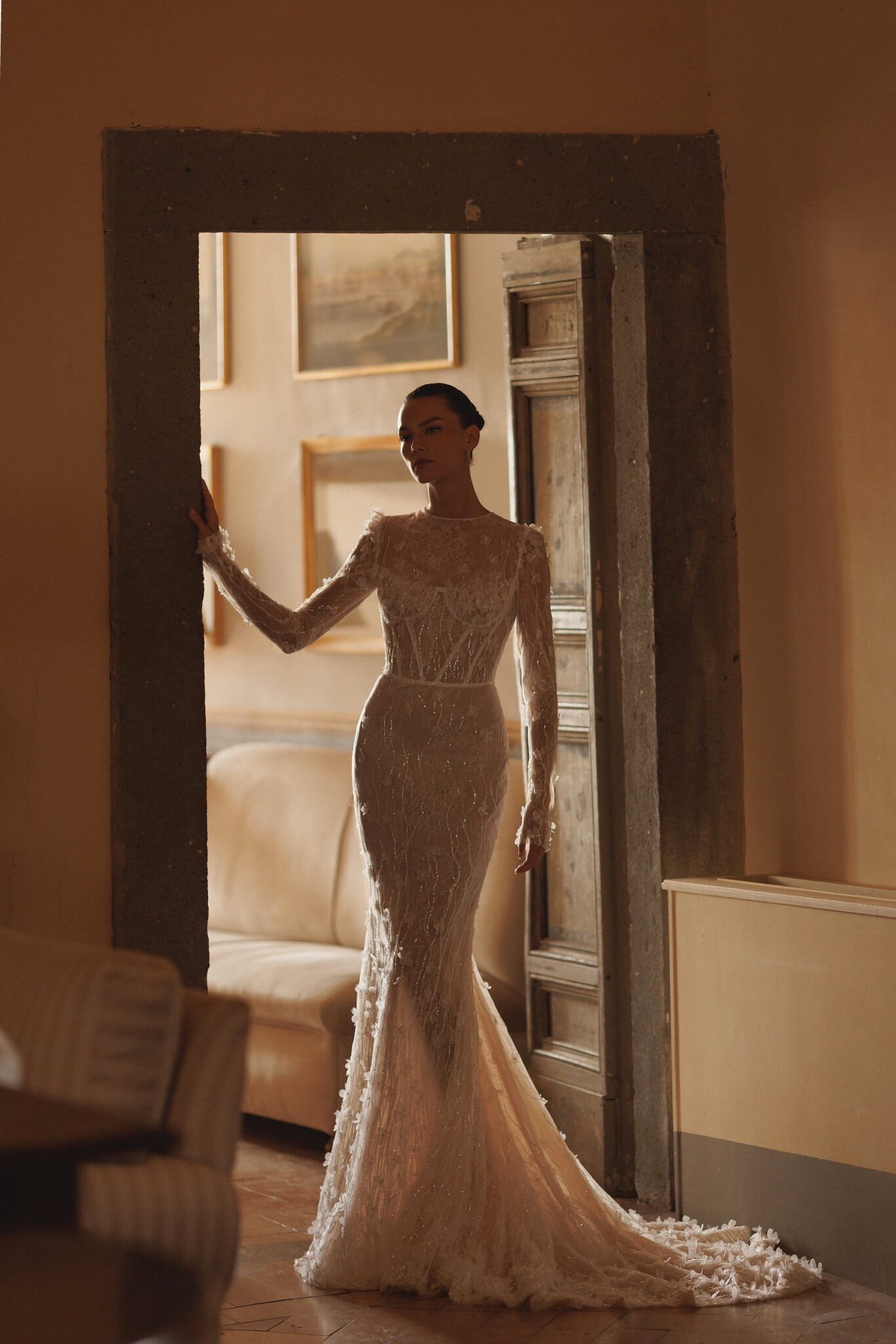 L'UnicoTranslucent femininity: round neck long sleeves top with detailed corset-like base and mermaid tail skirt. The whole dress hand-embroidered with small floral details.