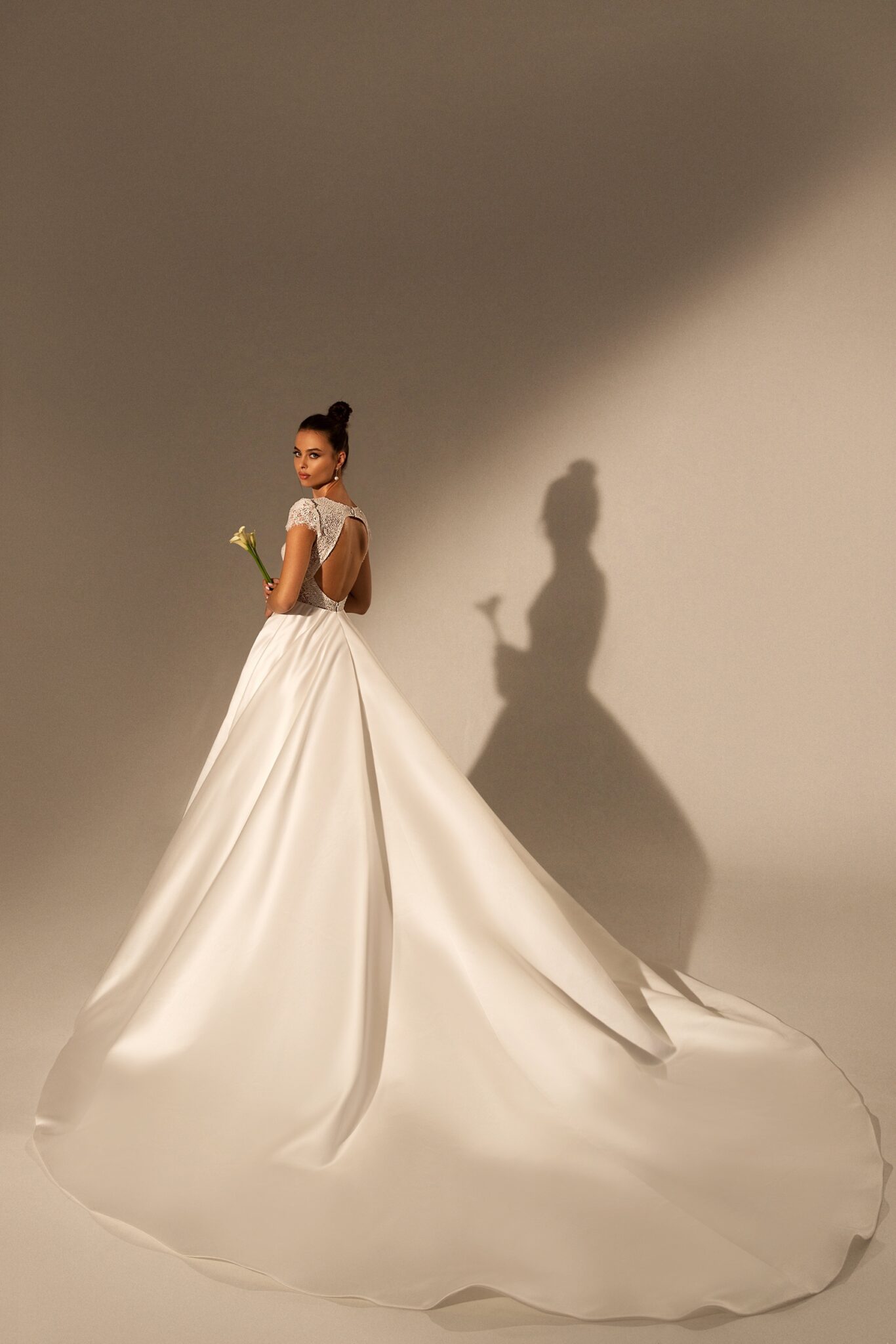 MuseA gorgeous wedding dress with a V-neckline is an absolute masterpiece. The top is made of lace and a long skirt is made in satin.
