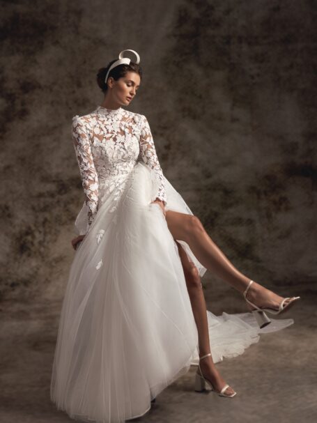 Notte d'OperaA femininely structured mermaid gown adorned with delicate hand-embroidered lace and decorated with sheer nude side panels. A corset is embellished with high collar, long fitted sleeves and shoulder pads that add solemnity. A super-fitted trumpet skirt is as striking as it is sexy proceeding into a neat sweeping chapel train. For a more opulent look a dress can be accomplished with a detachable overskirt made of cascading rows of Tulle ruffles.