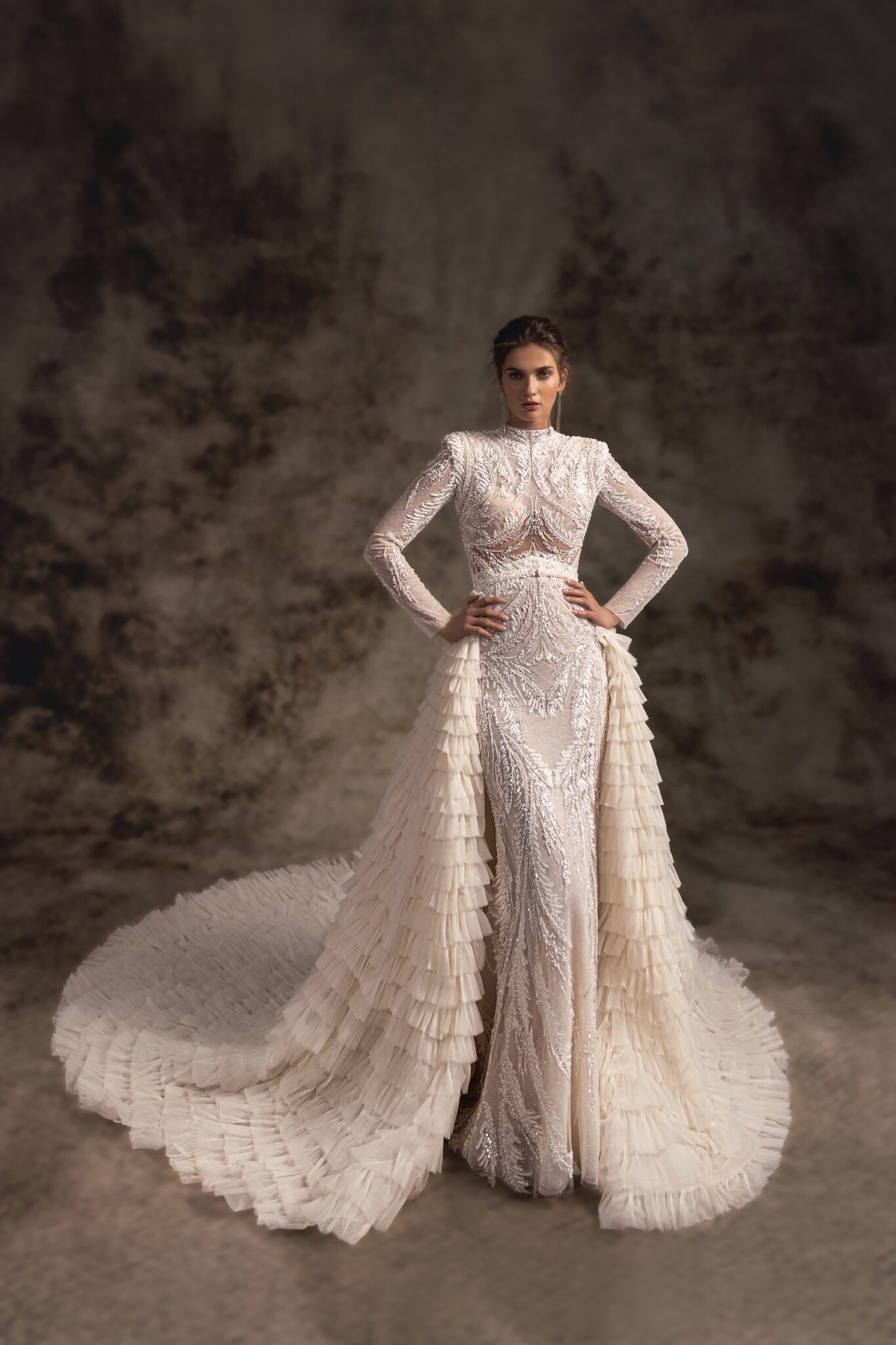 Notte d'OperaA femininely structured mermaid gown adorned with delicate hand-embroidered lace and decorated with sheer nude side panels. A corset is embellished with high collar, long fitted sleeves and shoulder pads that add solemnity. A super-fitted trumpet skirt is as striking as it is sexy proceeding into a neat sweeping chapel train. For a more opulent look a dress can be accomplished with a detachable overskirt made of cascading rows of Tulle ruffles.