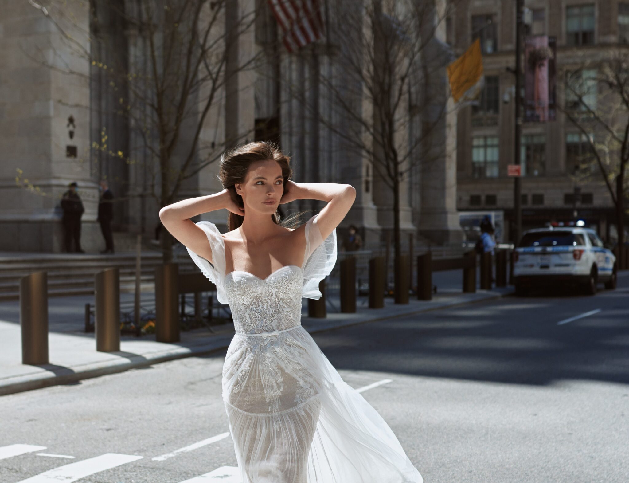 Love in the CityThis tender and girly wedding dress wil make you feel like a princess. A combination of fabrics and A-line silhouette look gorgeous. The strapless corsage and low neck with lowered shoulders with transparent falbalas are decorated with lace. The sheath dress has the same pattern and the lightweight skirt made of veiling can be found over it. The small elegant bow accentuates the waistline.