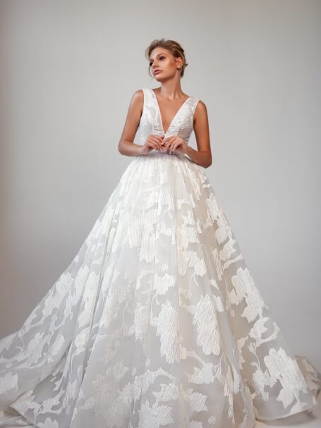Pure EssenceExperience the magic of Ines. Its sheath silhouette, combined with the opulence of crepe, is a bridal masterpiece. It’s a gown that promises to set the bride apart, ensuring she feels like royalty on her big day.