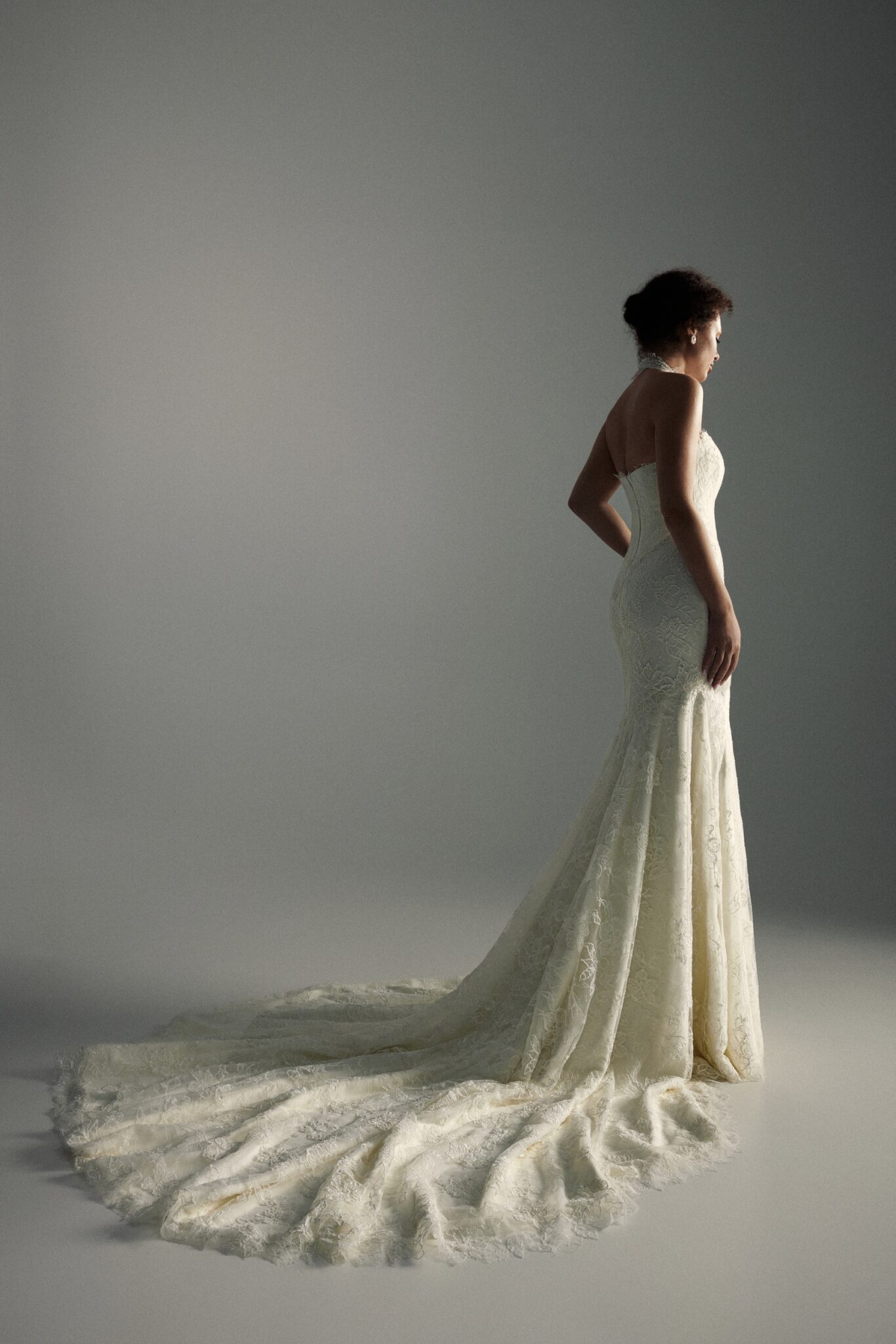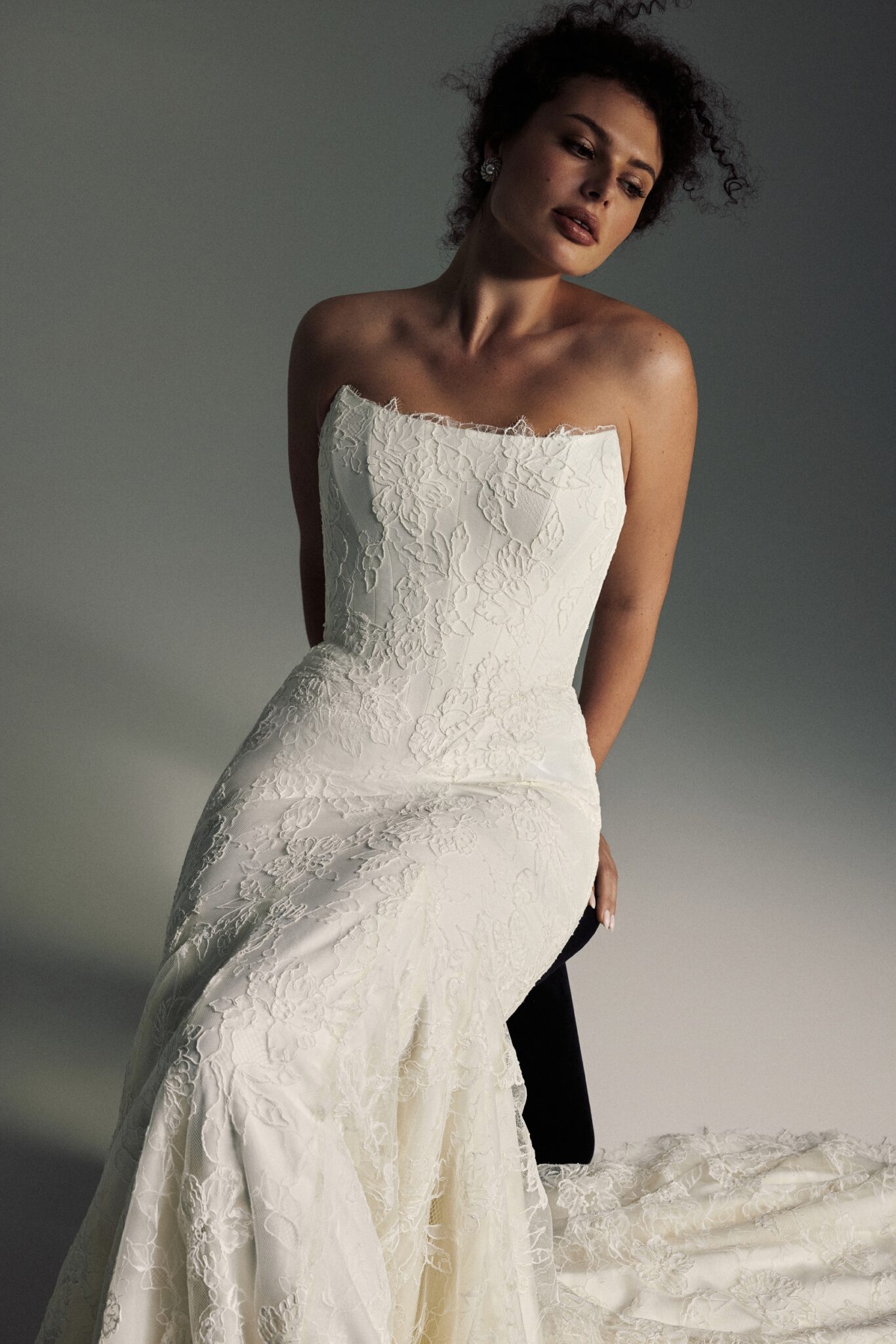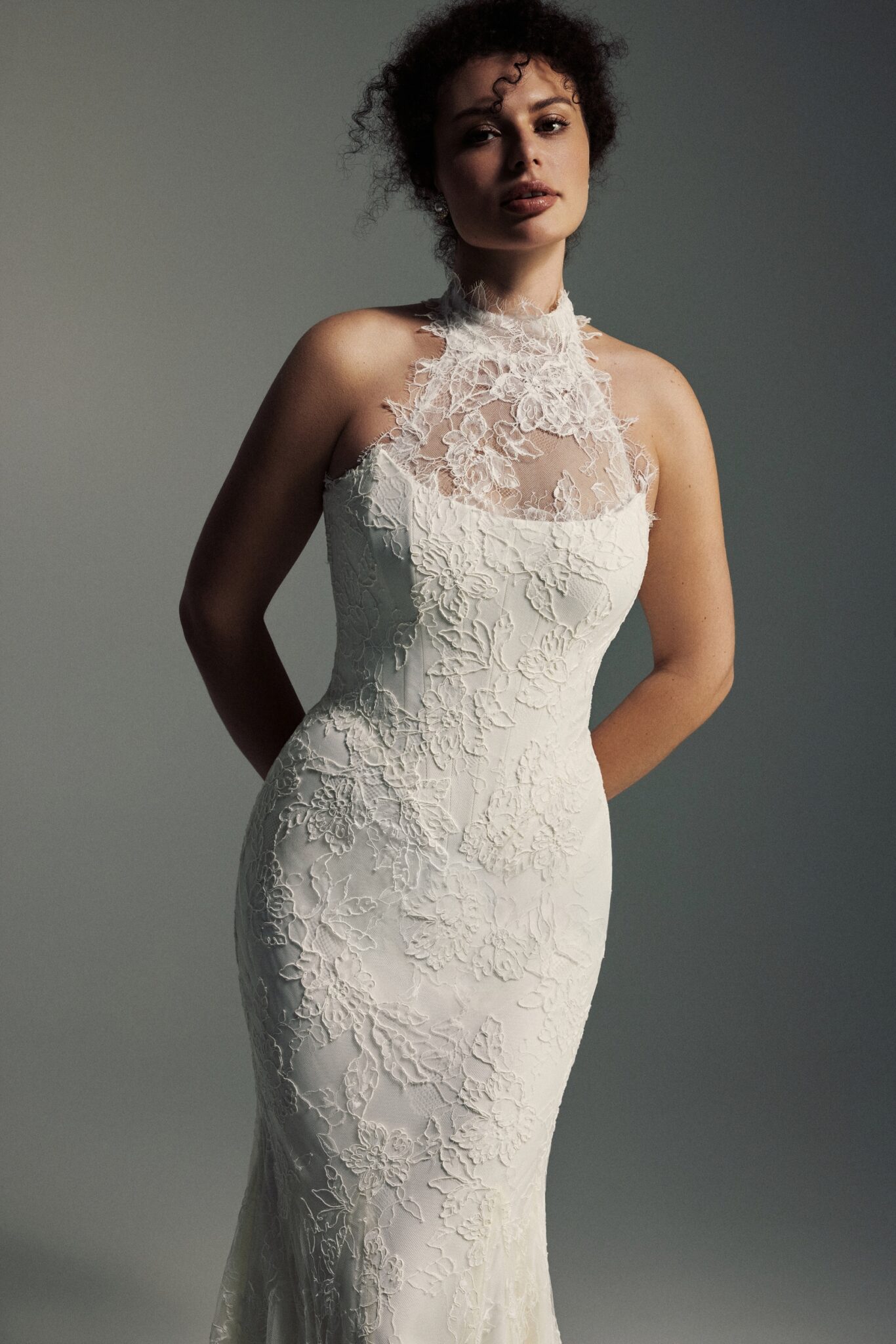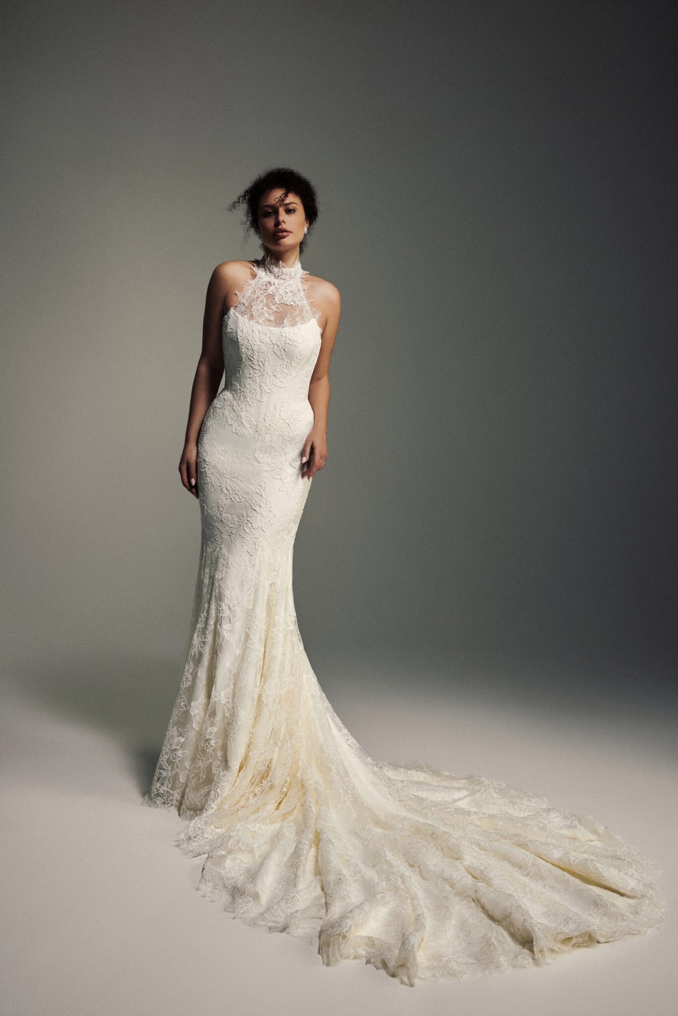 Blooming LoveIris is a refined expression of romance and craftsmanship, featuring a lace mermaid silhouette with a sculpted Basque waist that accentuates the figure with elegance. A strapless corset forms the foundation of the design, complemented by a detachable high-neck lace detail in an intricate floral pattern, flowing into a dramatic cathedral-length train for a look that is both timeless and breathtaking.
