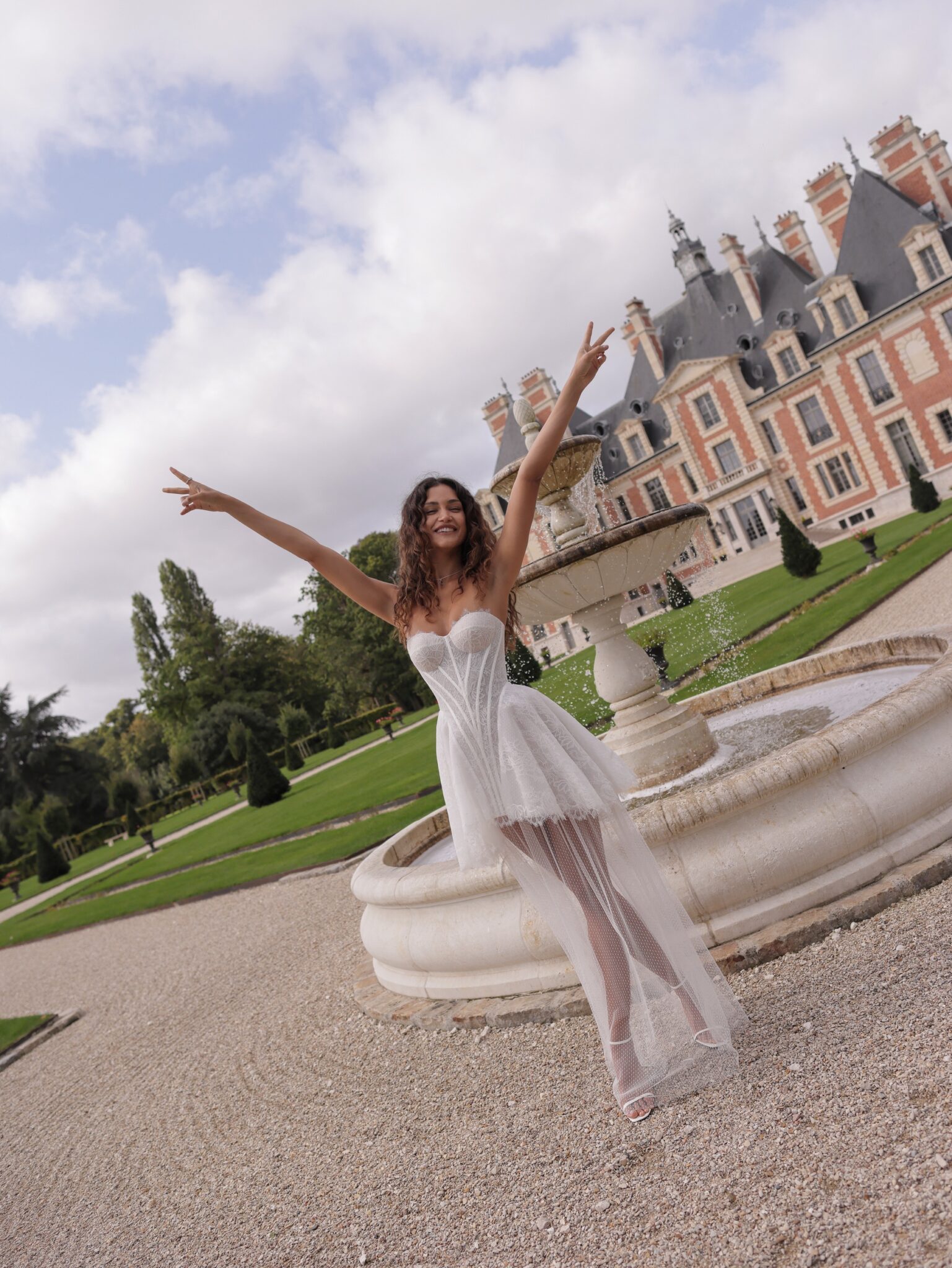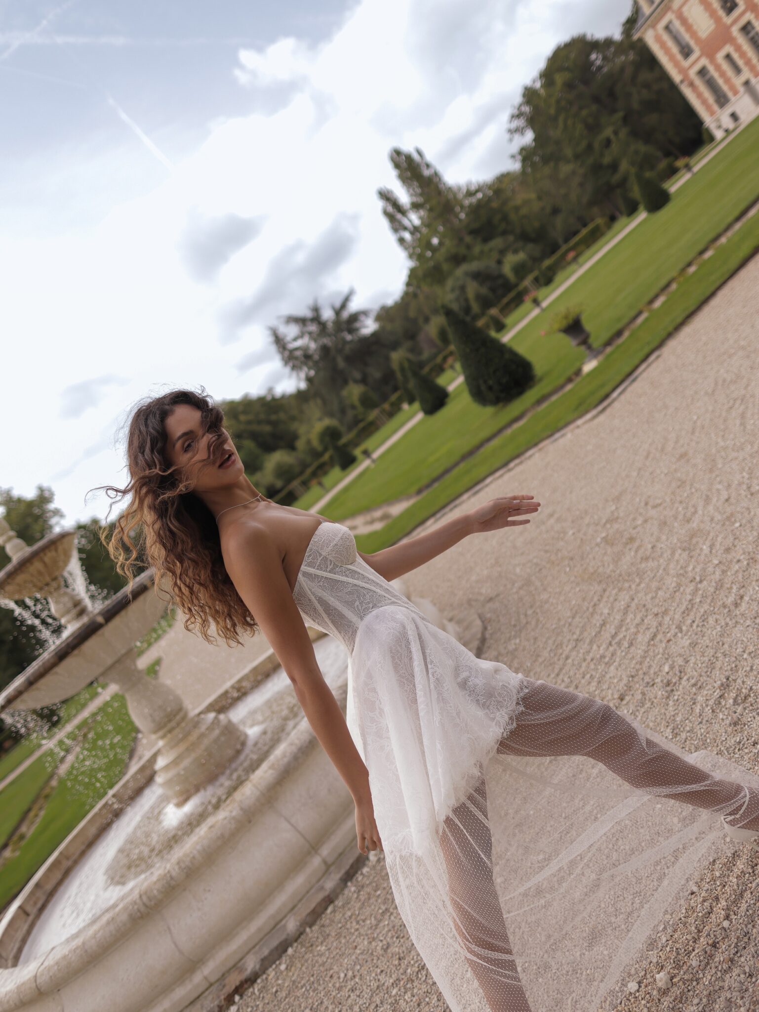 White SwanDelicate mini dress with an additional mesh maxi under-skirt. The bodice features a plunging neckline and is adorned with layered lace fabric. The voluminous skirt, slightly pleated on the sides, gives the design a playful air.