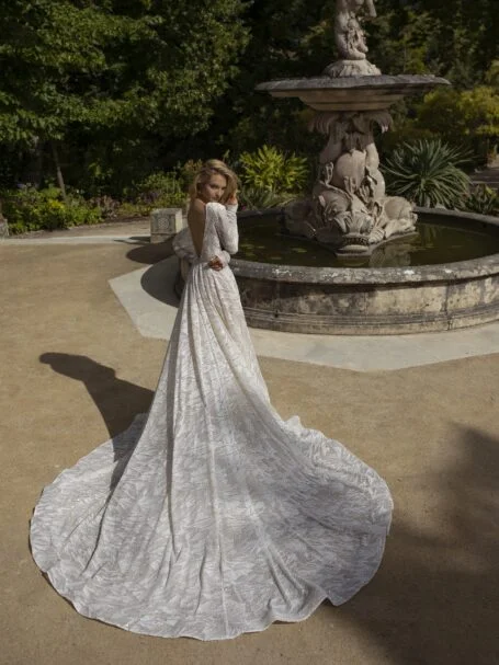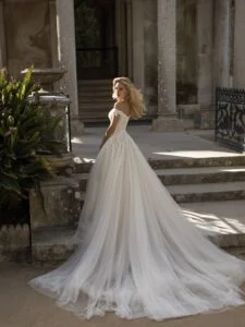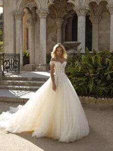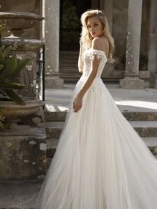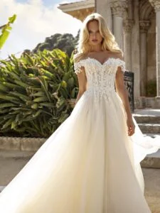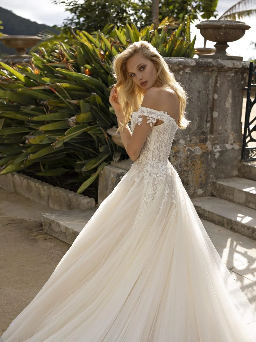 Lisbon VibesJolie bridal gown is a fantastic combination of lace and veiling. A corsage with lowered shoulders is entirely decorated with small lace flowers that highlight a waistline. A loose skirt that is made of veiling creates a laconic silhouette.