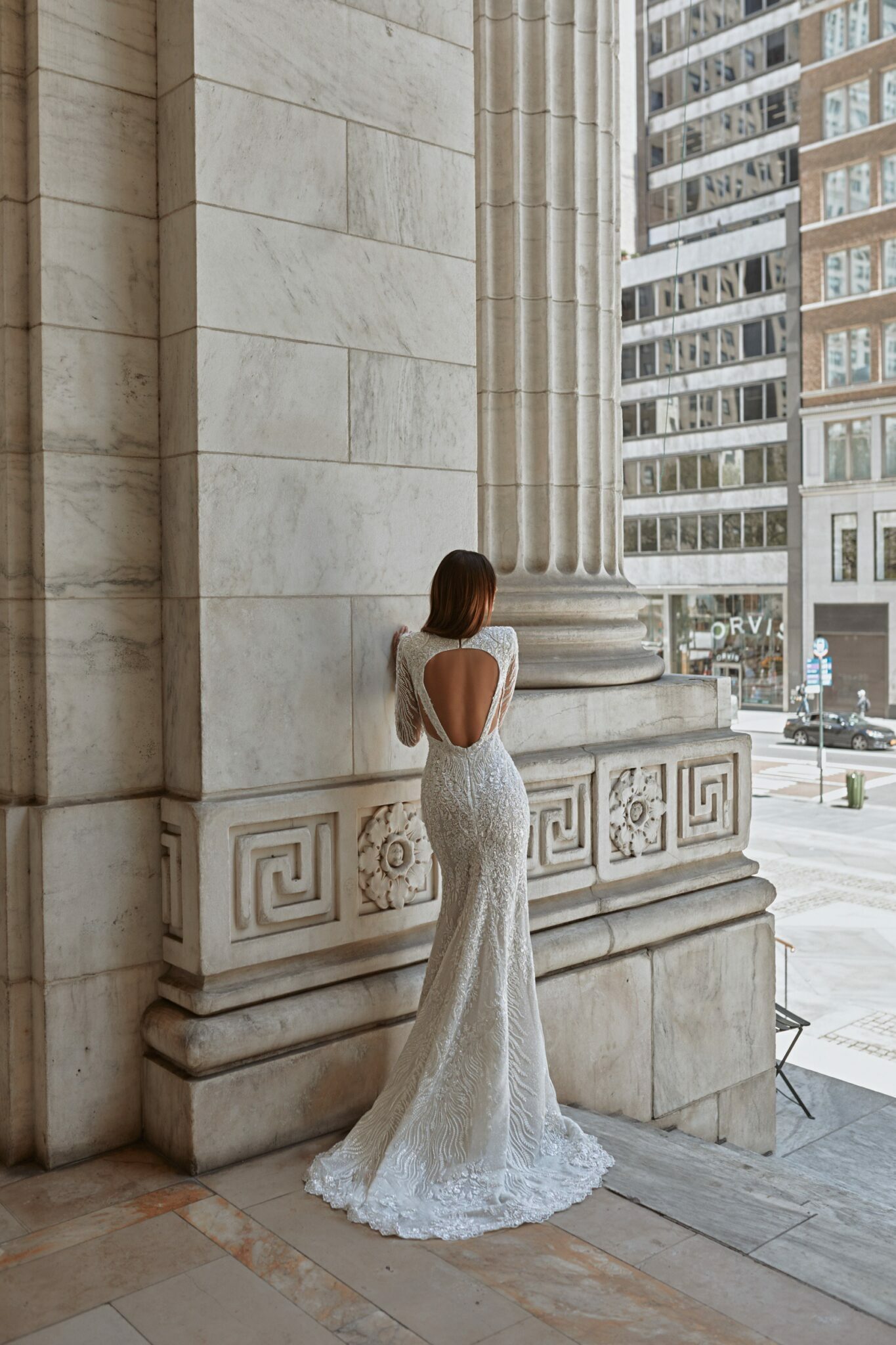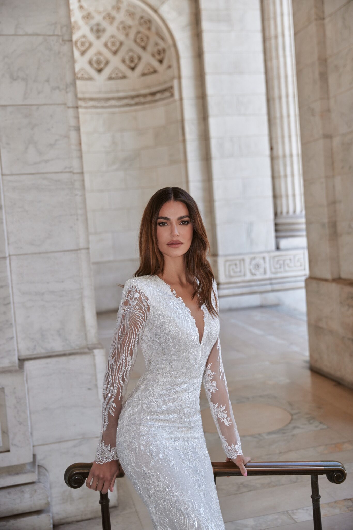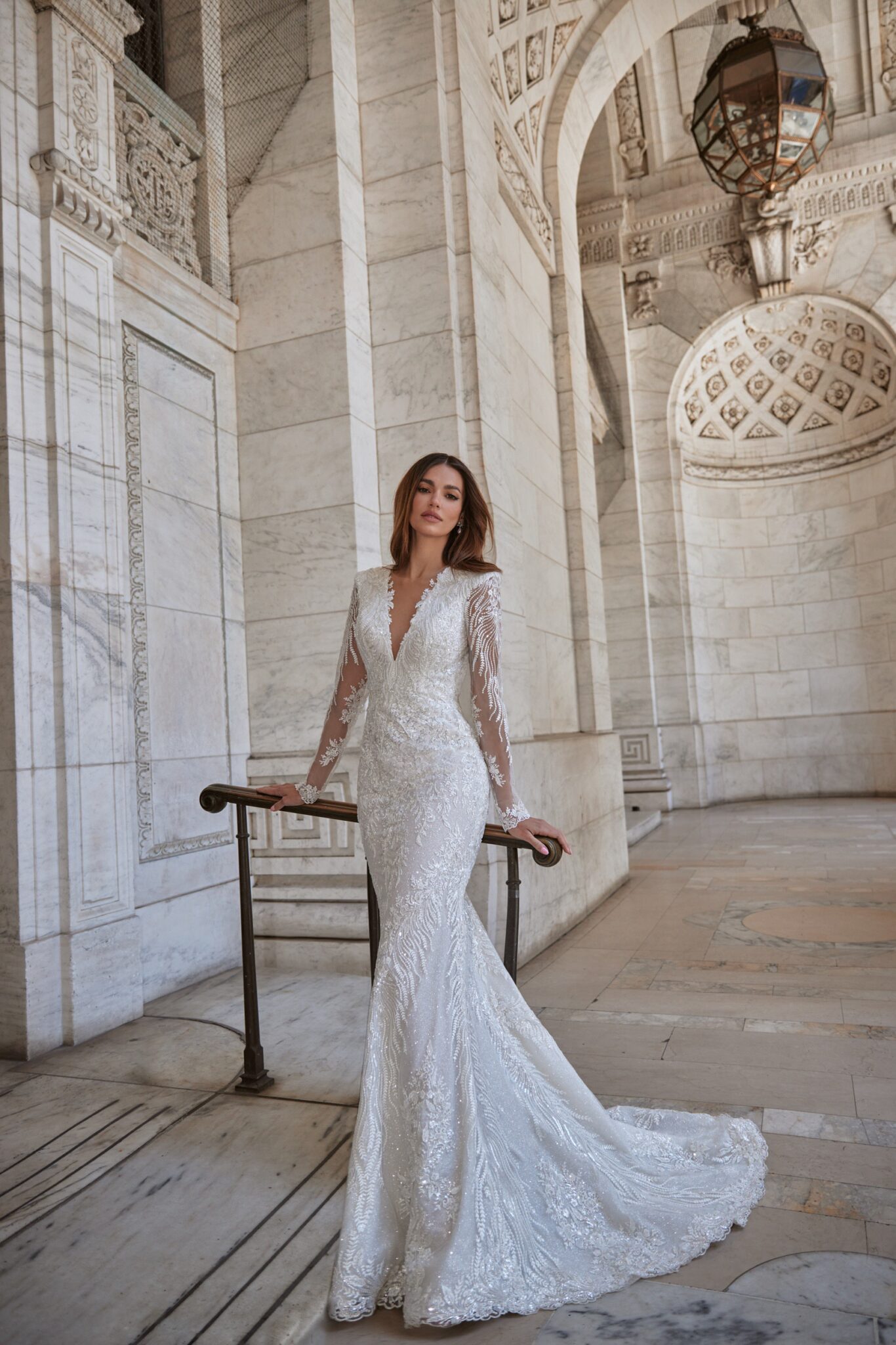 Love in the CityJordan wedding dress is of classic mermaid silhouette that accentuates the bride’s figure. The bridal gown is decorated with floral lace embroidered with beads, spangles and crystals along the whole length. The long sleeves are made of translucent lace decoated with pearls and sequins. A deep V-neckline makes this dress more seductive. A spectacular detail is a rounded neckline at the back of a dress. The fitted Straight skirt is made of the same embroidered lace and has a small train.