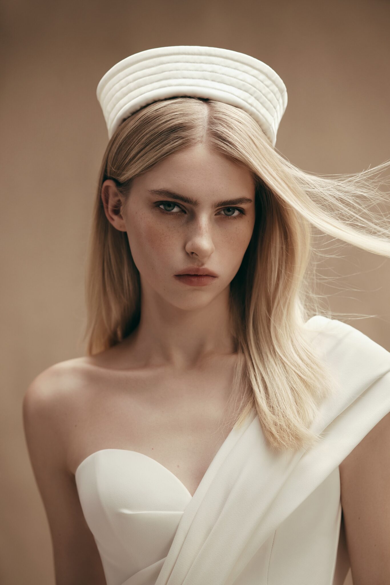 PersonalityJudy is an extraordinary option for a bold bridal look. Cropped asymetric corset with basca and asymmetric one-shoulder neckline is accomplished with Straight cut ankle length trousers made of white crepe-satin.