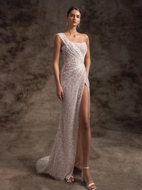 Stardust, Plus Size, Sample SaleThis tender wedding gown has a minimalistic and interesting design. The dress is combining a mixture of a mermaid silhouette unique ruffle train