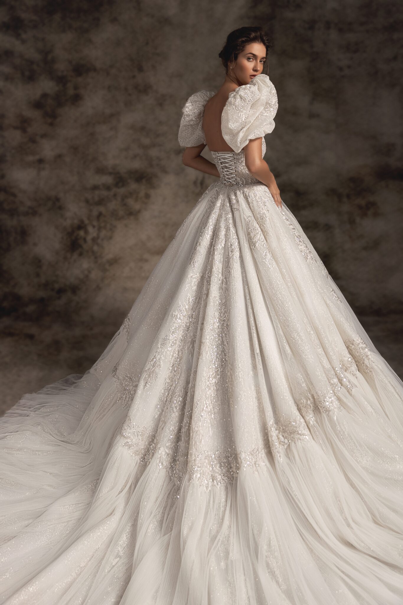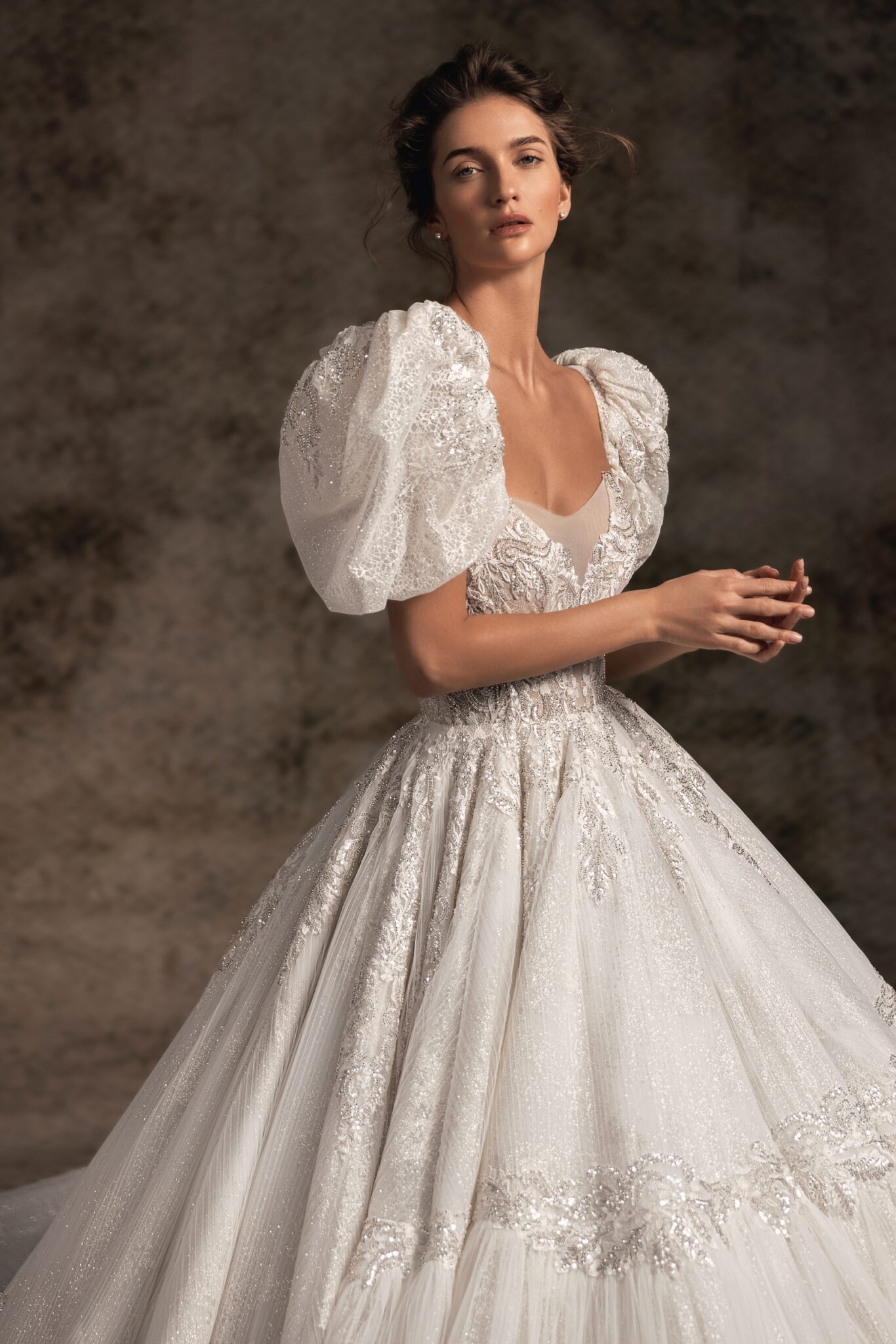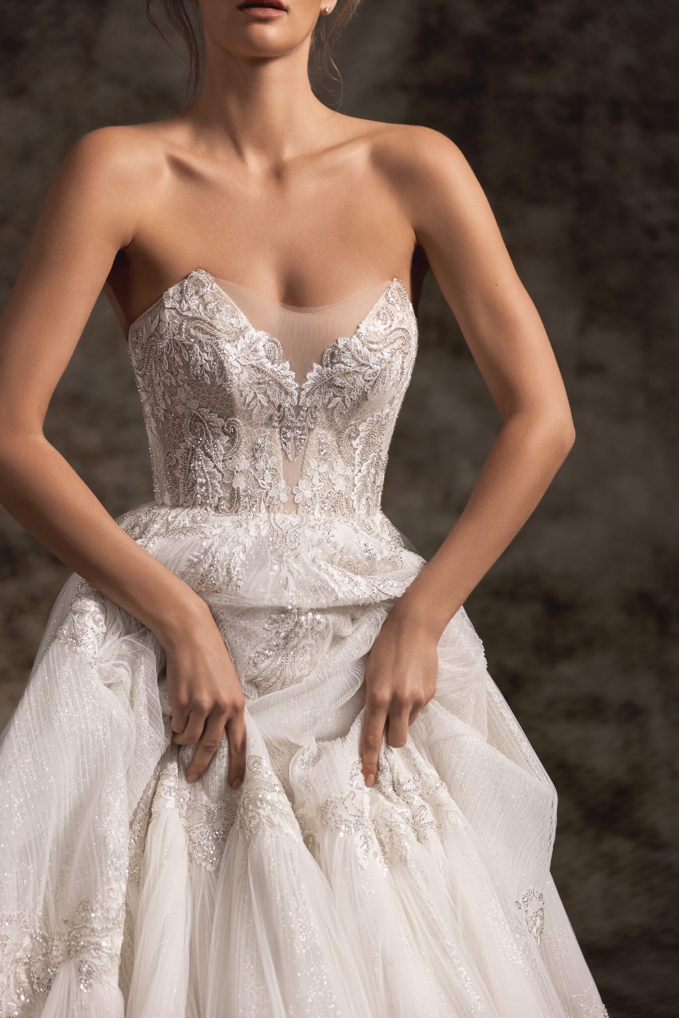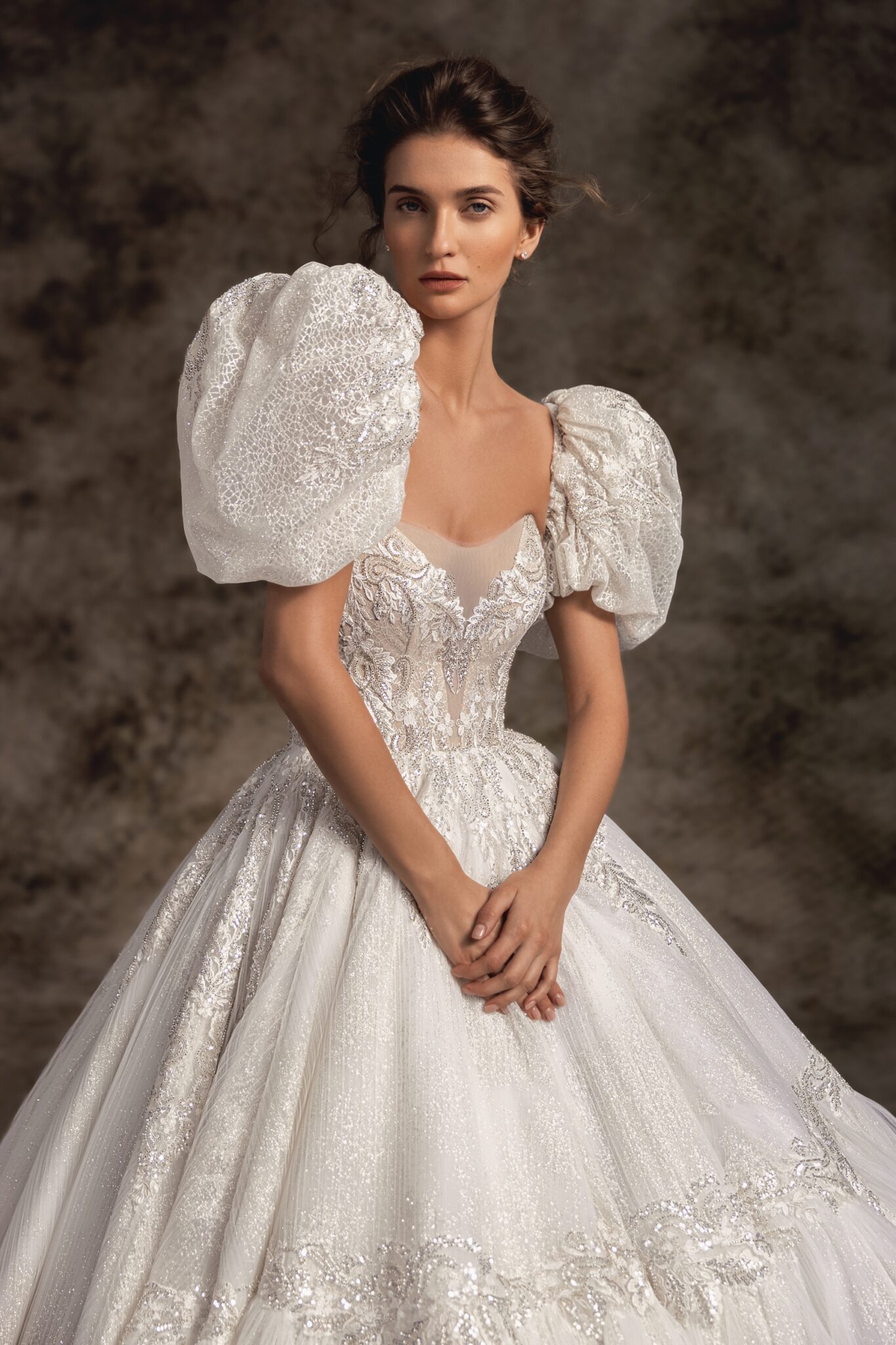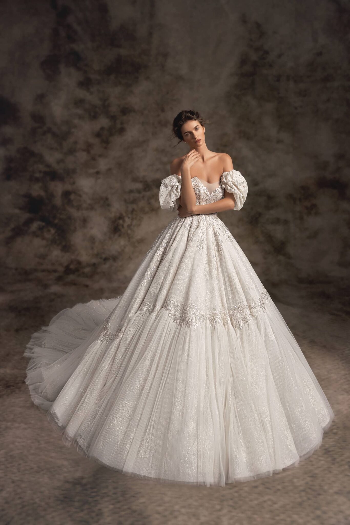 Notte d'OperaTwo-toned glitter fabric adorned with royal floral embroidery creates a true princess-inspired ballgown. Deeply plunged pointed strapless corset with exposed boning is embellished with showstopping sheer balloon sleeves that are detachable. Scattered hand-embroidered floral appliques trickle down the voluminous full skirt that ends with an extra-long royal train.
