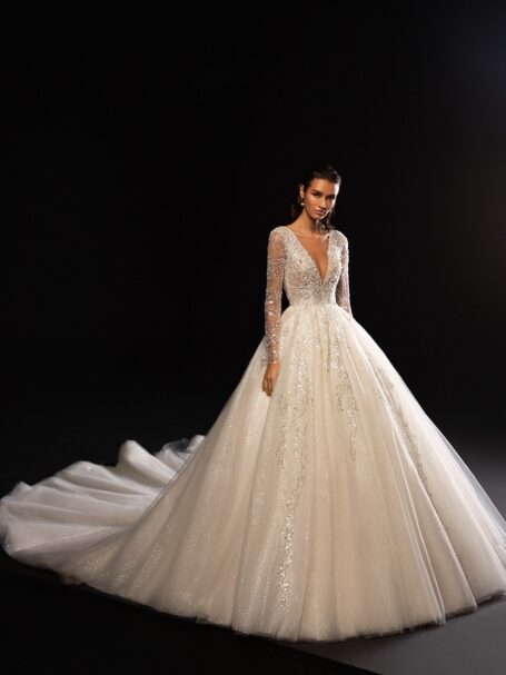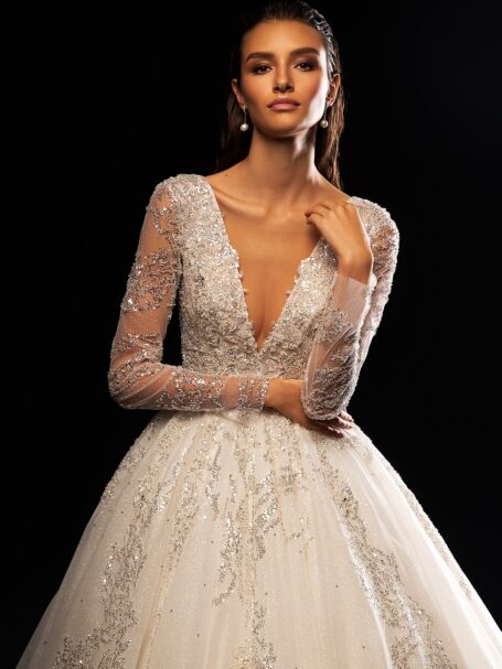 StardustKendall is a tender and feminine sheath wedding dress with spectacular lace sleeves. The wedding gown with a sweetheart neckline . Sleeves and the dress are made of unique lace and decorated with beads.