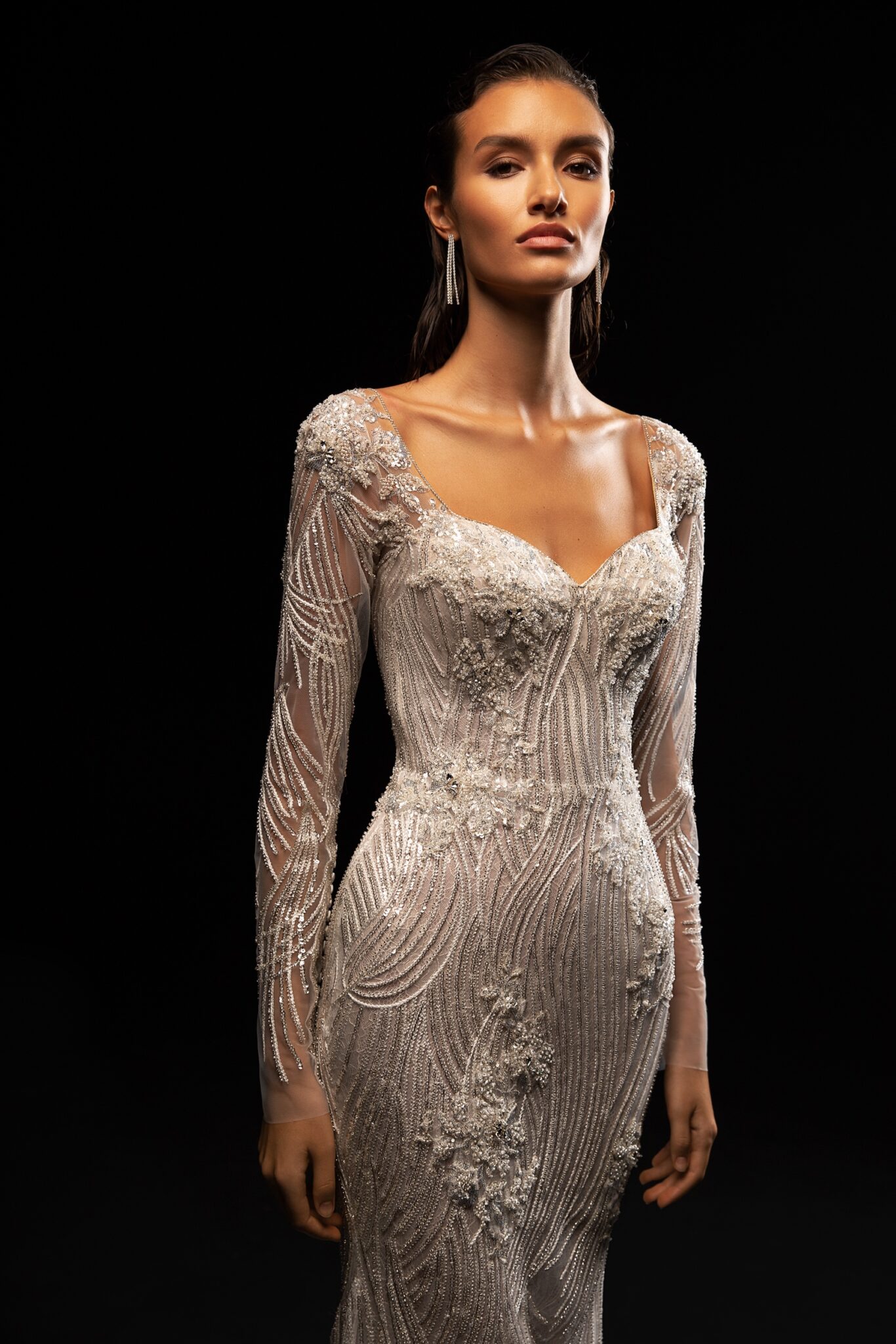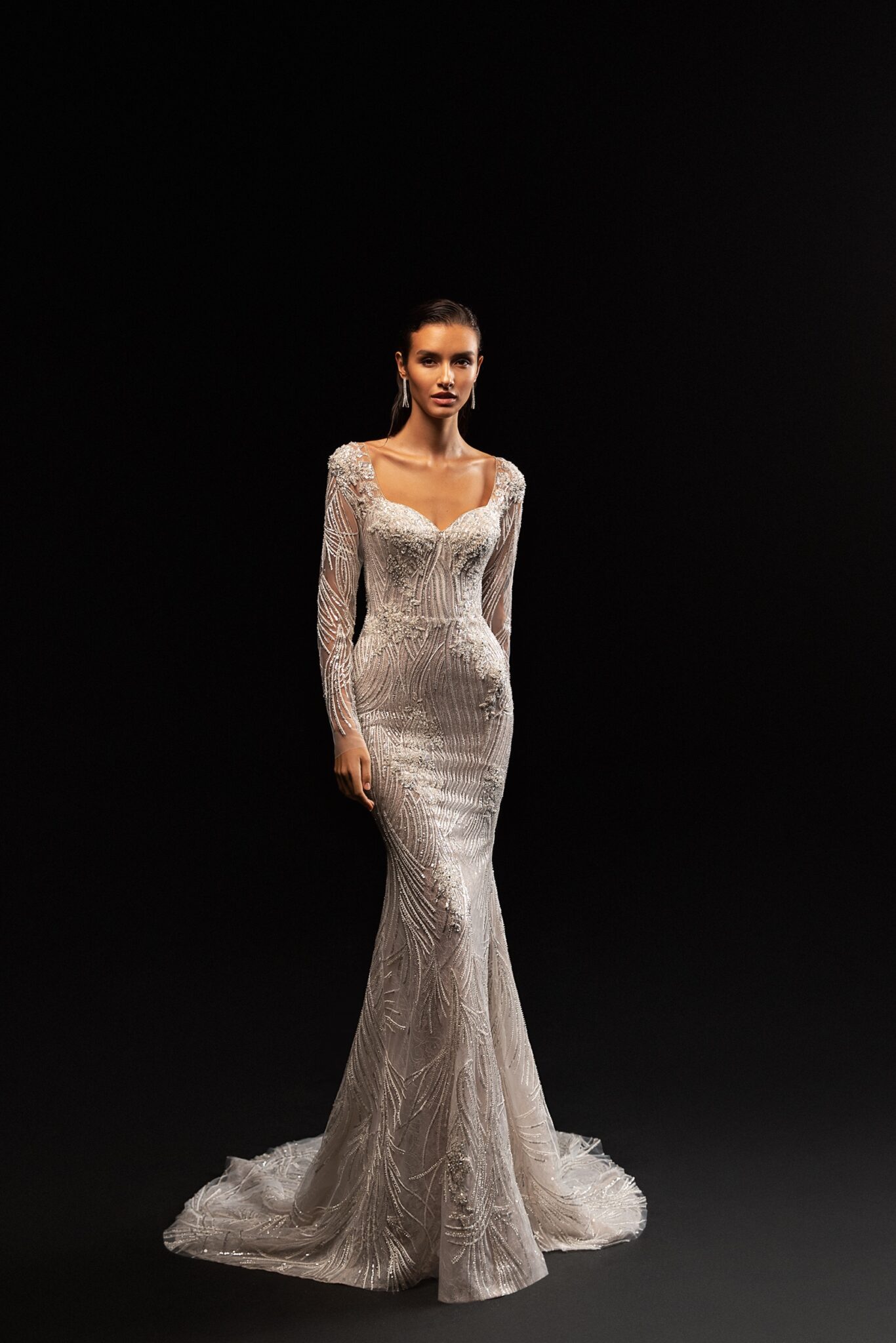 StardustKendall is a tender and feminine sheath wedding dress with spectacular lace sleeves. The wedding gown with a sweetheart neckline . Sleeves and the dress are made of unique lace and decorated with beads.