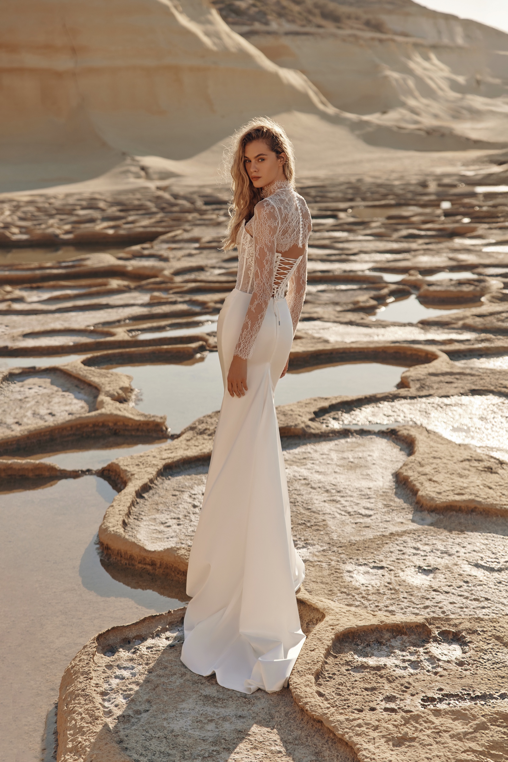 SirenityKilian gown is a stunning mermaid silhouette designed to highlight the bride’s figure. The skirt is crafted from smooth satin, flowing gracefully into a subtle train, while the corset bodice is made of delicate lace with intricate detailing.